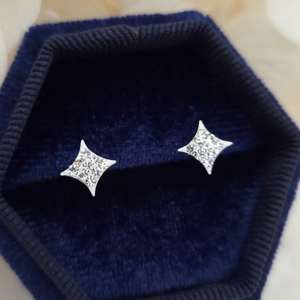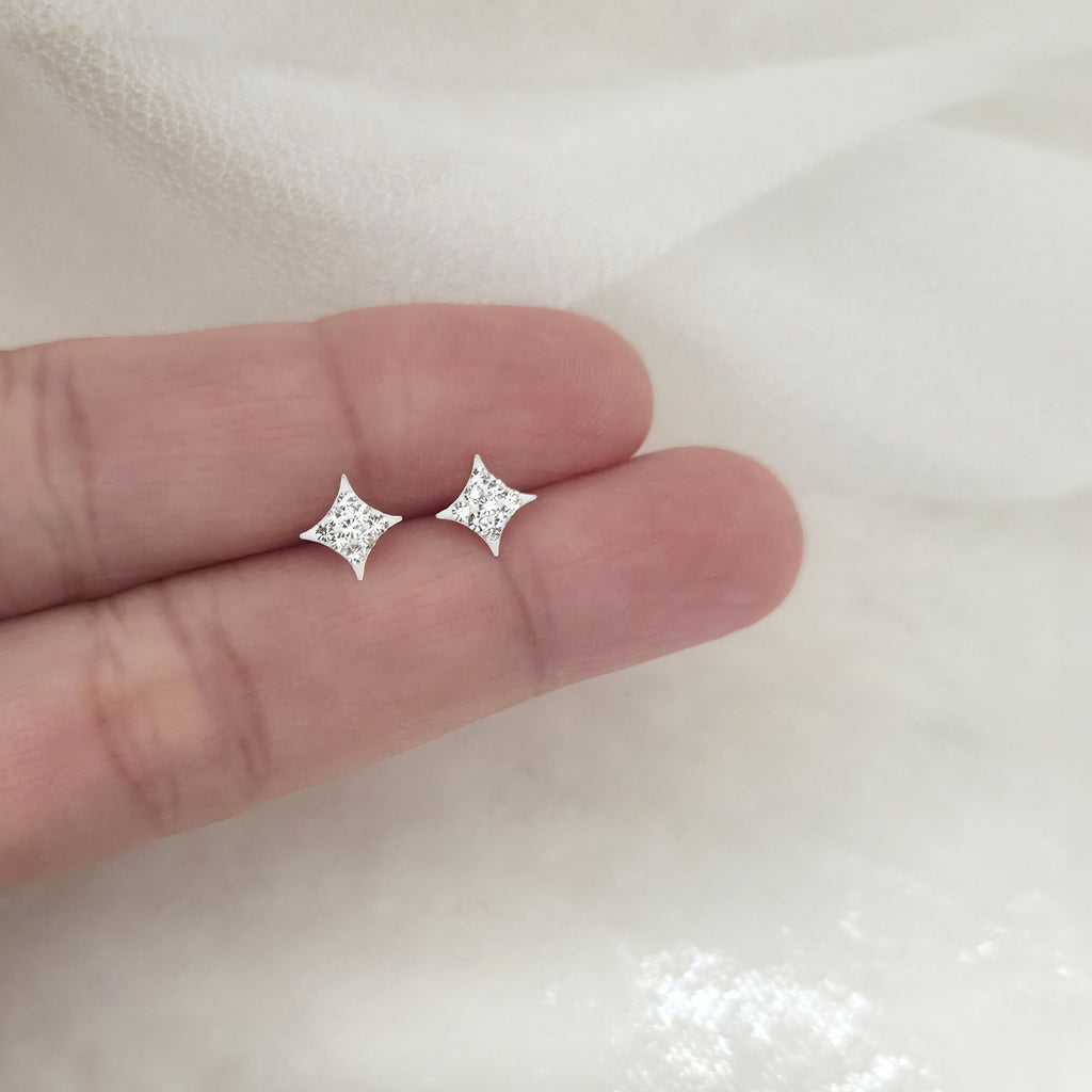 Mini 925 Sterling Silver Diamond-Shaped Stud Earrings – Small Geometric Studs with White Crystals