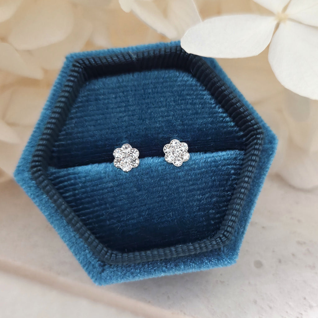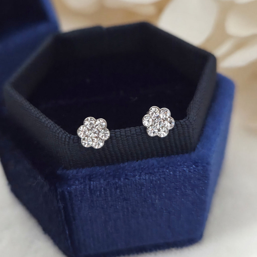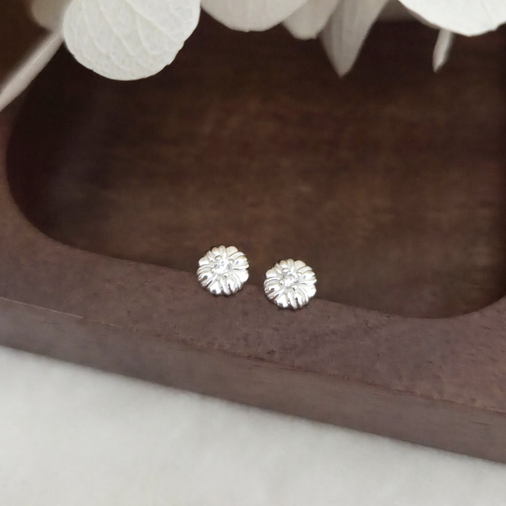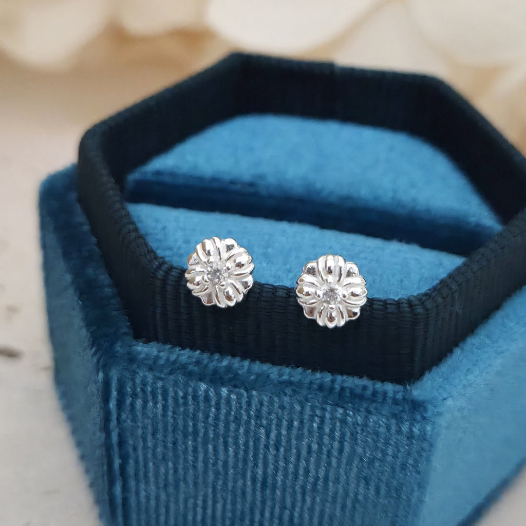 Tiny 925 Sterling Silver Flower Stud Earrings – Flower Studs in Solid Silver with White CZ Cubic Zirconia