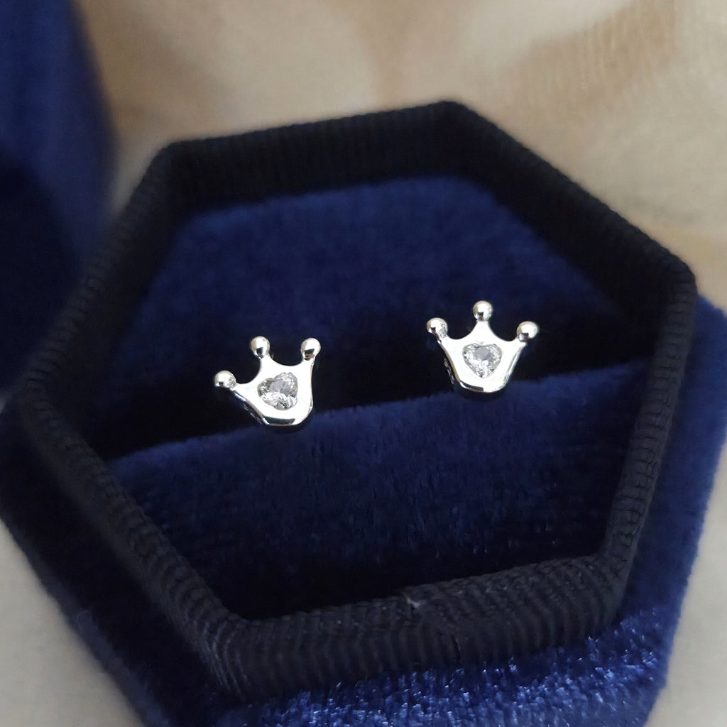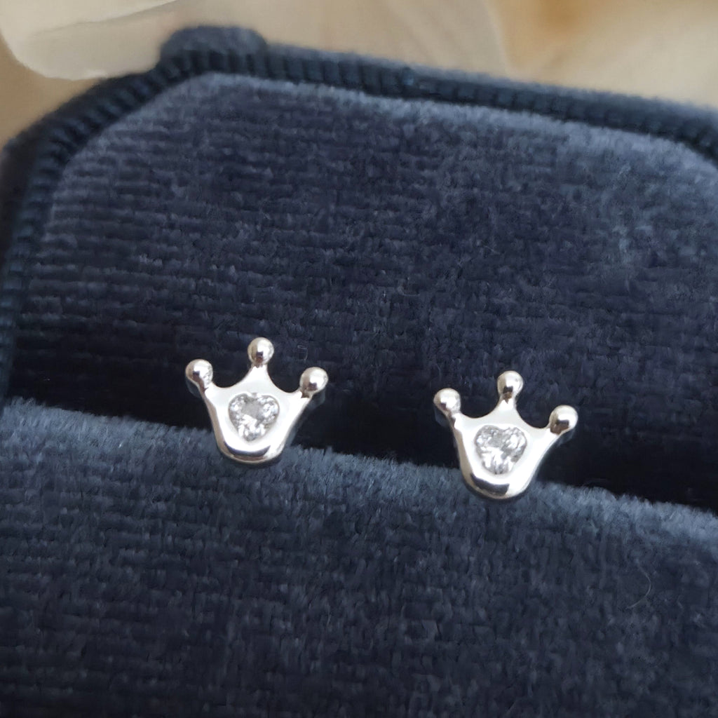 Tiny 925 Sterling Silver Crown Stud Earrings – Heart & Crown Studs in Solid Silver with White CZ Cubic Zirconia – Royal Jewelry Gift