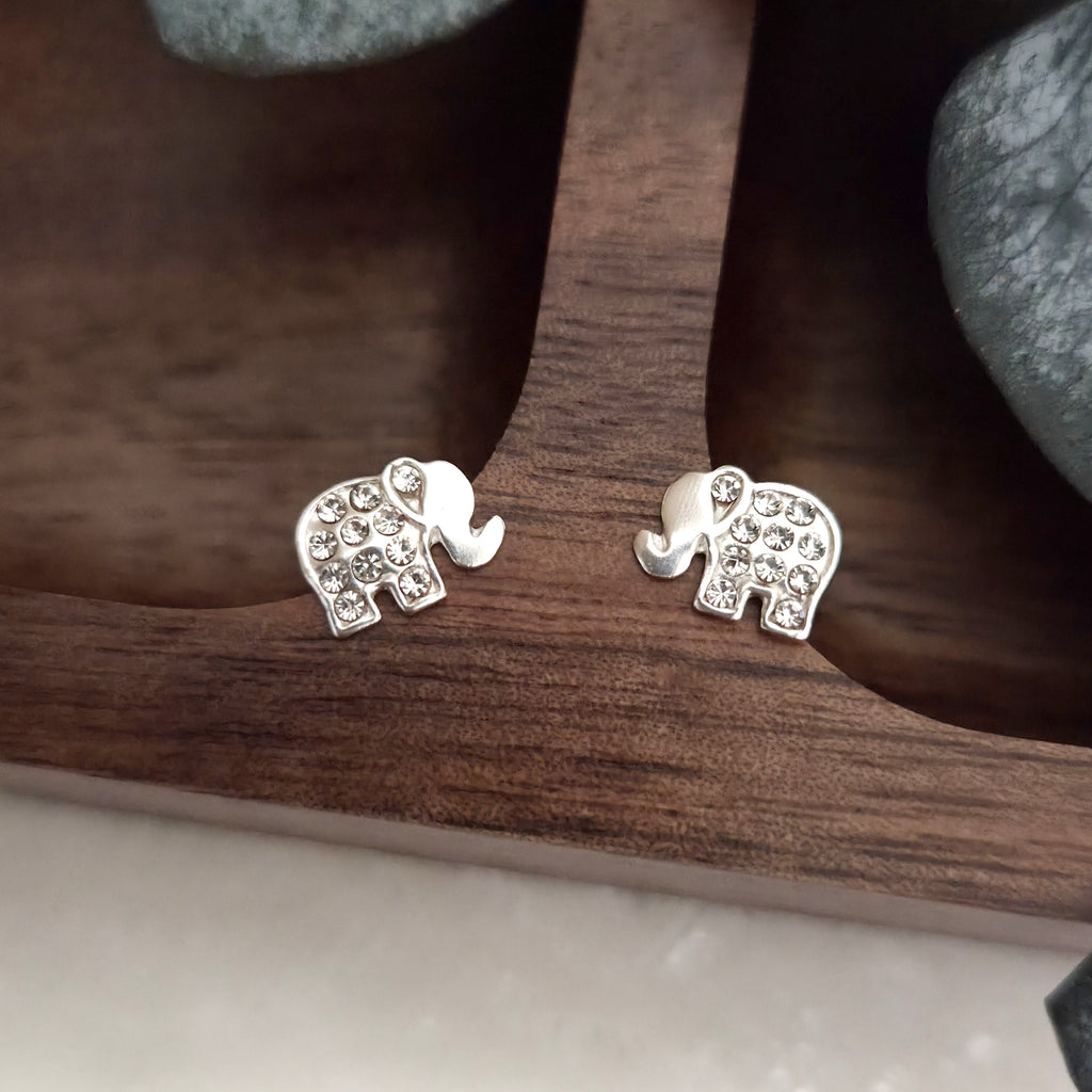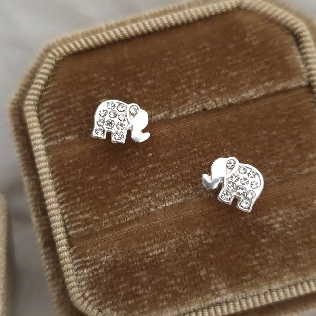 925 Sterling Silver Elephant Stud Earrings – Cute Elephant Studs in Solid Silver with White Crystals – Animal Earrings