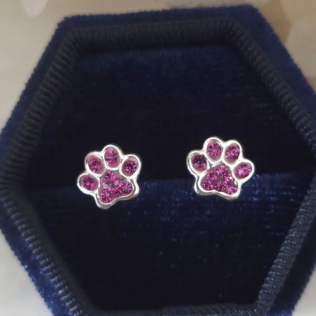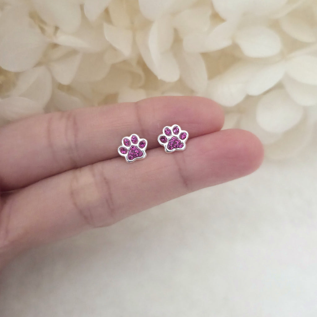 925 Sterling Silver Paw Print Stud Earrings – Dog Paw Studs in Solid Silver with Pink Fuchsia Crystal – Cute Pet Jewelry Gift for Her