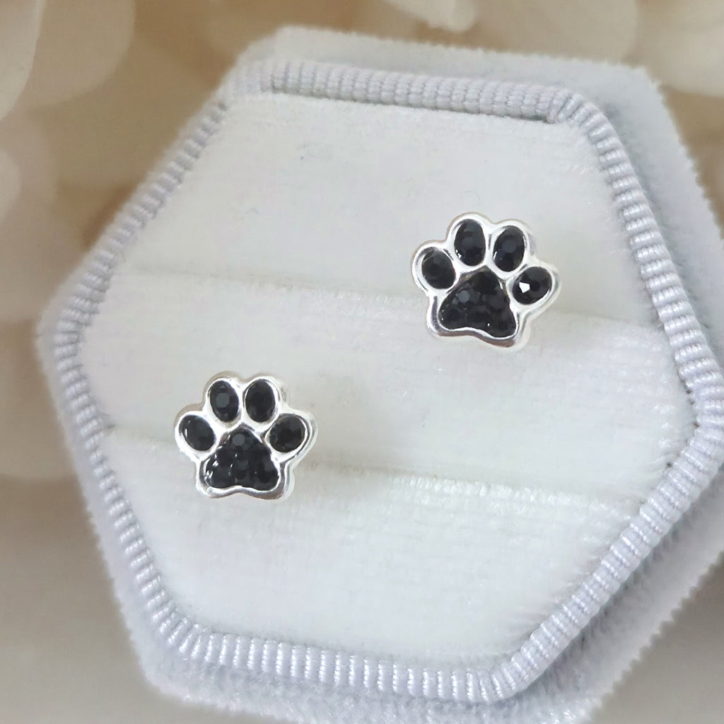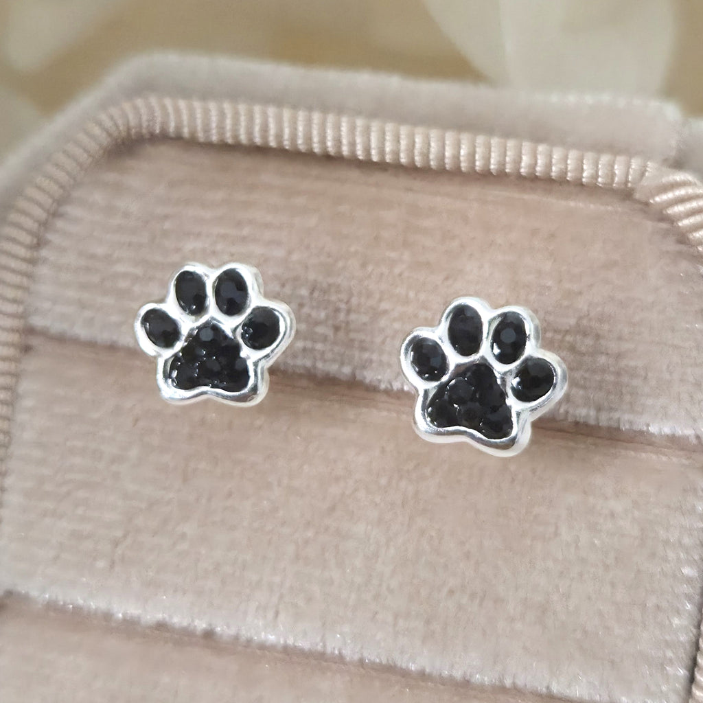 925 Sterling Silver Paw Print Stud Earrings – Black Dog Paw Studs in Solid Silver with Jet Crystal – Cute Pet Jewelry Gift for Her