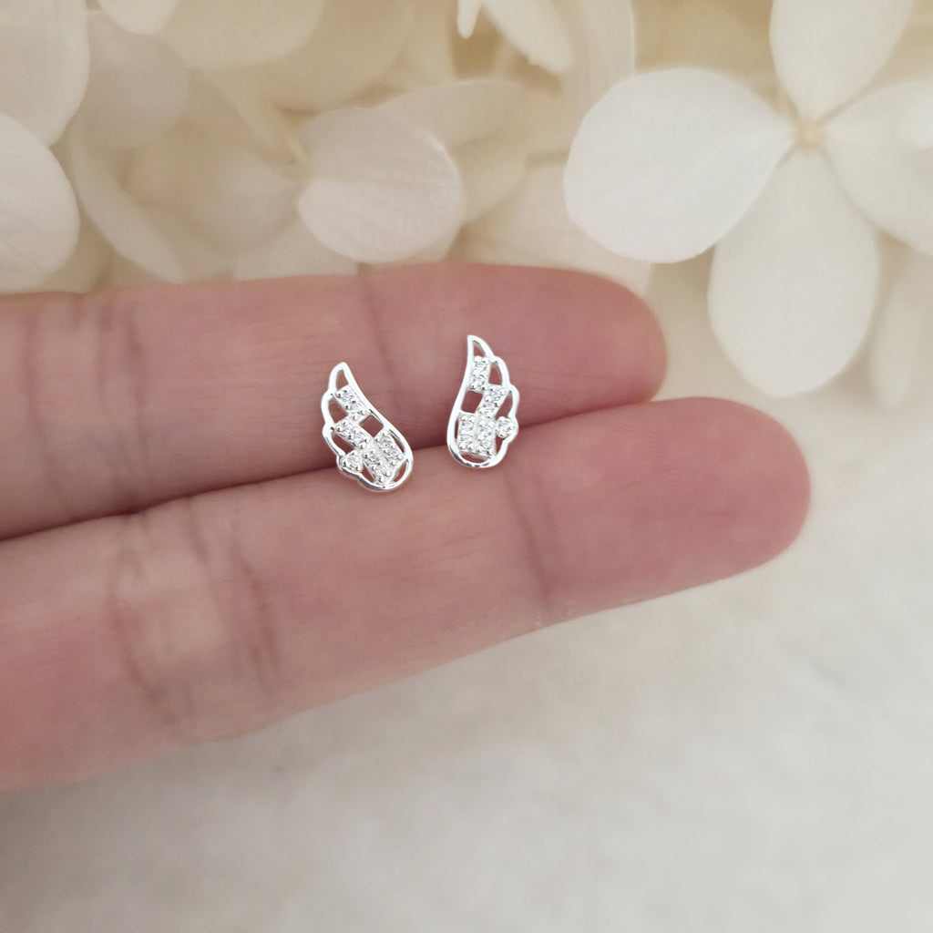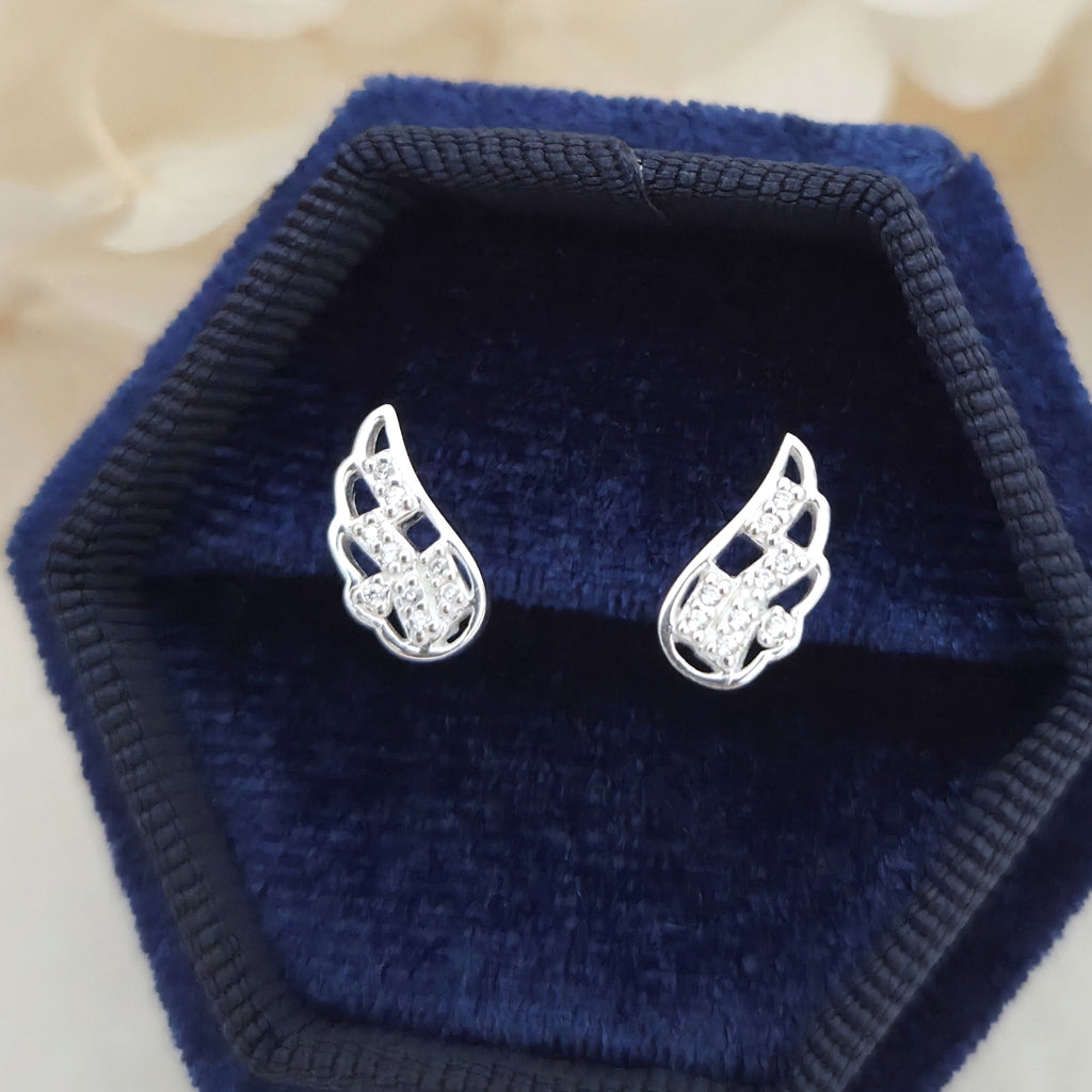 925 Sterling Silver Angel Wing Stud Earrings – Solid Silver Wing Studs with White Cubic Zirconia – Dainty Gift for Her