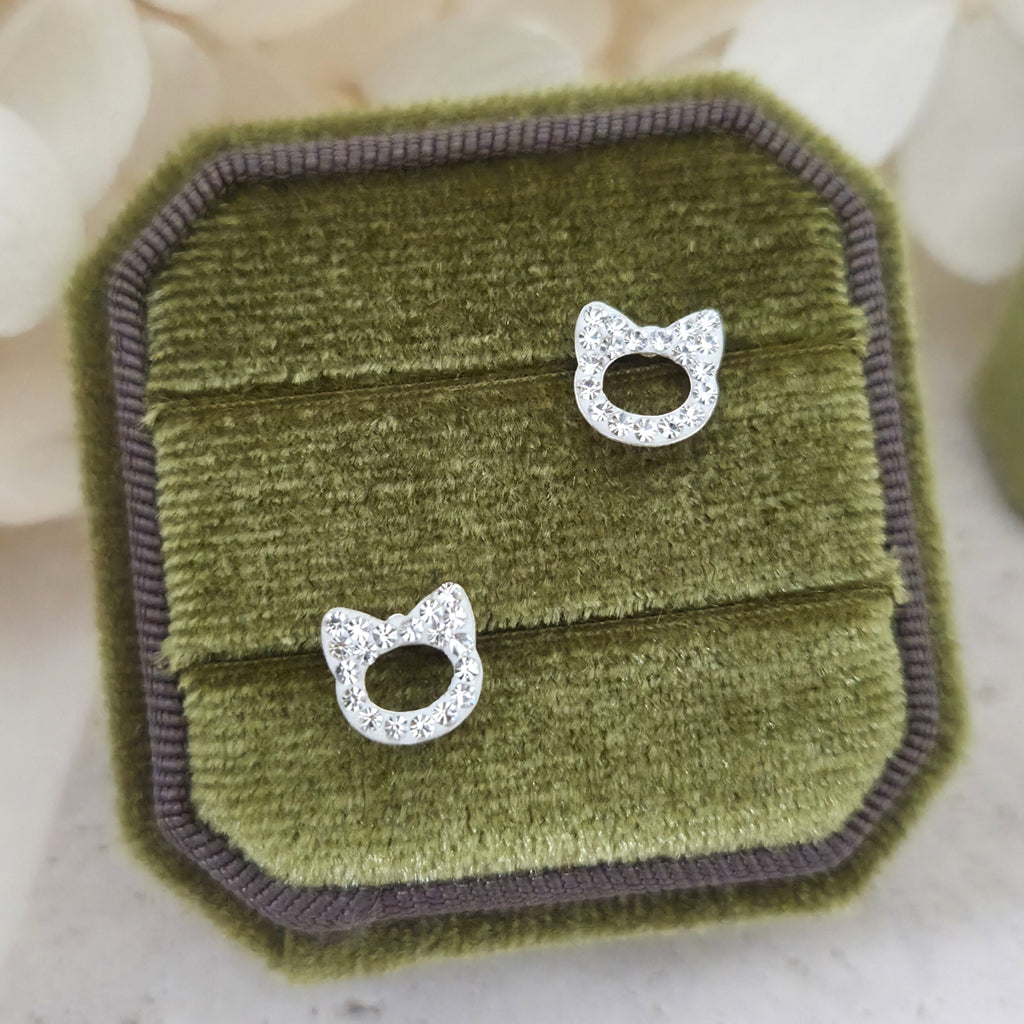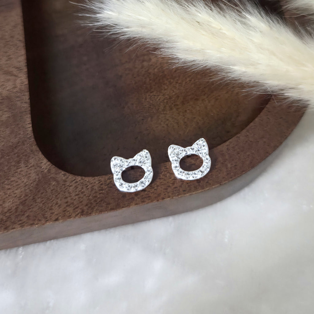 925 Sterling Silver White Cat Stud Earrings – Cute Cat Face Studs with Sparkling White Crystals – Silver Pet Earrings