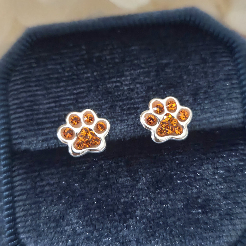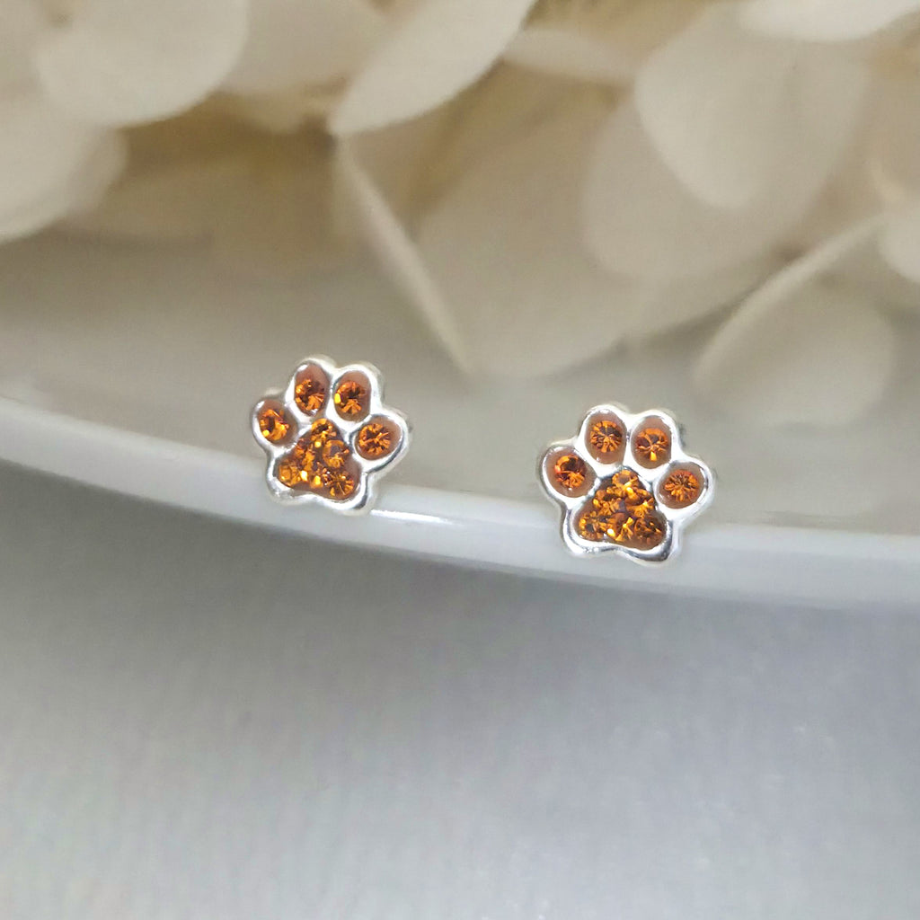 925 Sterling Silver Dog Paw Print Stud Earrings – Orange Paw Studs in Solid Silver with Sun Crystal – Cute Animal Jewelry Gift for Her
