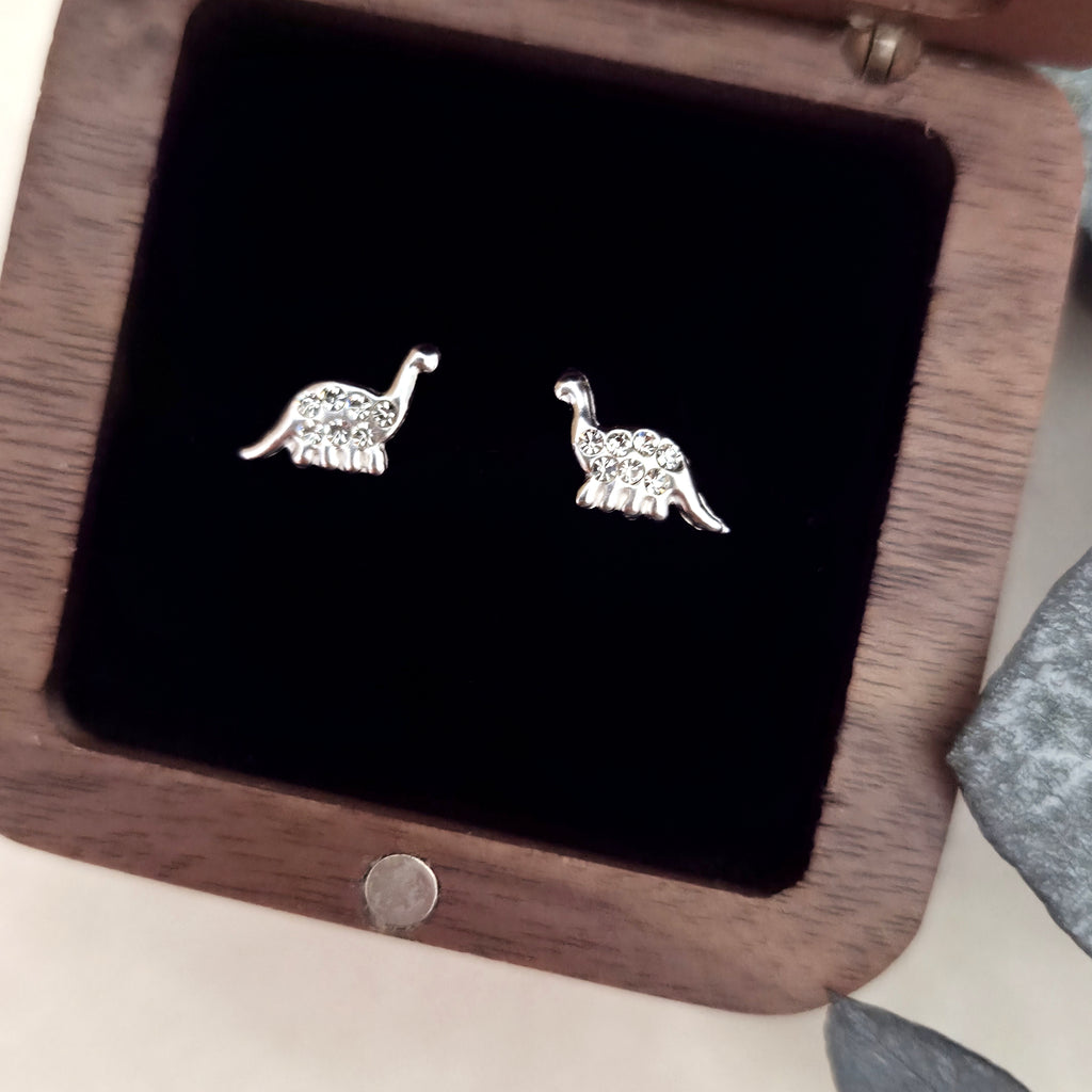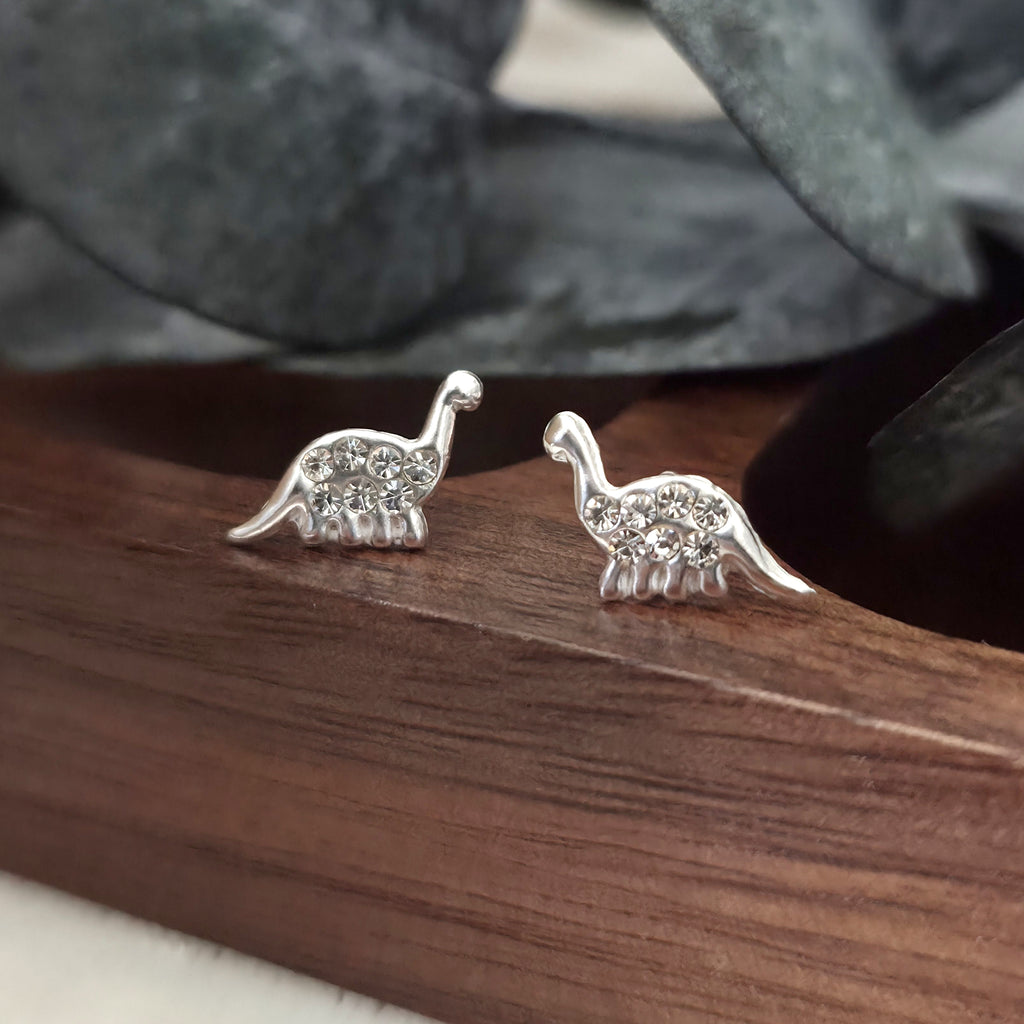 925 Sterling Silver Brachiosaurus Dinosaur Stud Earrings – Cute Dino Studs in Solid Silver with White Crystals – Animal Earrings