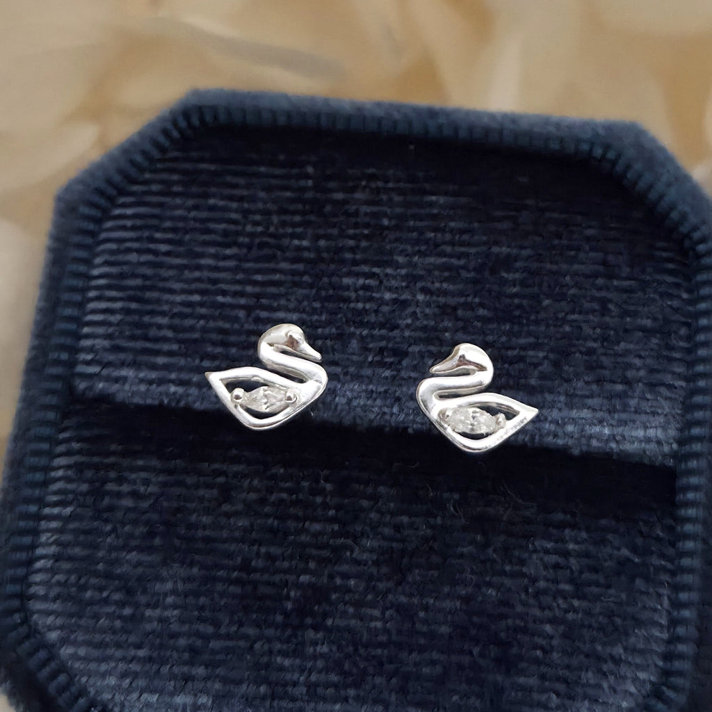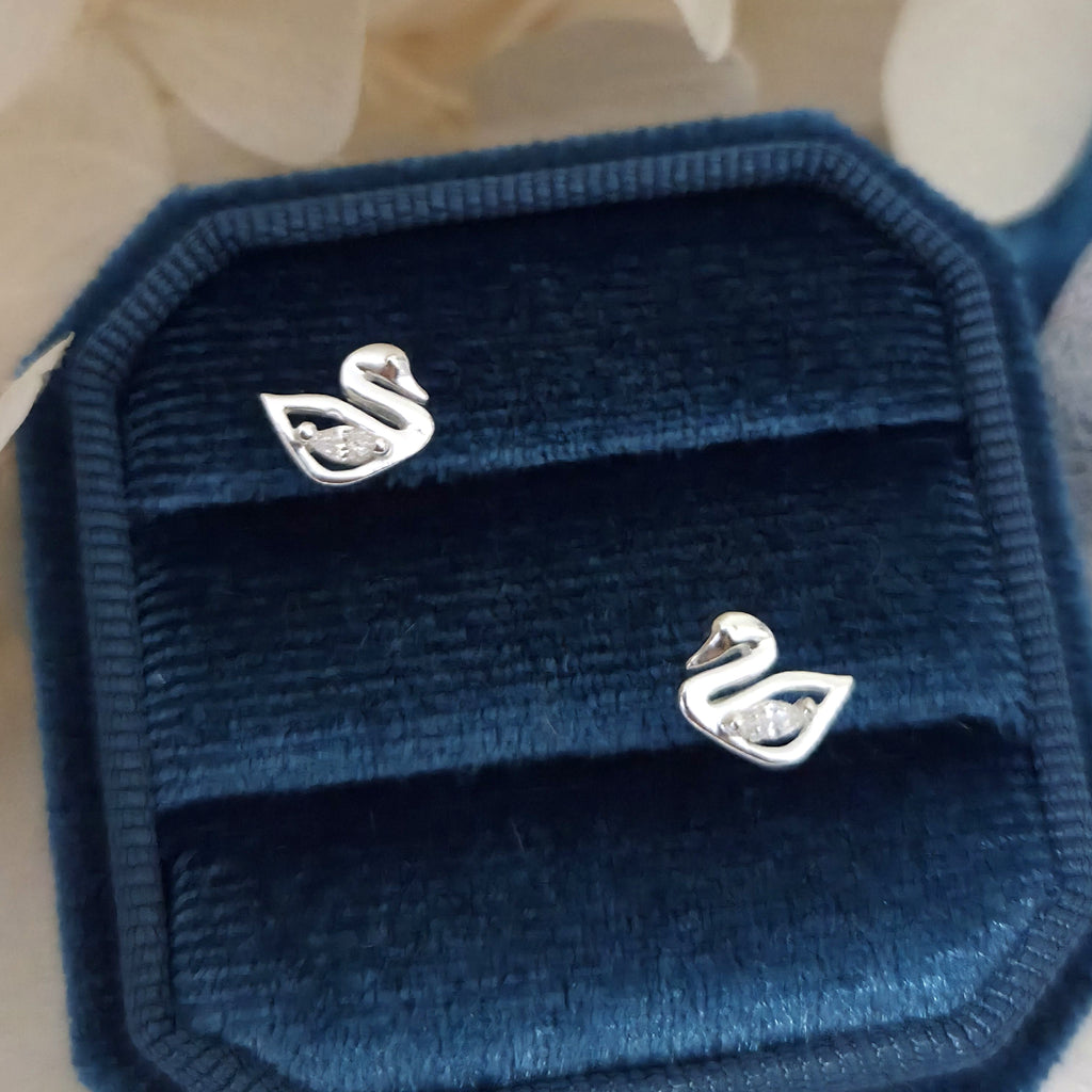 925 Sterling Silver Swan Stud Earrings – Swan Studs in Solid Silver with White CZ Cubic Zirconia – Bird Jewelry