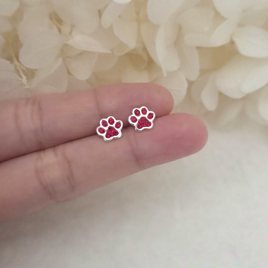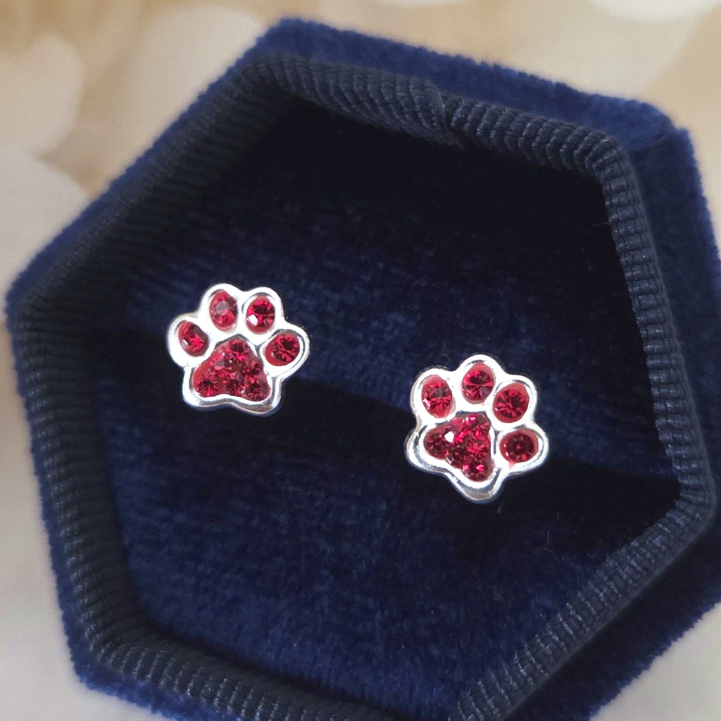 925 Sterling Silver Dog Paw Print Stud Earrings – Red Paw Studs in Solid Silver with Light Siam Red Crystal – Pet Jewelry Gift for Her
