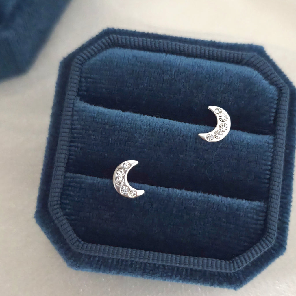 Small 925 Sterling Silver Moon Stud Earrings – Crescent Moon Studs with White Crystals in Solid Silver