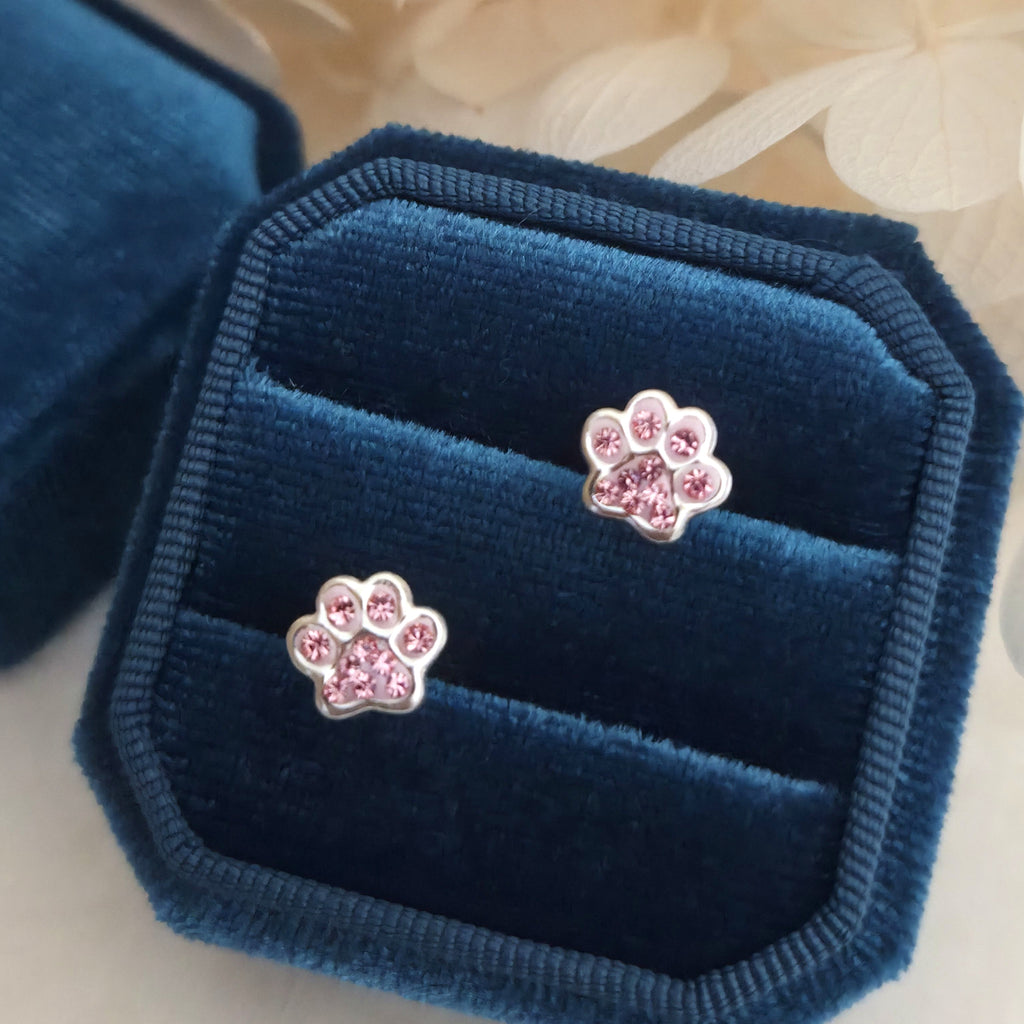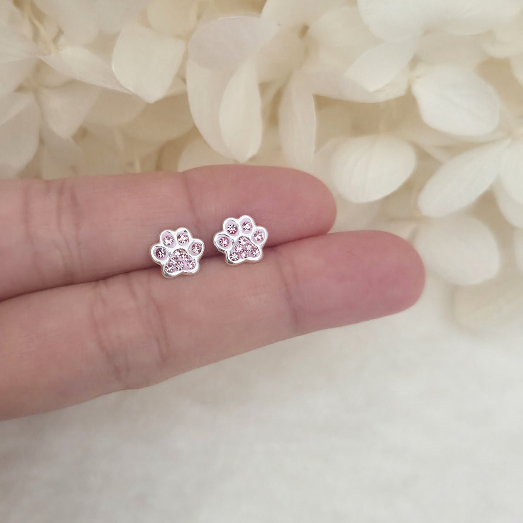 925 Sterling Silver Paw Print Stud Earrings – Pink Dog Paw Studs in Solid Silver with Light Pink Crystal – Cute Pet Jewelry Gift for Her