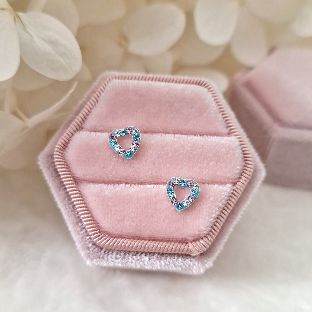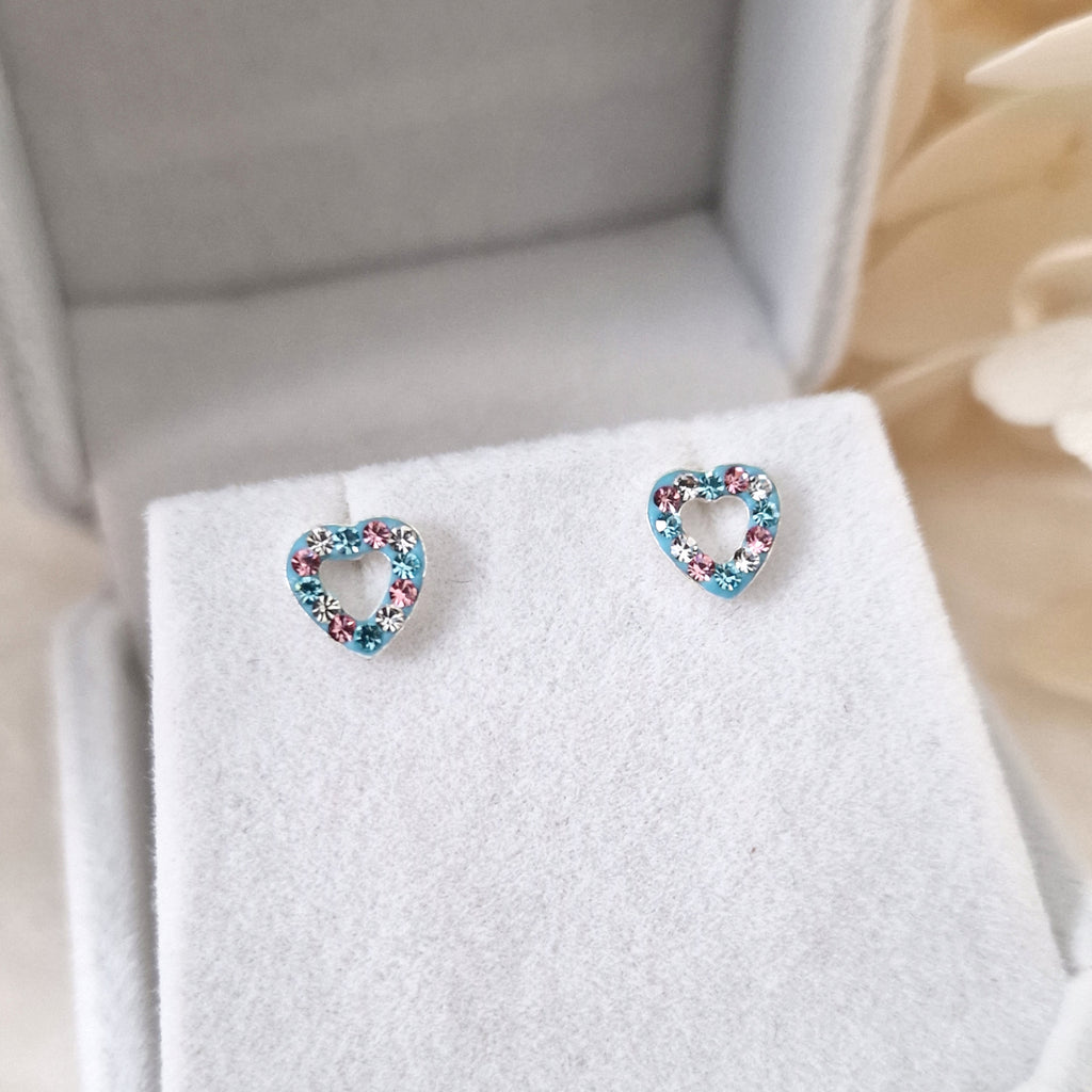 Add a pop of color and charm to your look with these blue heart stud earrings, crafted in genuine 925 sterling silver and set with sparkling blue, pink, and white crystals. The open-heart design gives them a light, delicate feel—perfect for everyday wear, special occasions, or as a sweet gift for someone you love. Dainty, feminine, and easy to style, these studs are a playful twist on a classic heart shape.