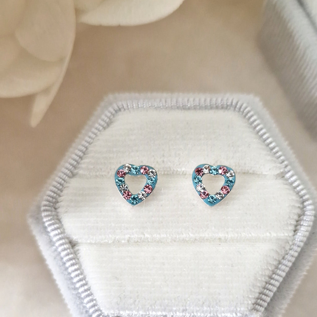 925 Sterling Silver Blue Heart Stud Earrings – Dainty Open-Heart Studs with Blue & Pink Colorful Crystals – Cute Gift for Her
