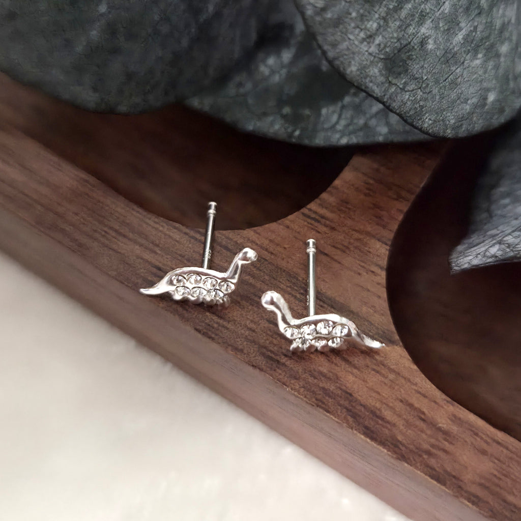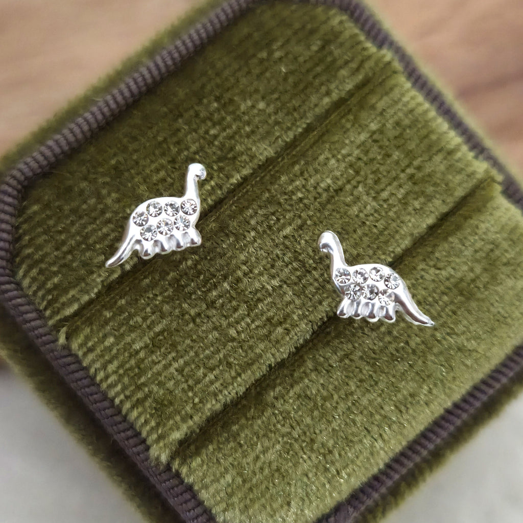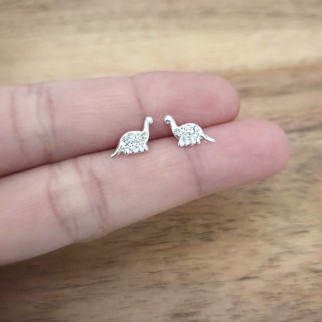 925 Sterling Silver Brachiosaurus Dinosaur Stud Earrings – Cute Dino Studs in Solid Silver with White Crystals – Animal Earrings