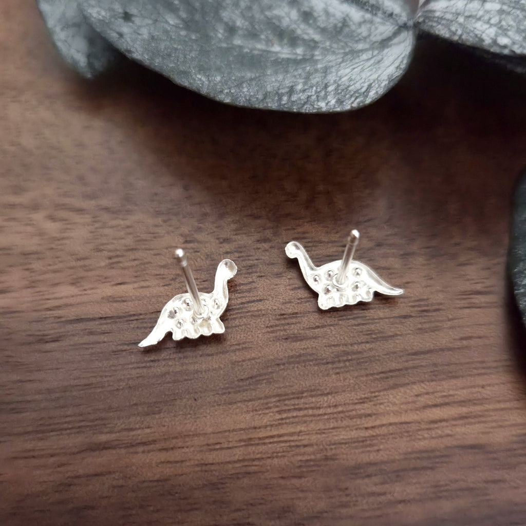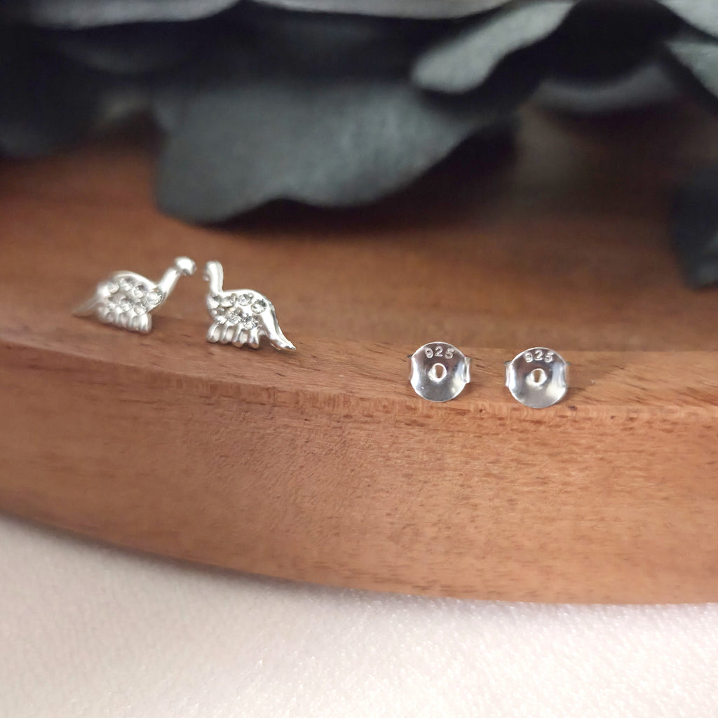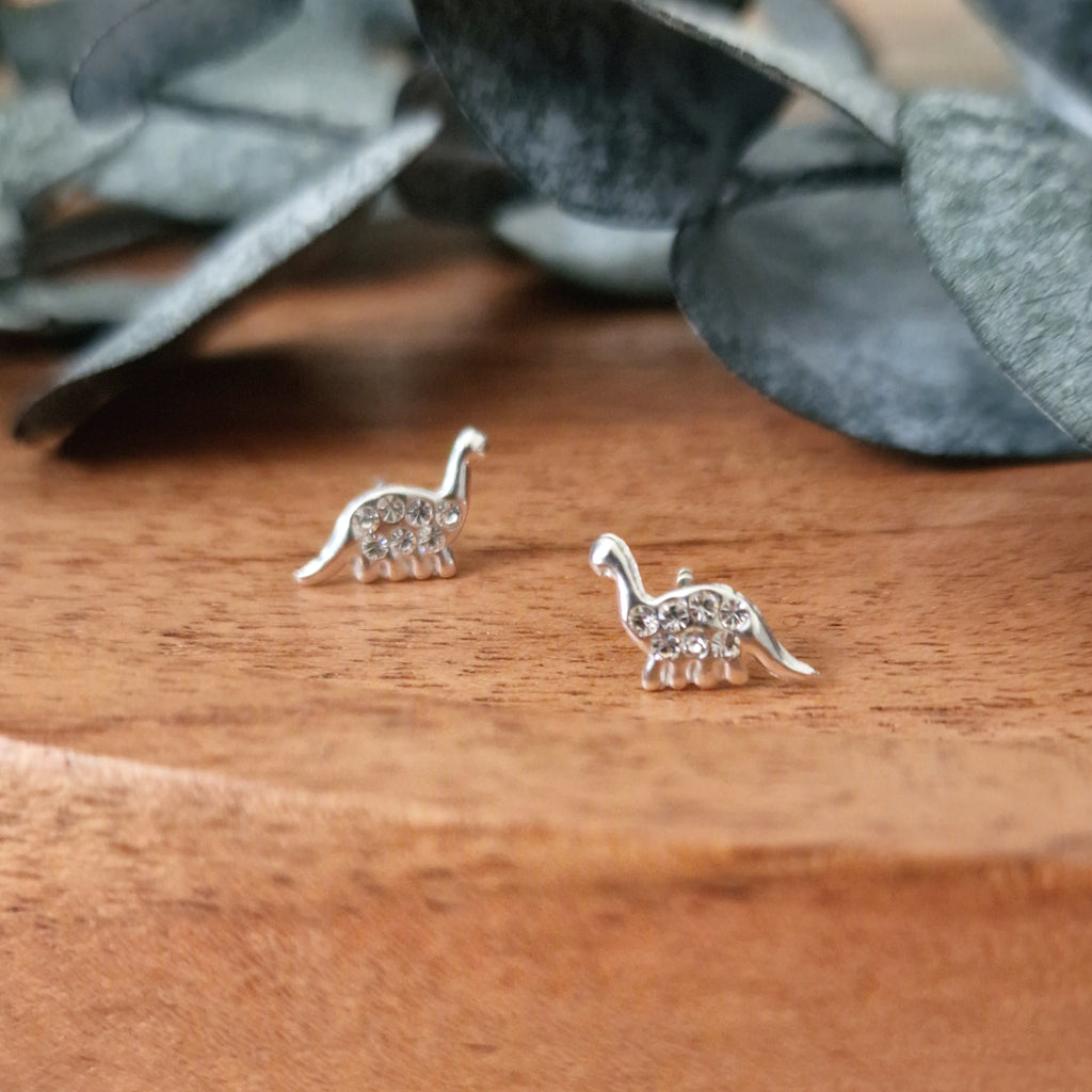 925 Sterling Silver Brachiosaurus Dinosaur Stud Earrings – Cute Dino Studs in Solid Silver with White Crystals – Animal Earrings