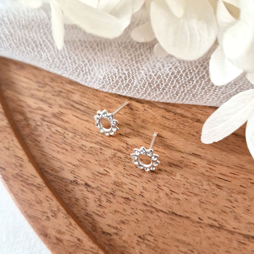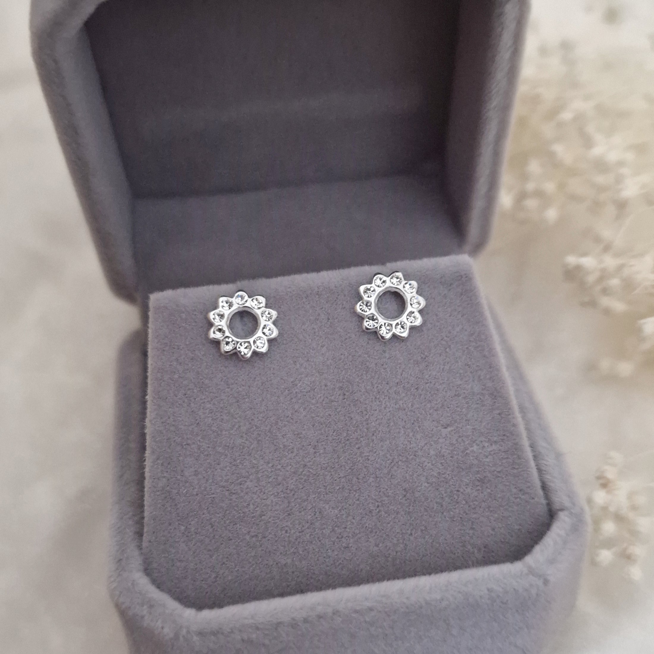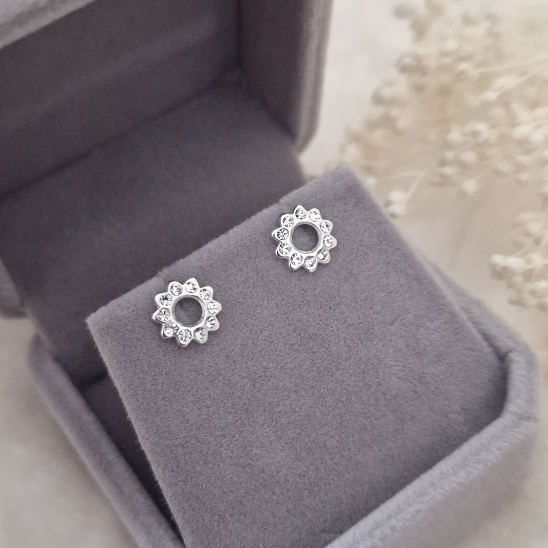 Elegant and eye-catching, these floral stud earrings are crafted from 925 sterling silver and adorned with sparkling crystals. The open petal design gives them a modern, airy feel while still offering a timeless floral charm.