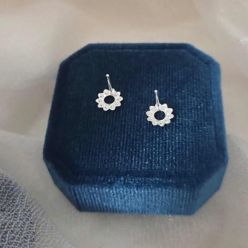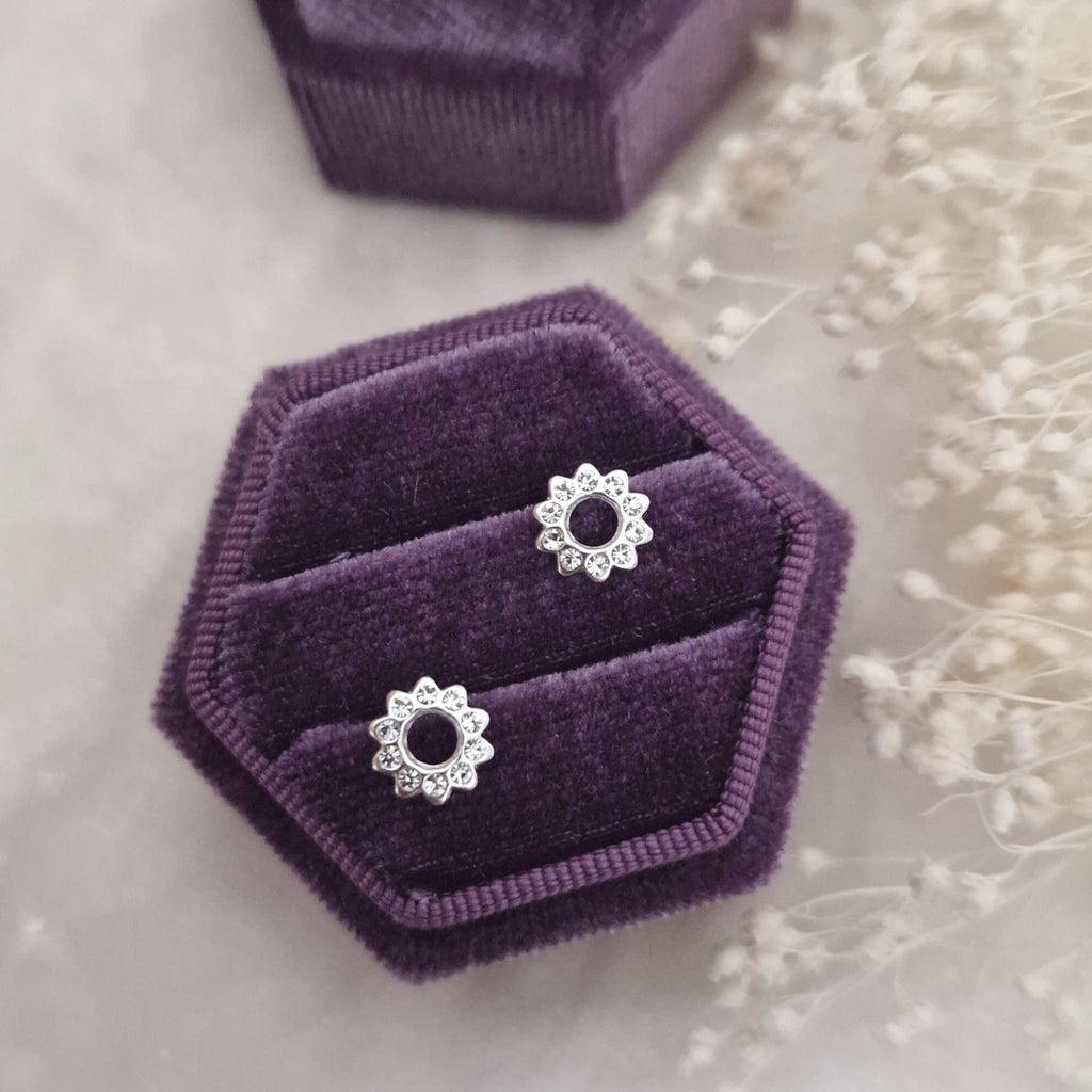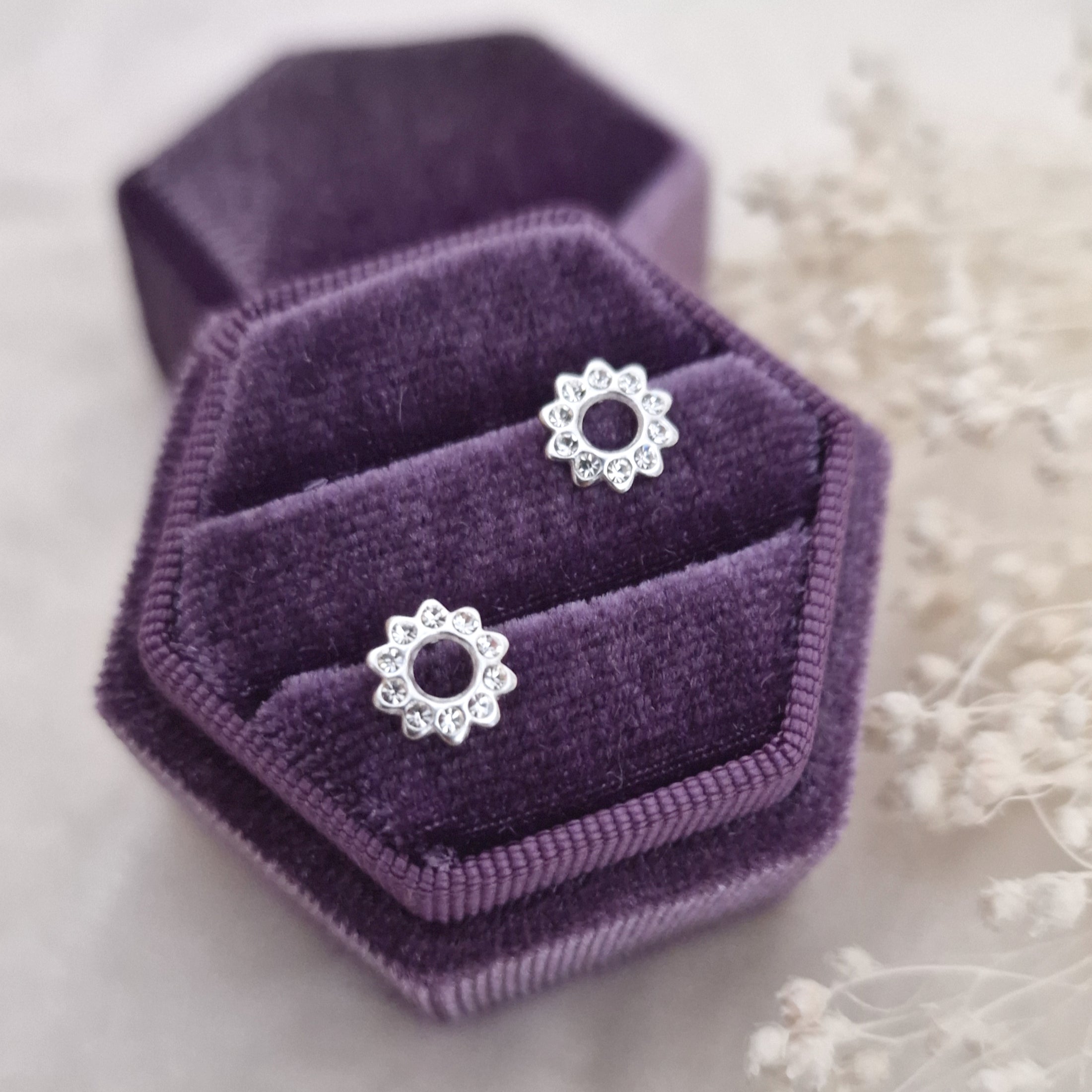 Elegant and eye-catching, these floral stud earrings are crafted from 925 sterling silver and adorned with sparkling crystals. The open petal design gives them a modern, airy feel while still offering a timeless floral charm.