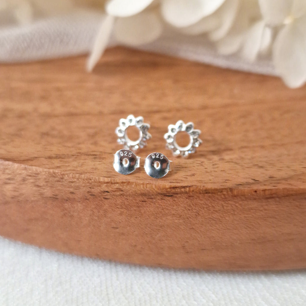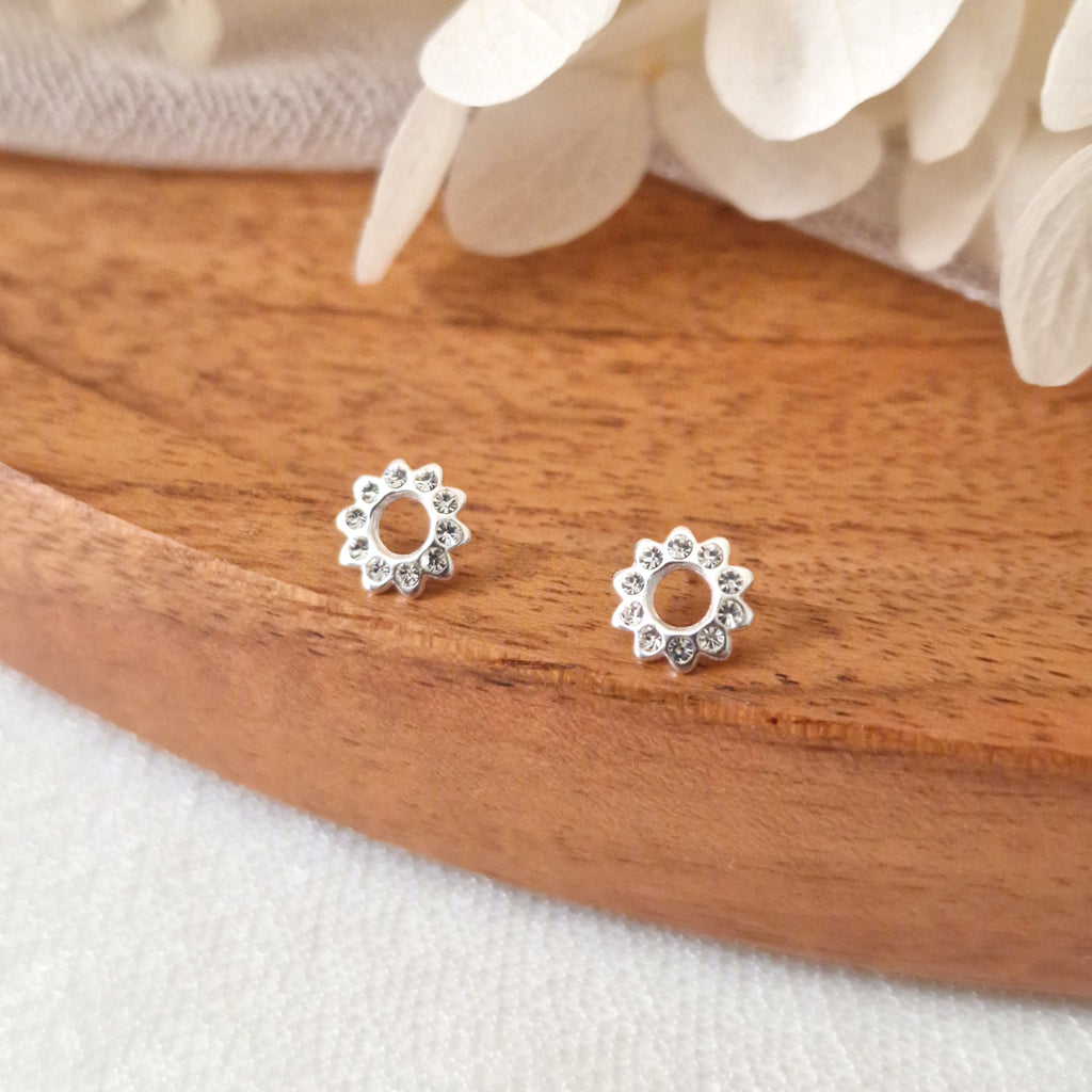 925 Sterling Silver Crystal Flower Stud Earrings – Dainty Open Petal Floral Studs – Minimalist Sparkling Jewelry