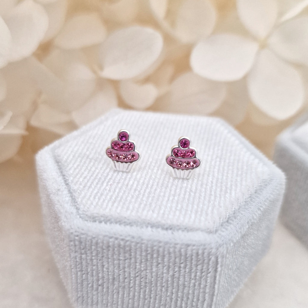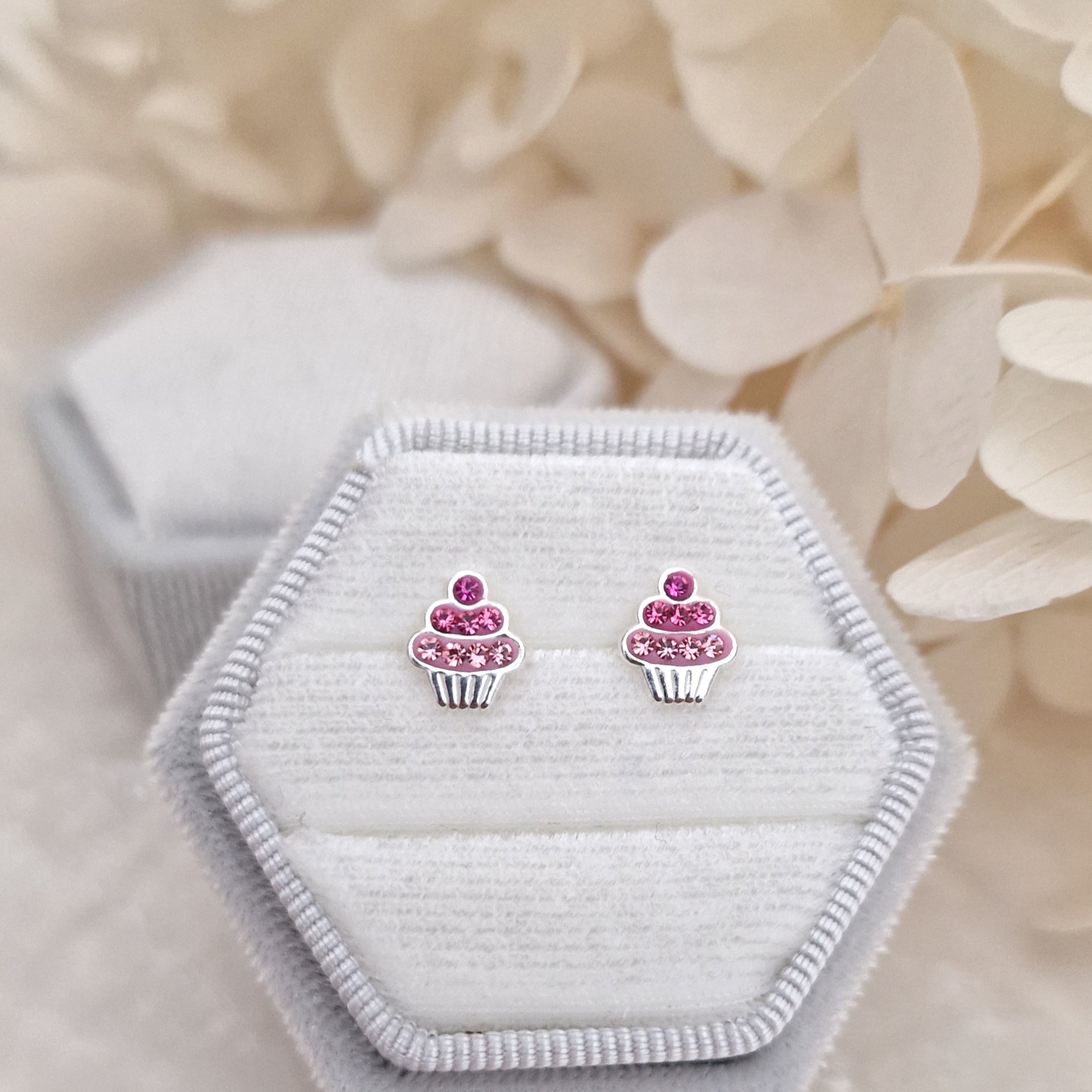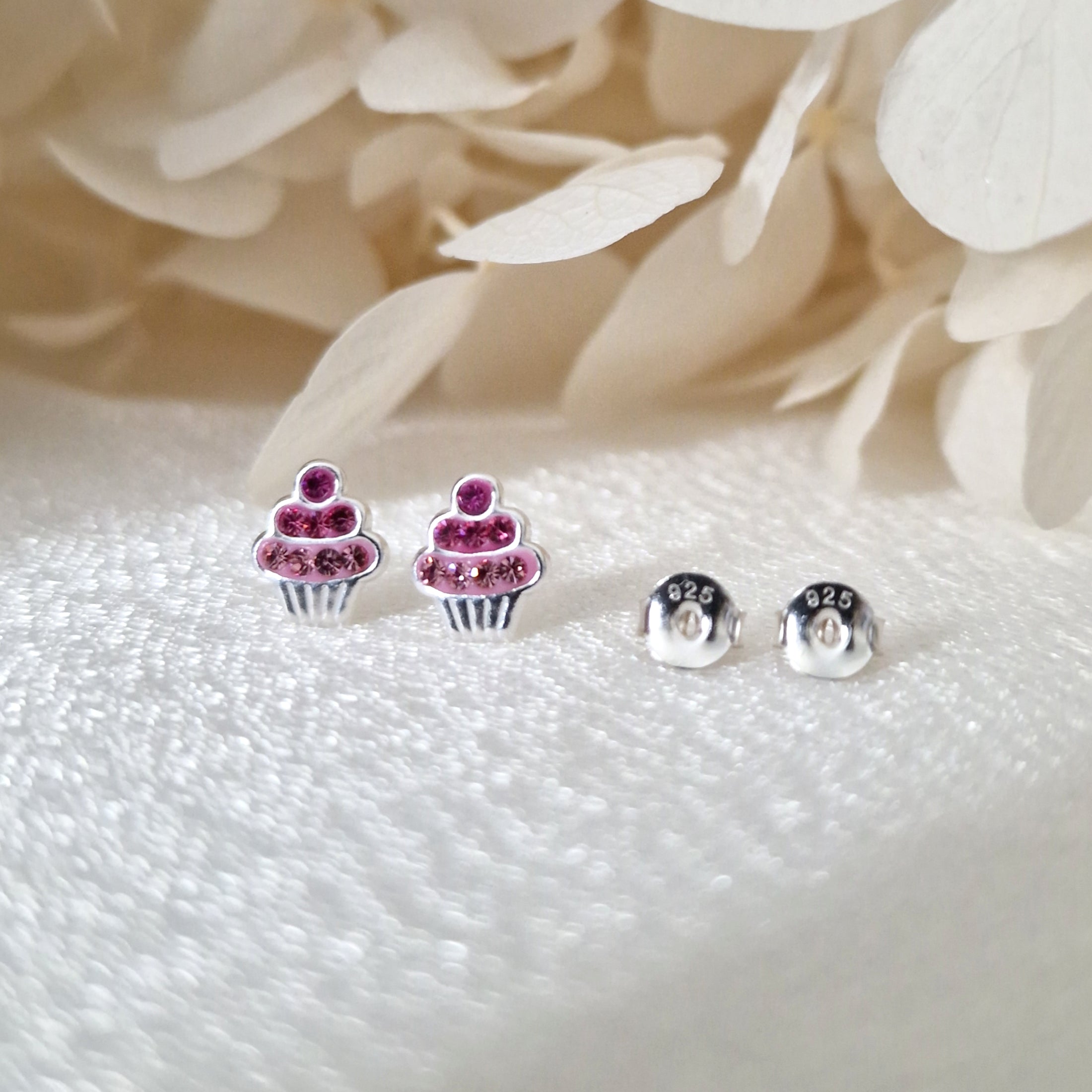 925 Sterling Silver Cupcake Stud Earrings – Solid Silver Cupcake Studs with Pink Crystals – Cute Pink Cake Earrings