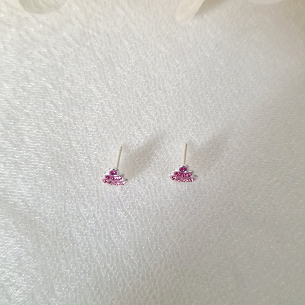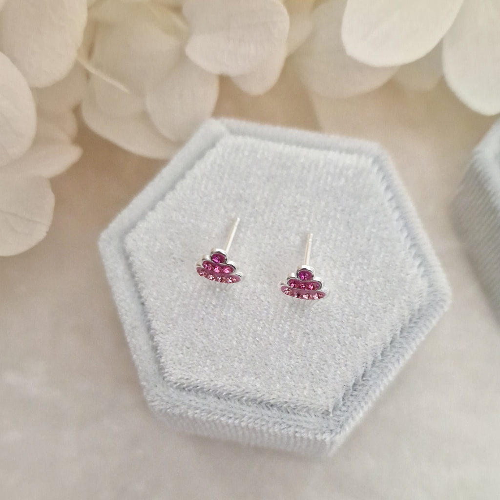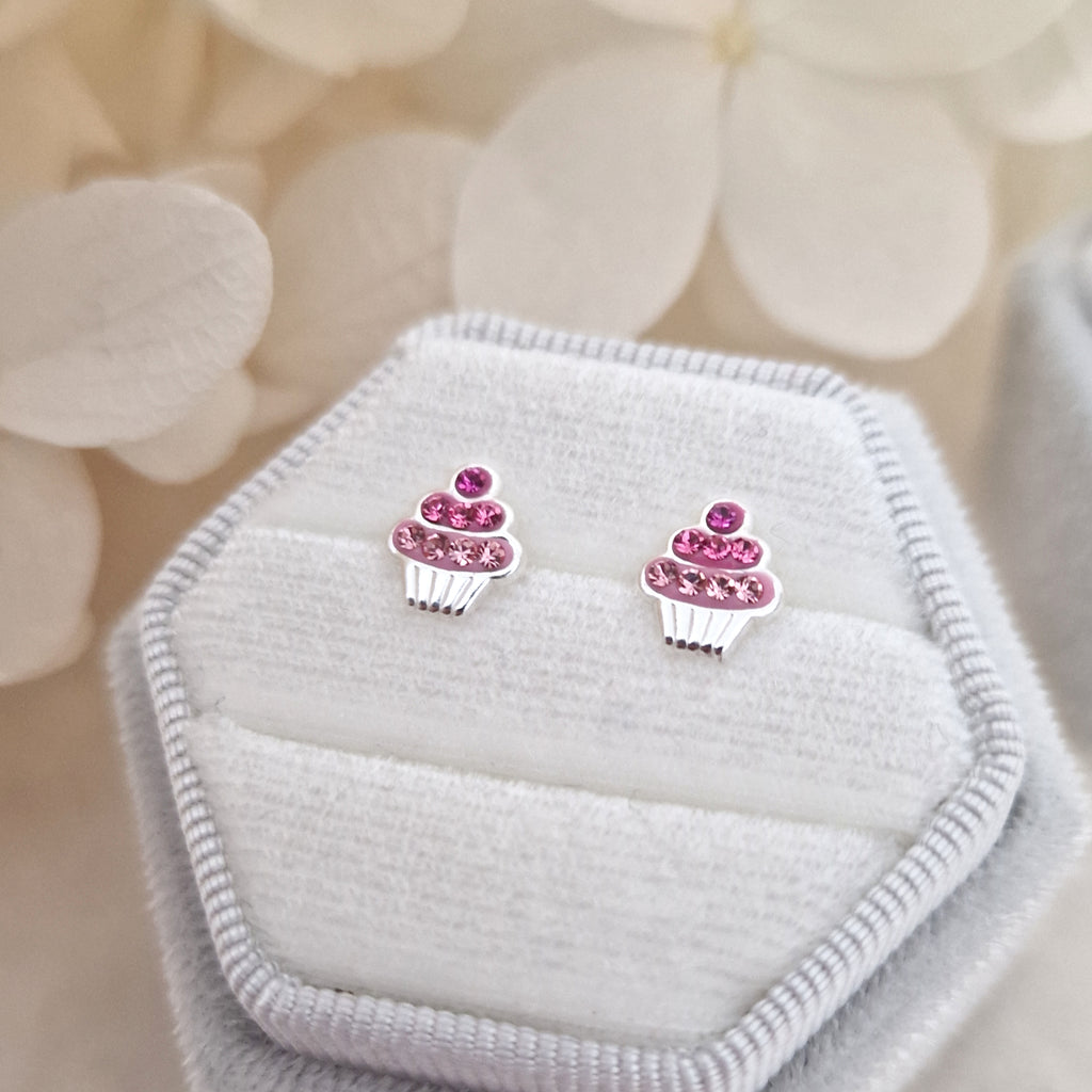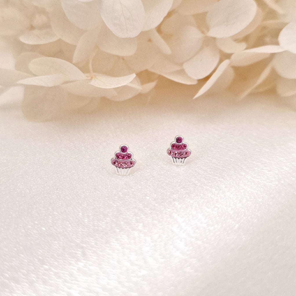 925 Sterling Silver Cupcake Stud Earrings – Solid Silver Cupcake Studs with Pink Crystals – Cute Pink Cake Earrings