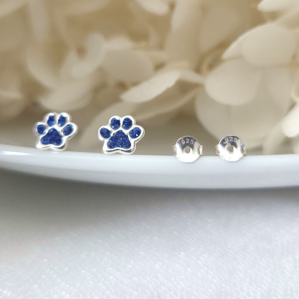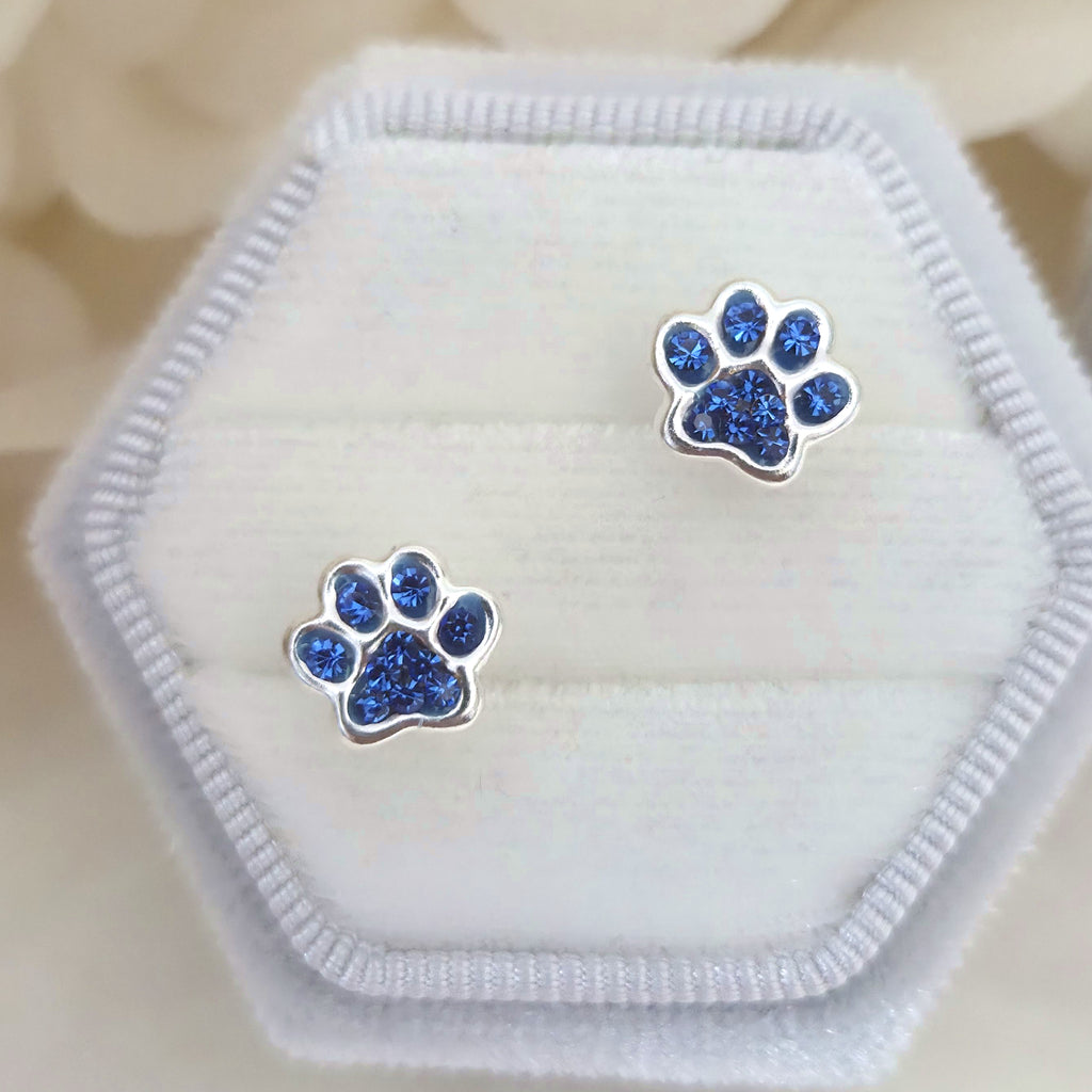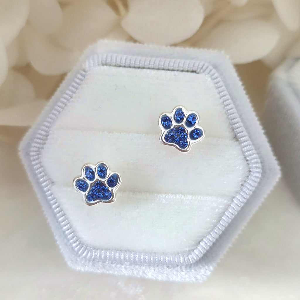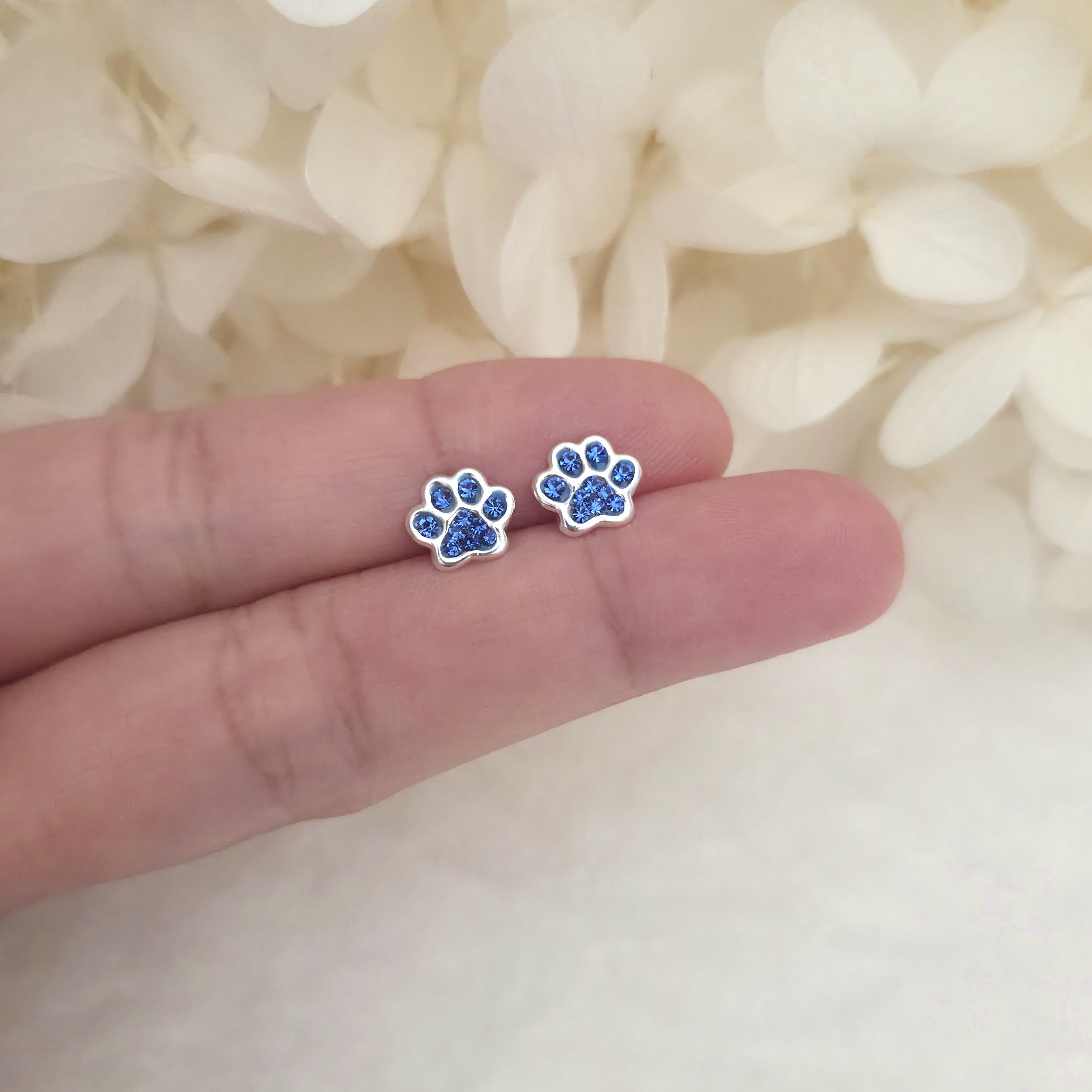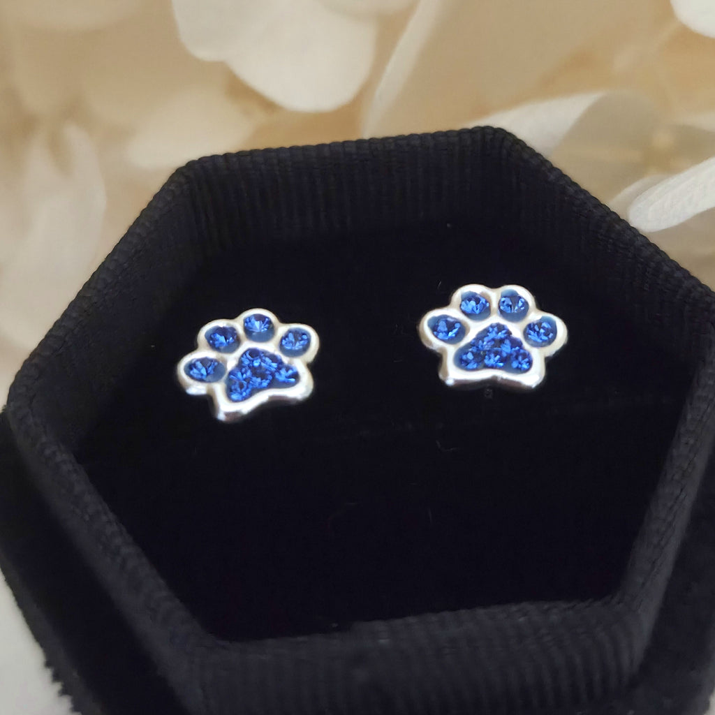 These 925 sterling silver dog paw print stud earrings shine with sapphire blue crystals. A perfect gift for pet lovers or fans of colorful animal-themed jewelry.