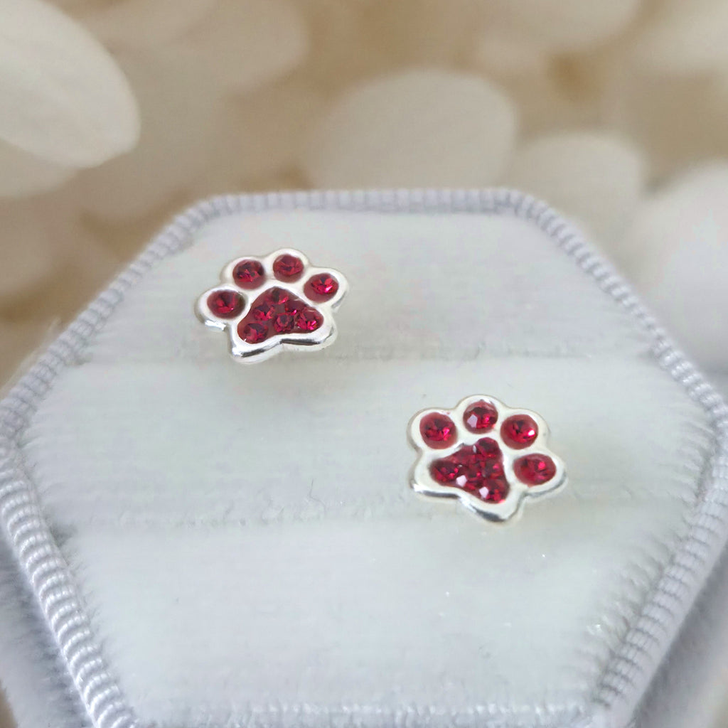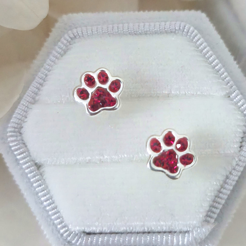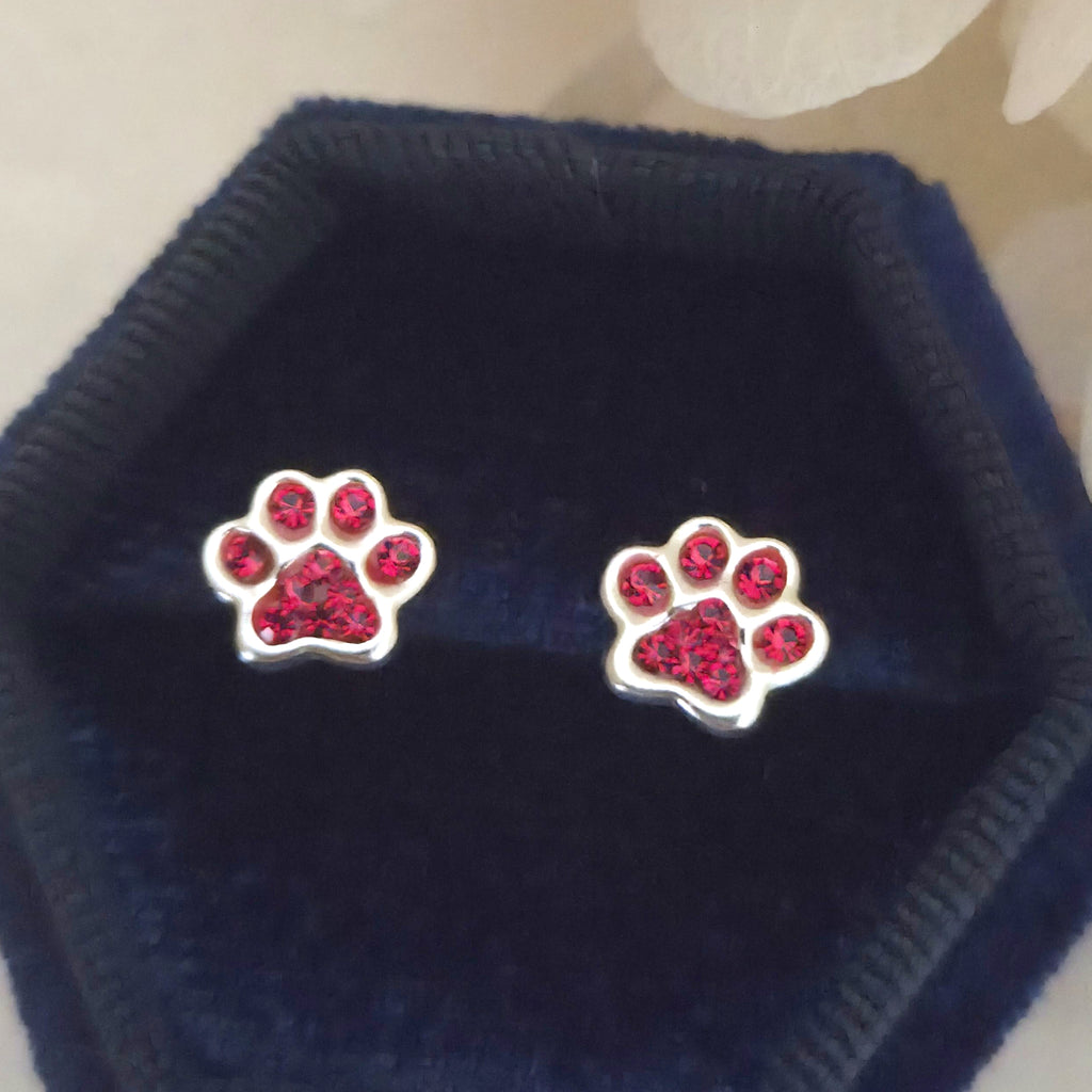 These 925 sterling silver dog paw print stud earrings sparkle with Light Siam red crystals. A bold and charming gift for pet lovers or fans of playful animal jewelry.