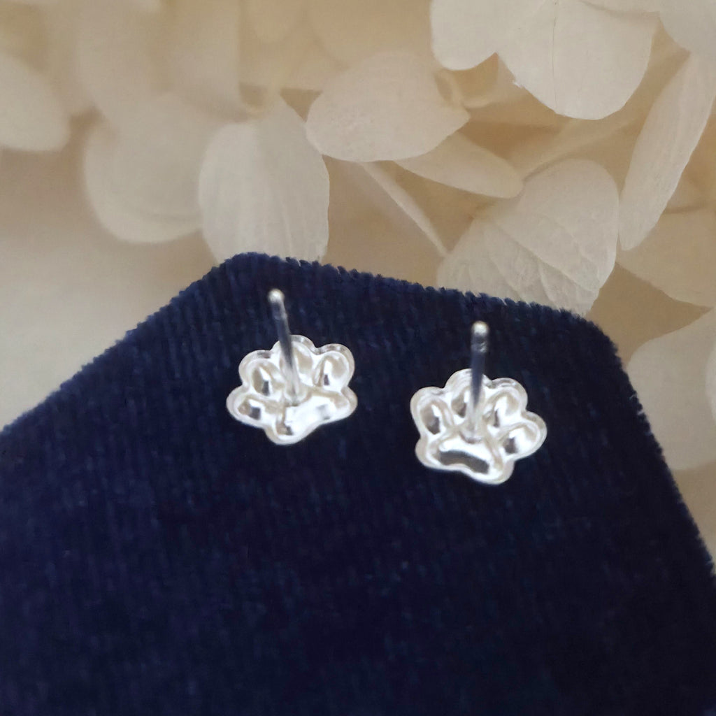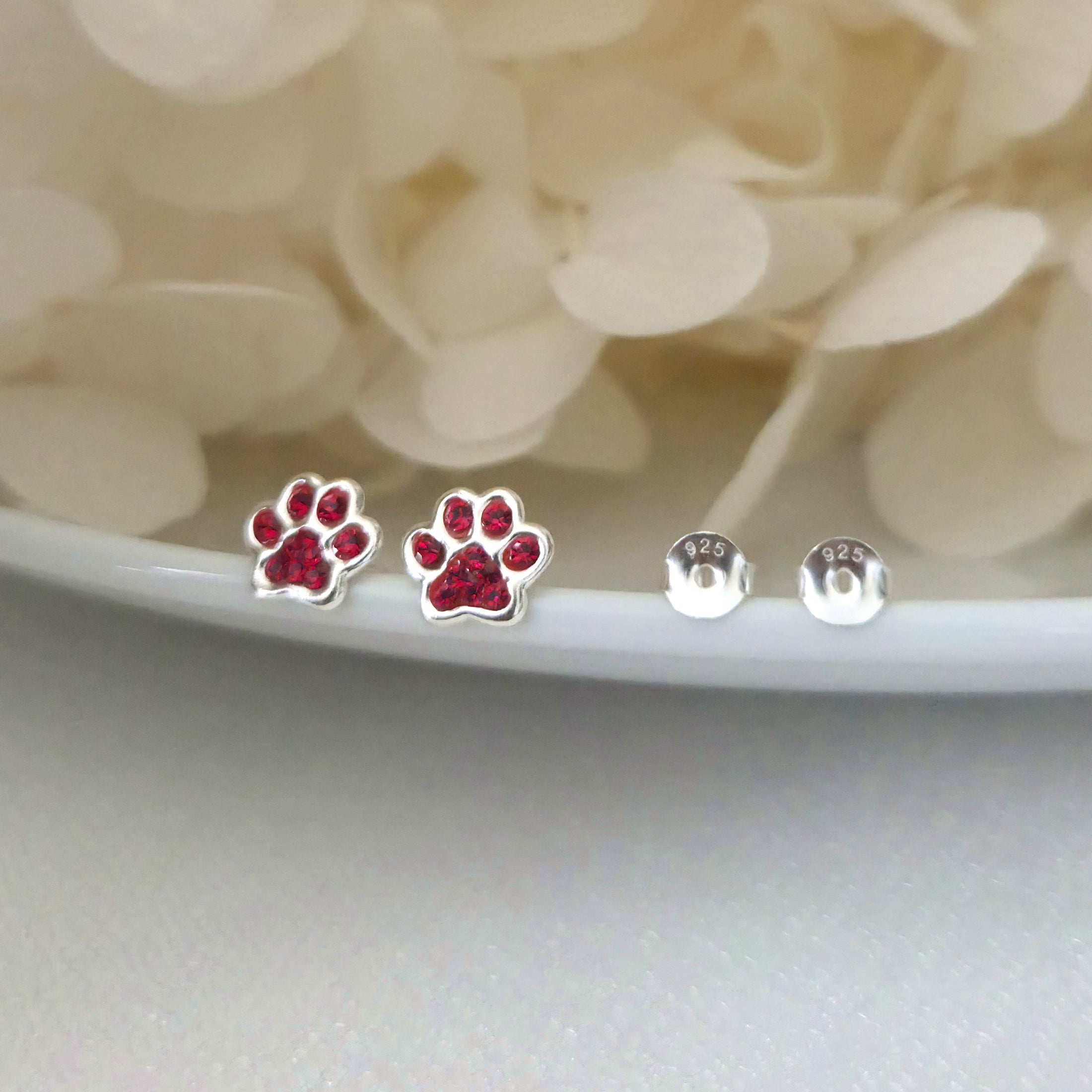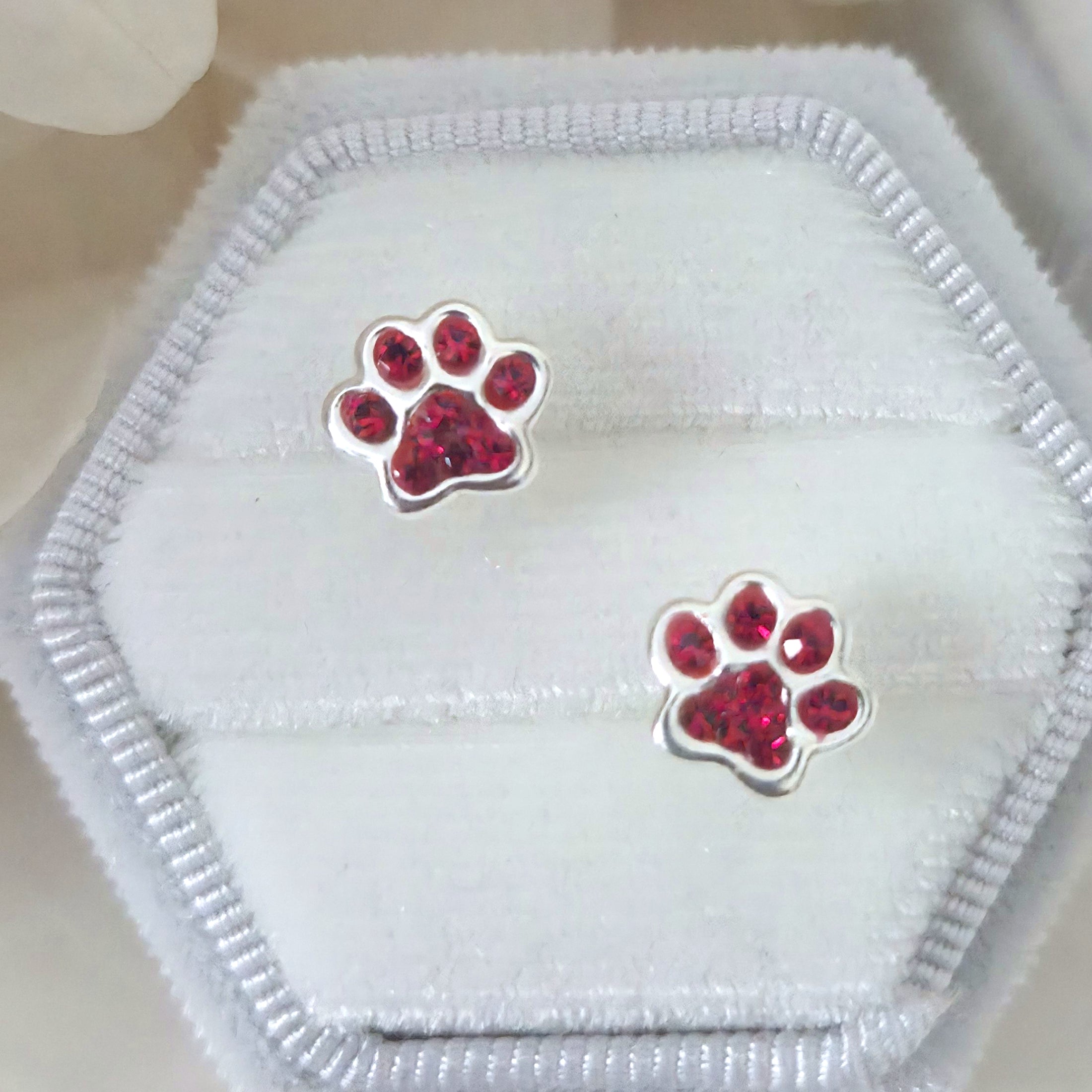 These 925 sterling silver dog paw print stud earrings sparkle with Light Siam red crystals. A bold and charming gift for pet lovers or fans of playful animal jewelry.