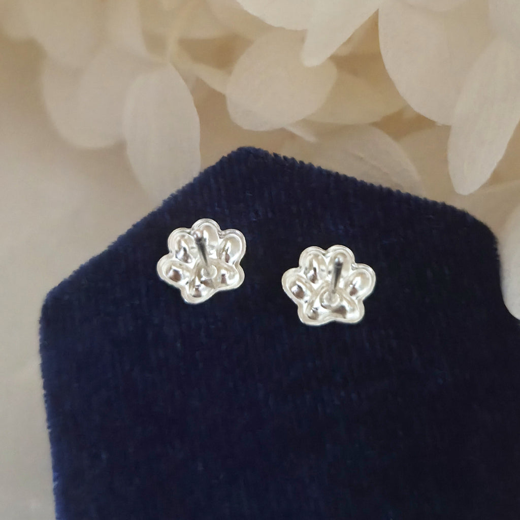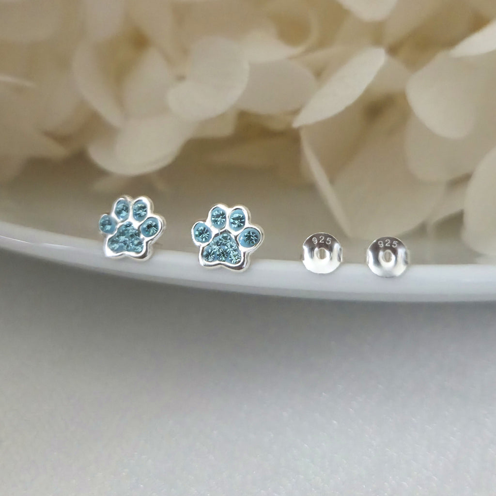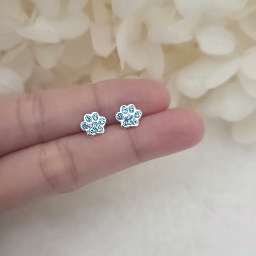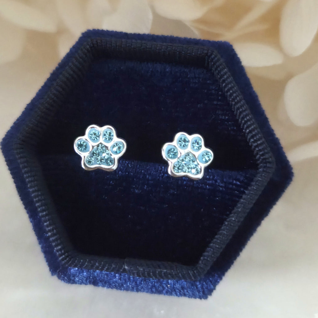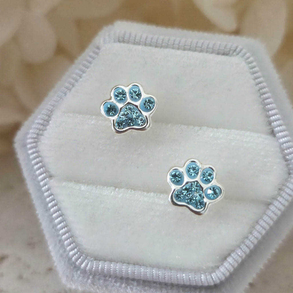 These 925 sterling silver light blue paw print stud earrings feature sparkling aqua Bohemica crystals. A perfect gift for dog lovers or anyone who adores playful, pet-themed jewelry.
