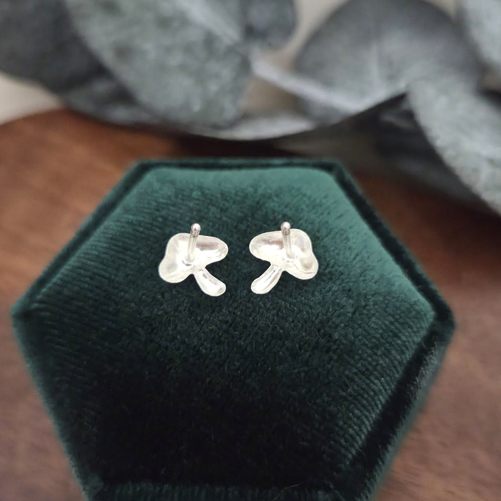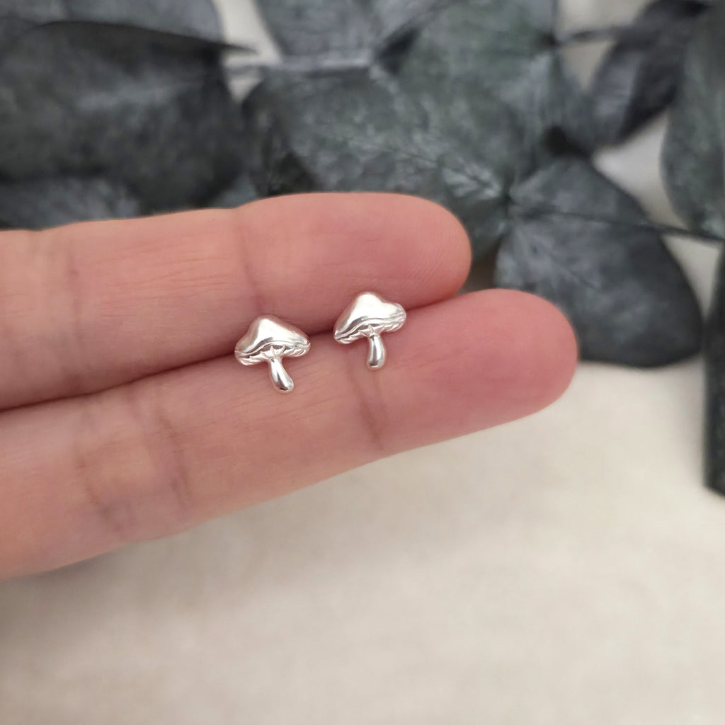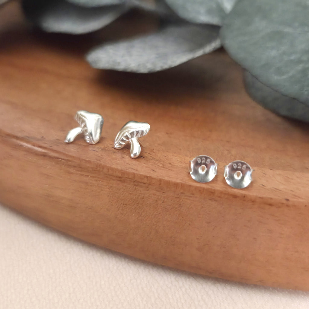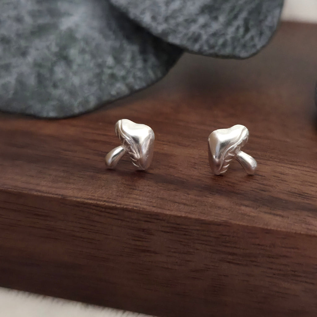 These 925 sterling silver mushroom stud earrings feature a smooth, minimalist design with playful charm. A thoughtful gift for nature lovers, cottagecore fans, or anyone who loves unique silver jewelry.