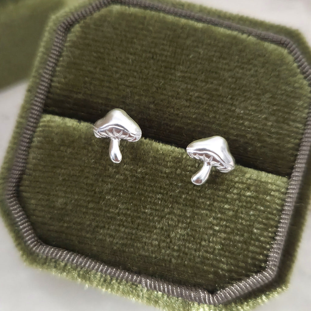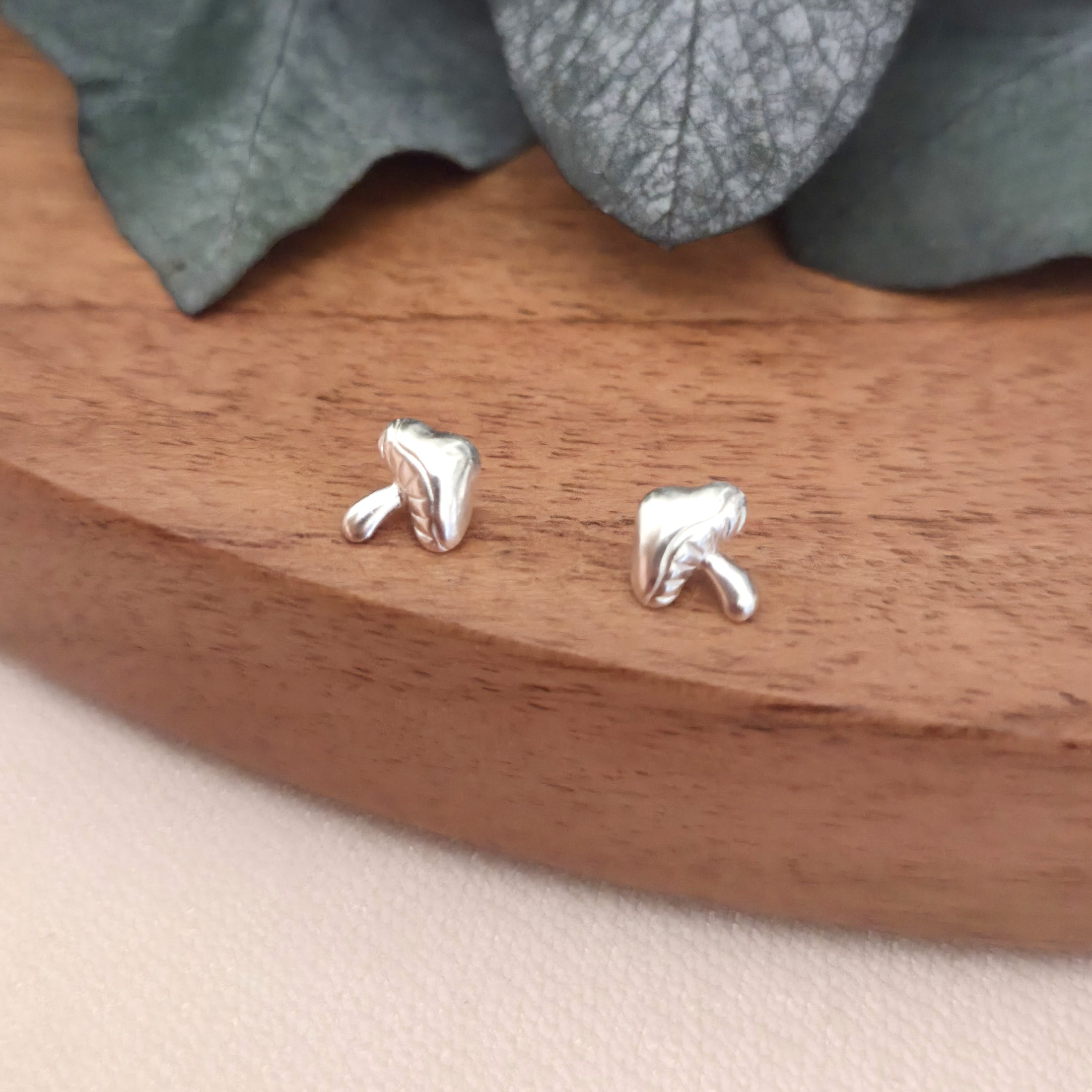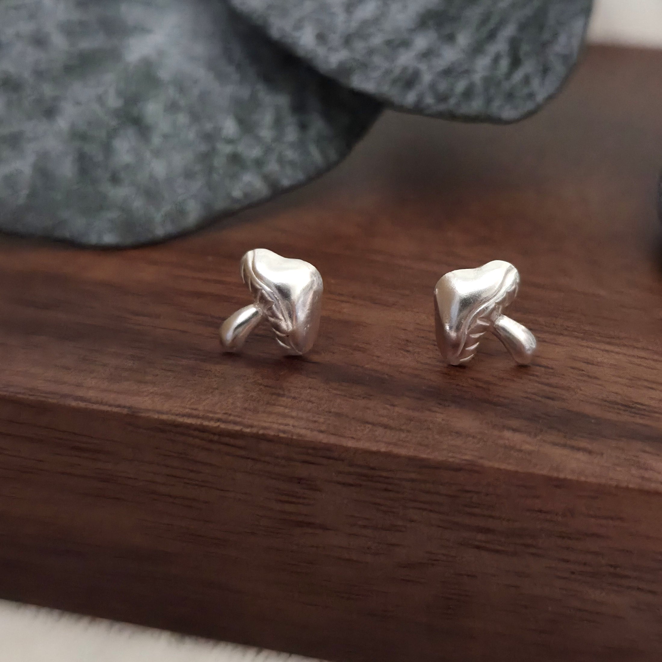 These 925 sterling silver mushroom stud earrings feature a smooth, minimalist design with playful charm. A thoughtful gift for nature lovers, cottagecore fans, or anyone who loves unique silver jewelry.