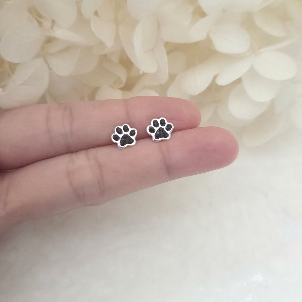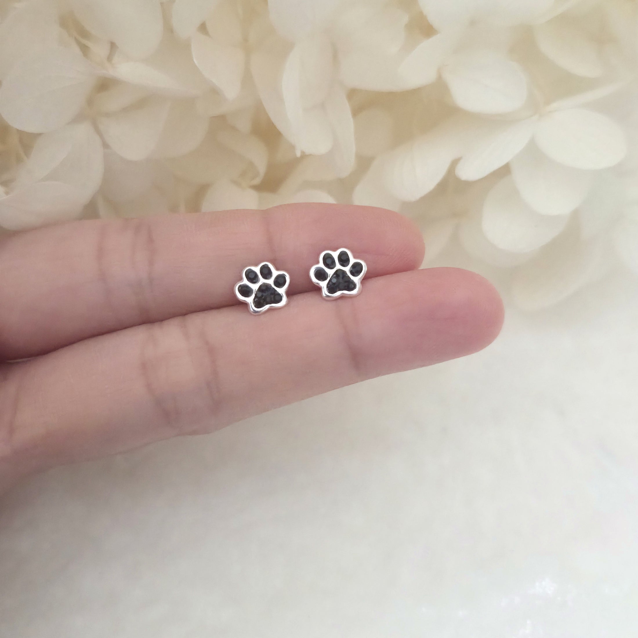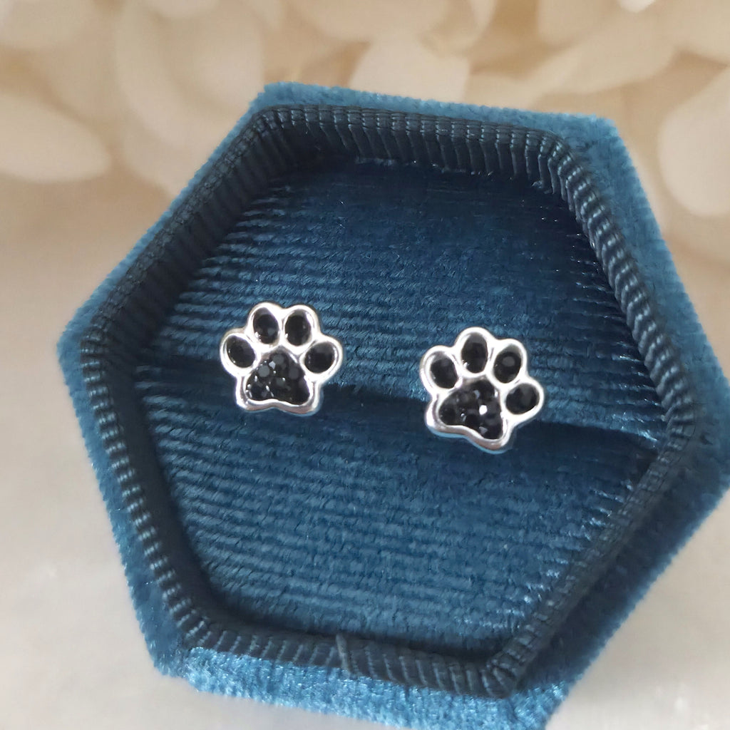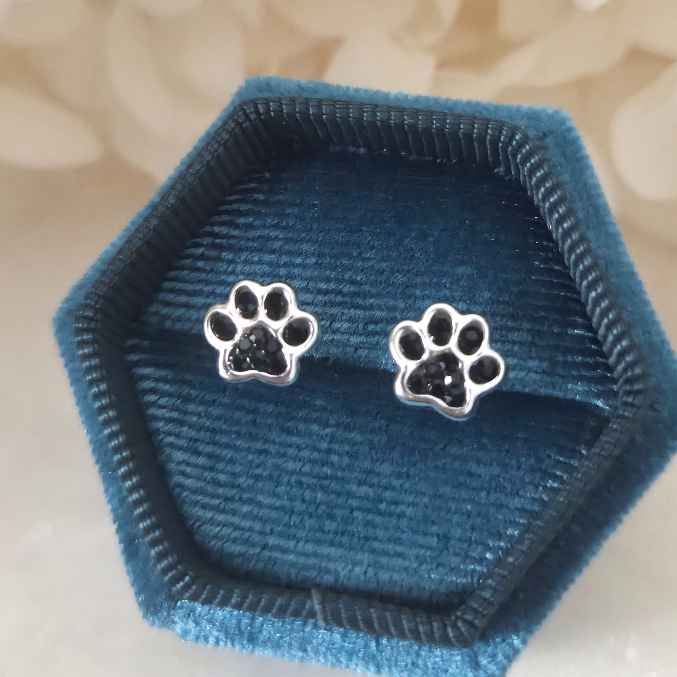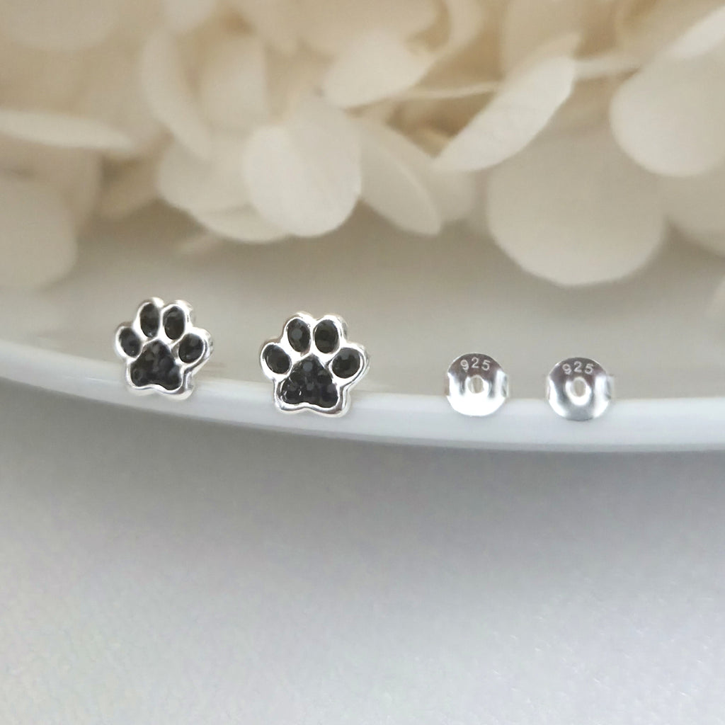 925 Sterling Silver Paw Print Stud Earrings – Black Dog Paw Studs in Solid Silver with Jet Crystal – Cute Pet Jewelry Gift for Her