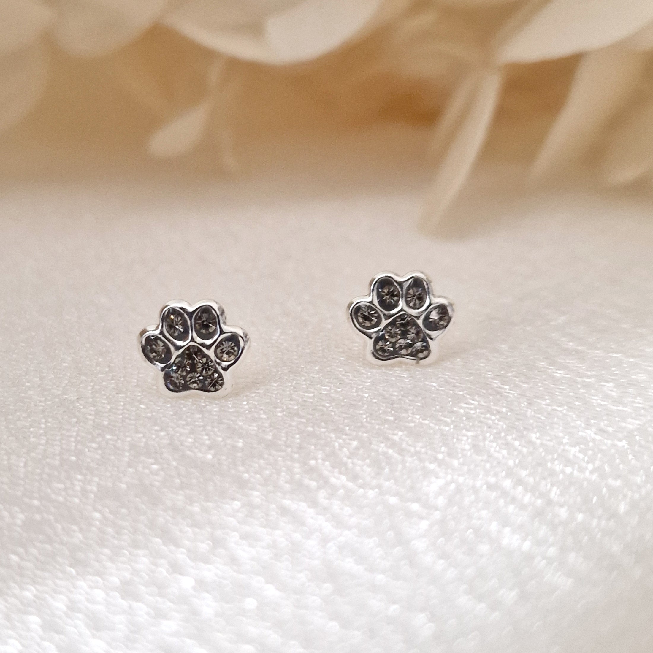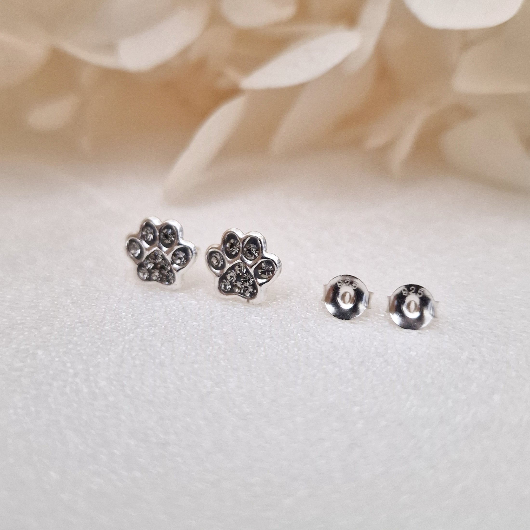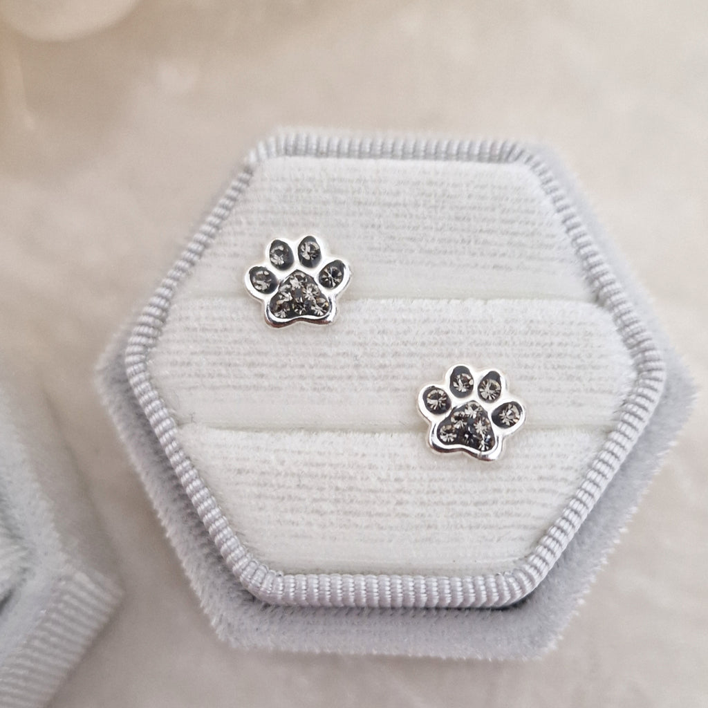 925 Sterling Silver Paw Print Stud Earrings – Minimalist Dog Paw Studs in Solid Silver with Black Diamond Crystal