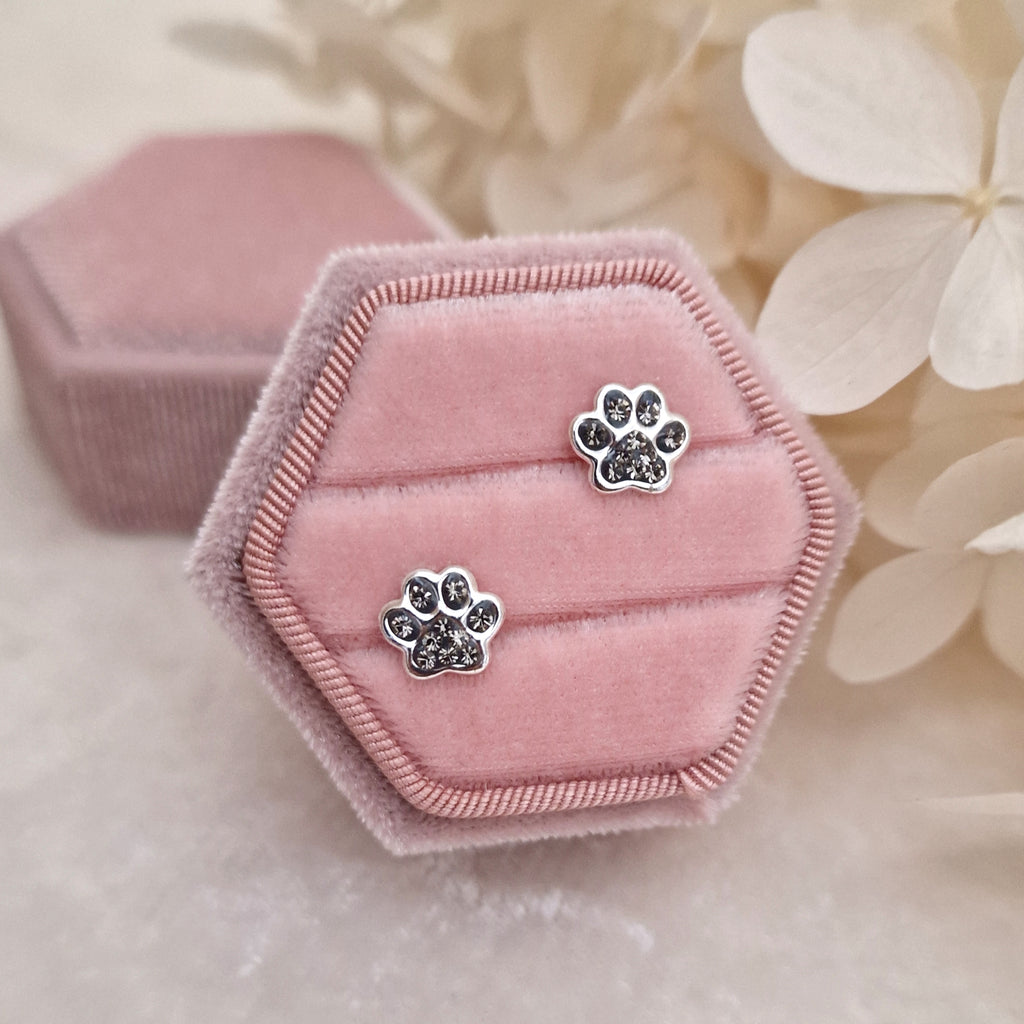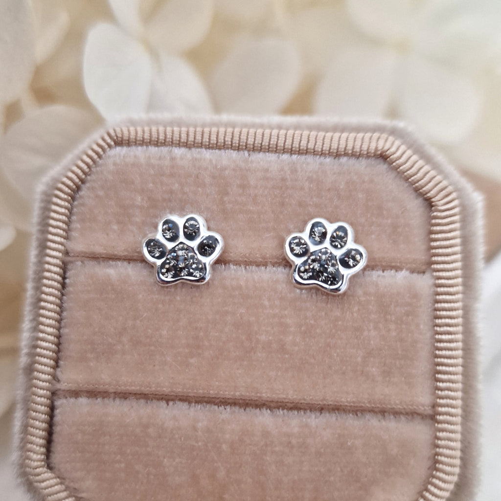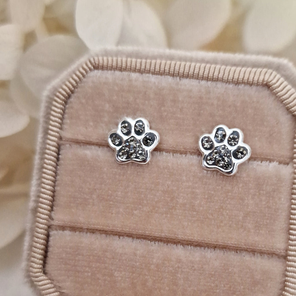 925 Sterling Silver Paw Print Stud Earrings – Minimalist Dog Paw Studs in Solid Silver with Black Diamond Crystal