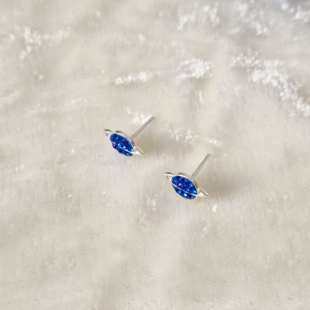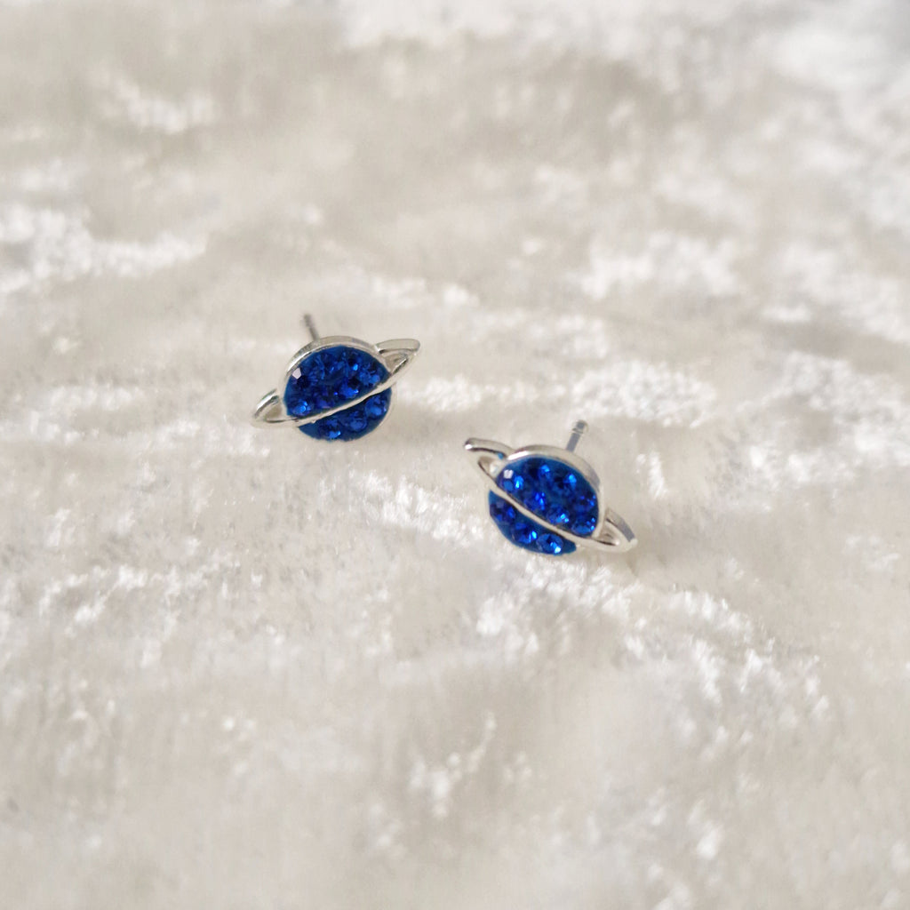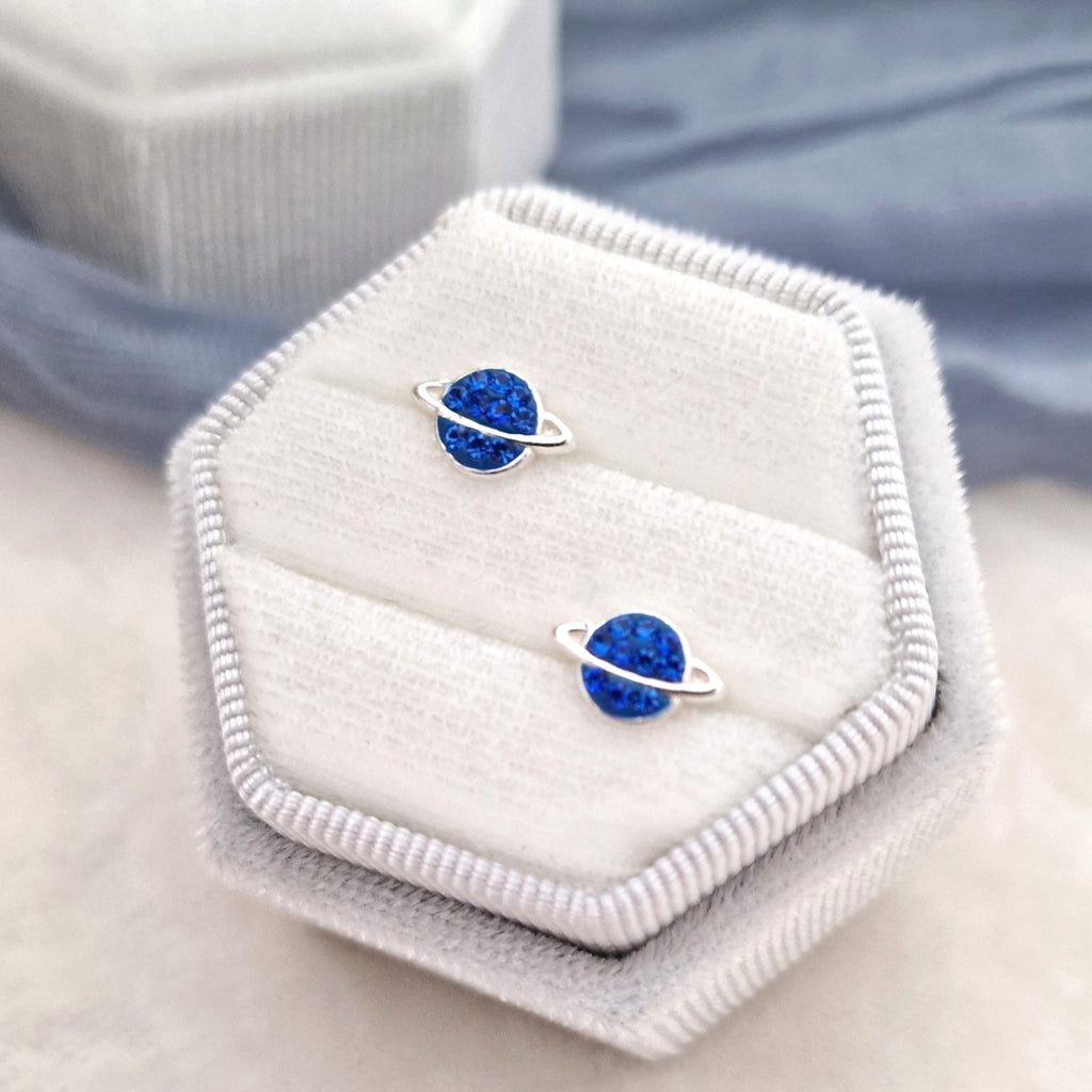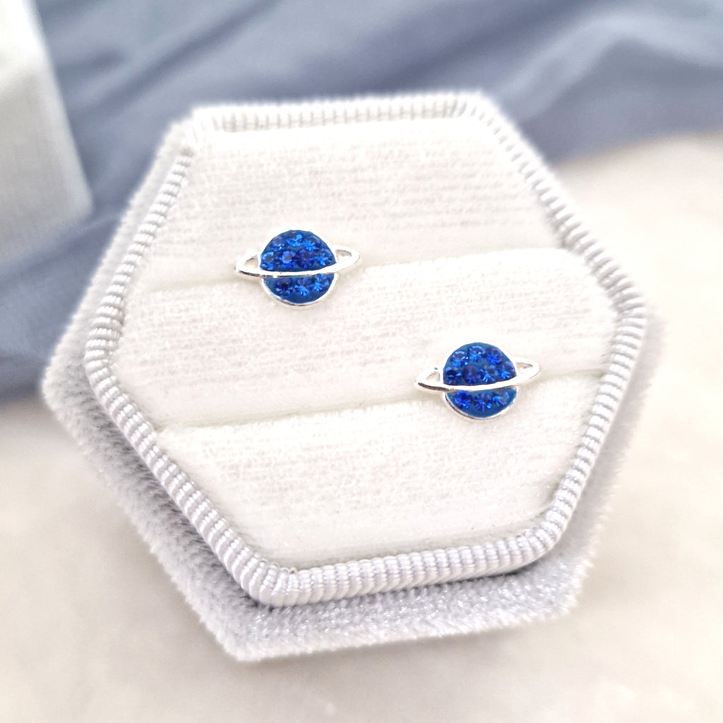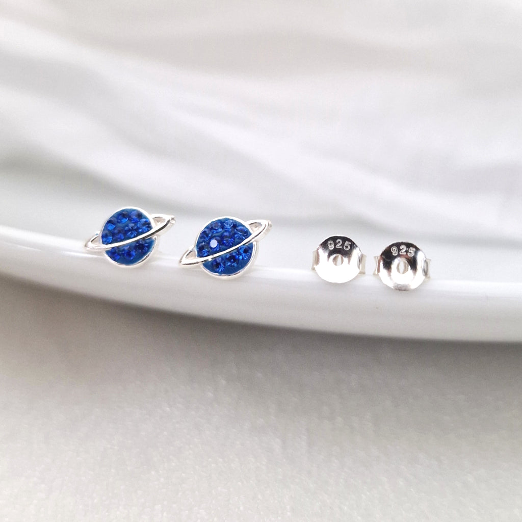 925 Sterling Silver Saturn Stud Earrings – Solid Silver Saturn Studs with Blue Sapphire Crystal – Blue Planet Earrings