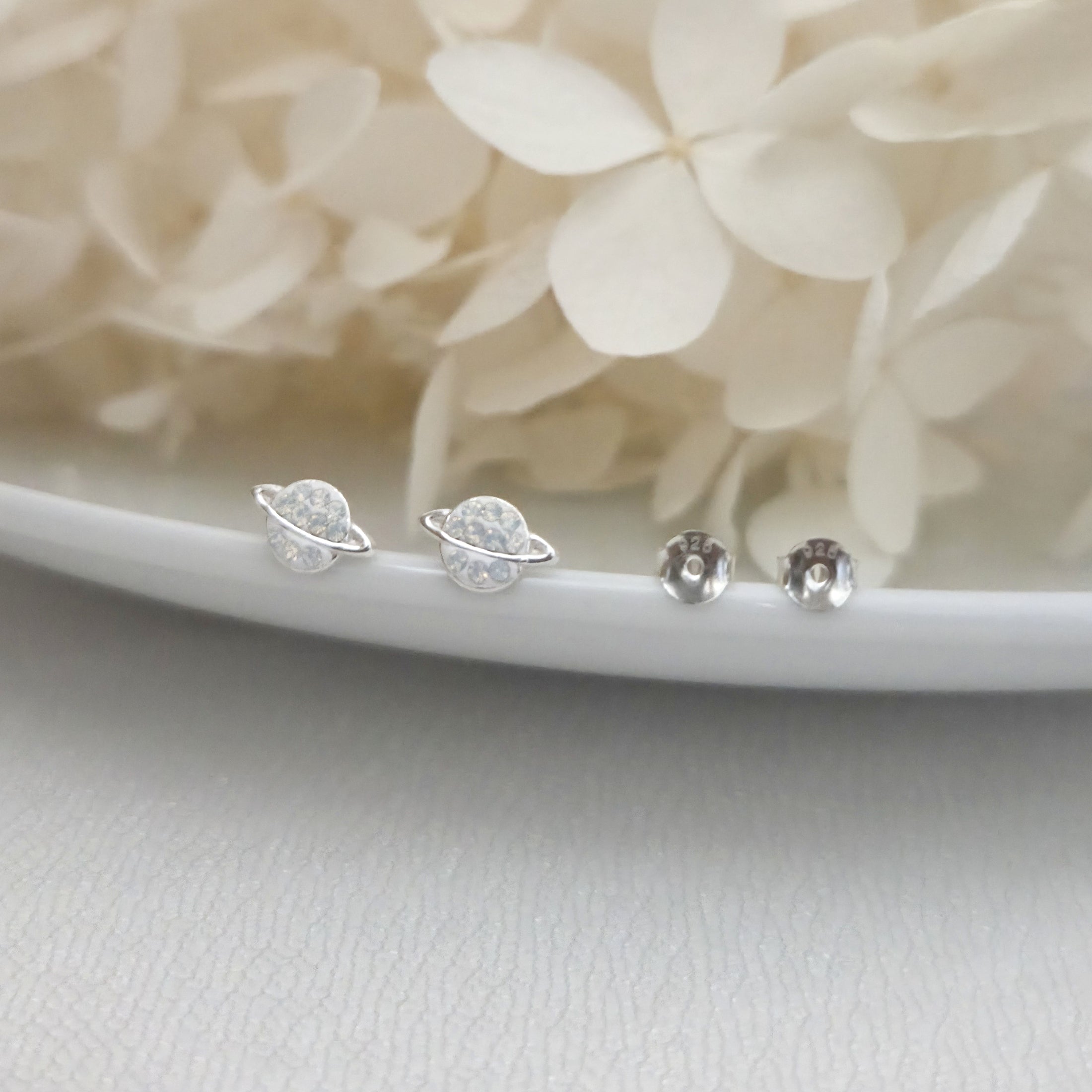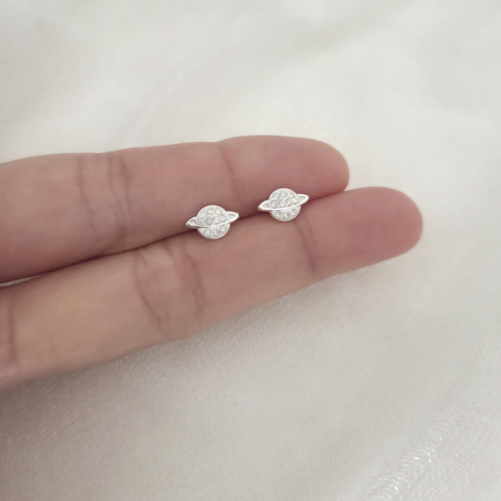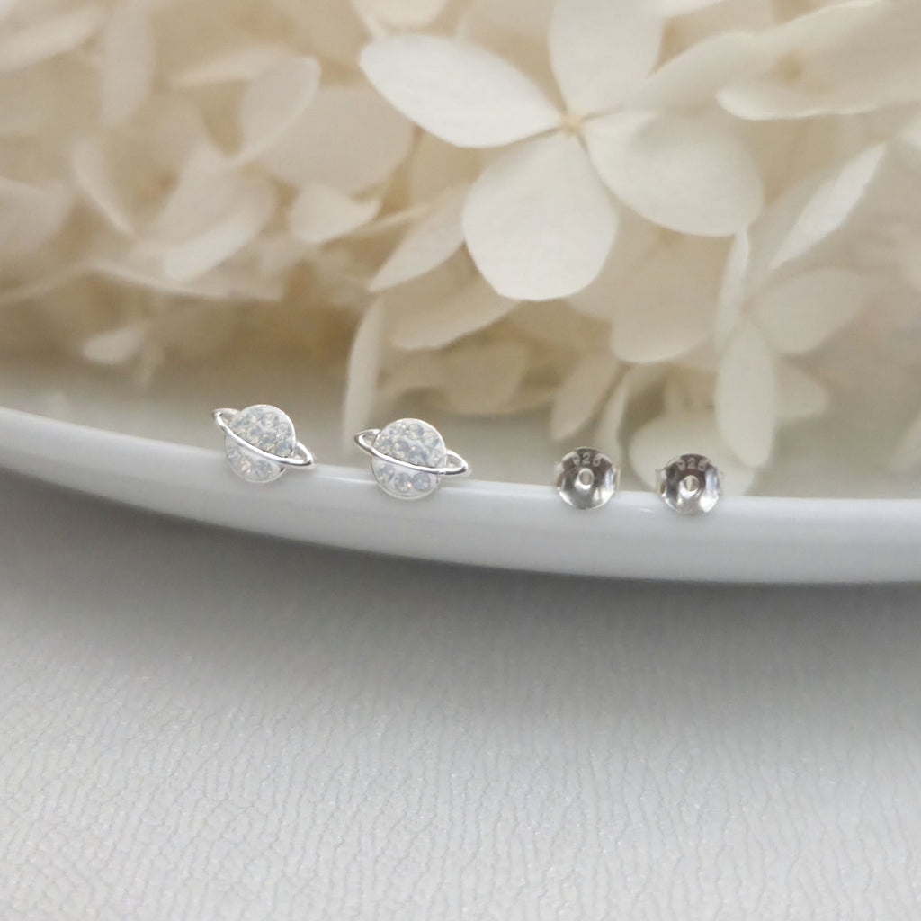925 Sterling Silver Saturn Stud Earrings with White Opal Crystals – Solid Silver White Opal Planet Earrings