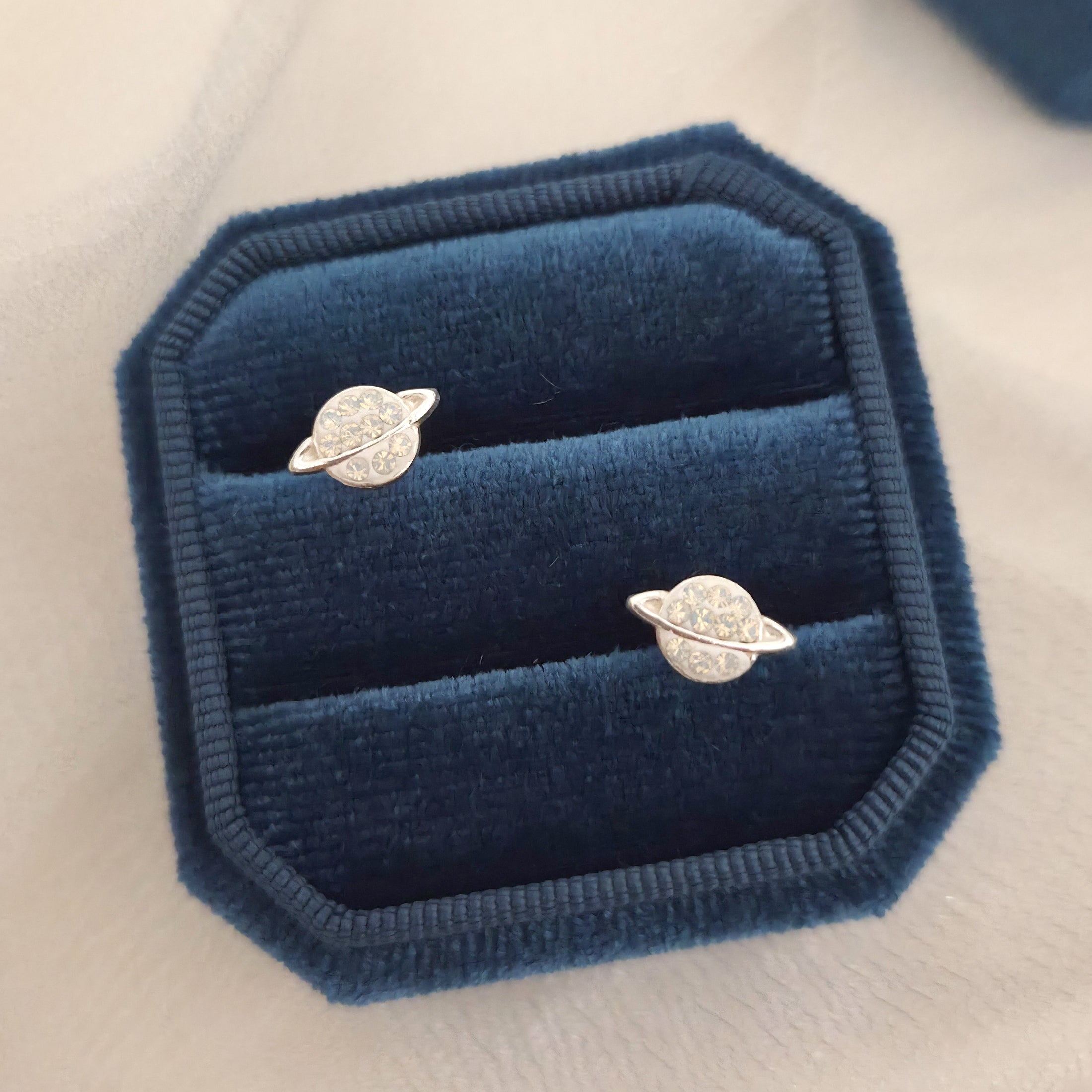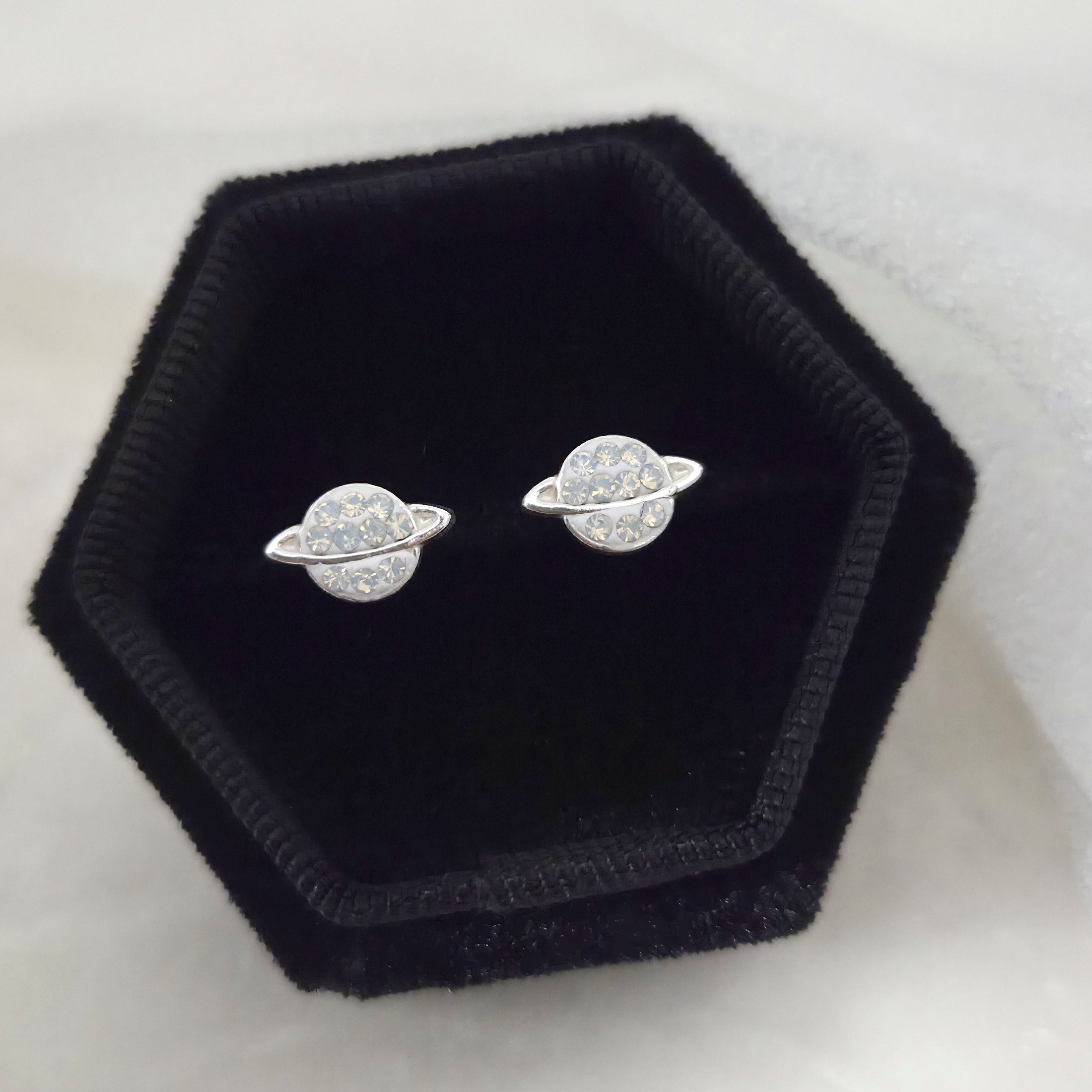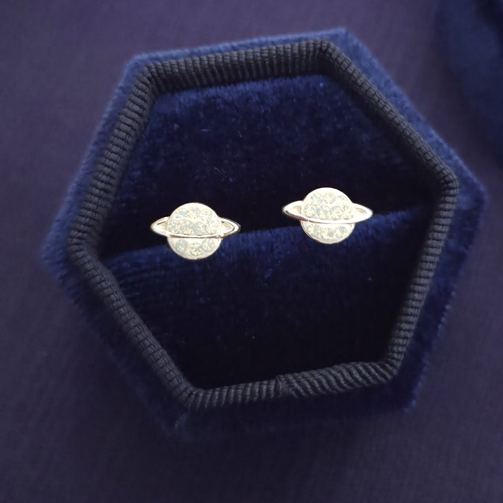 925 Sterling Silver Saturn Stud Earrings with White Opal Crystals – Solid Silver White Opal Planet Earrings