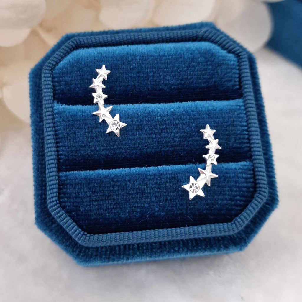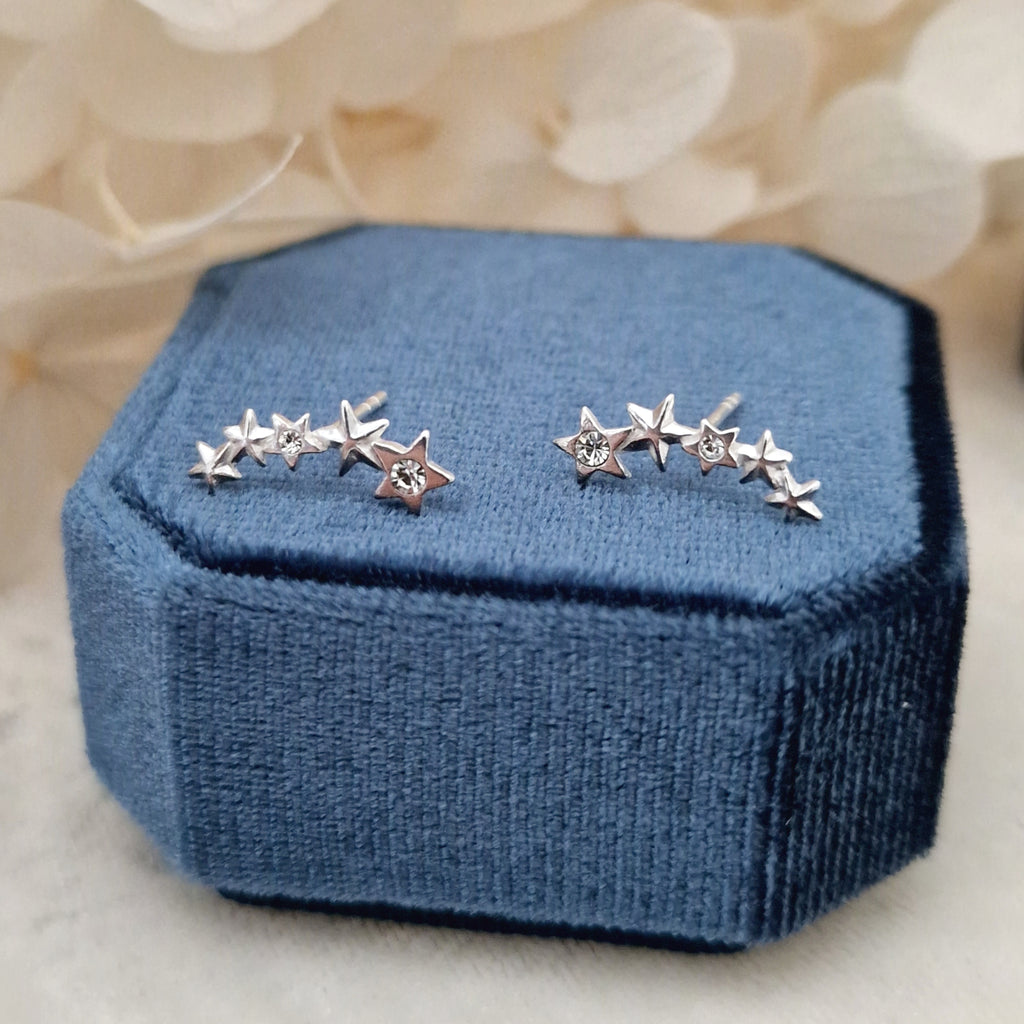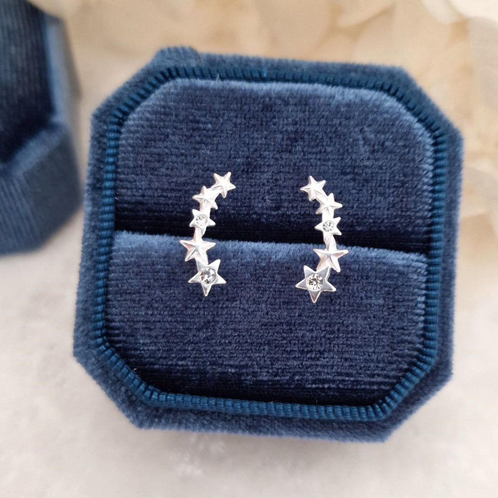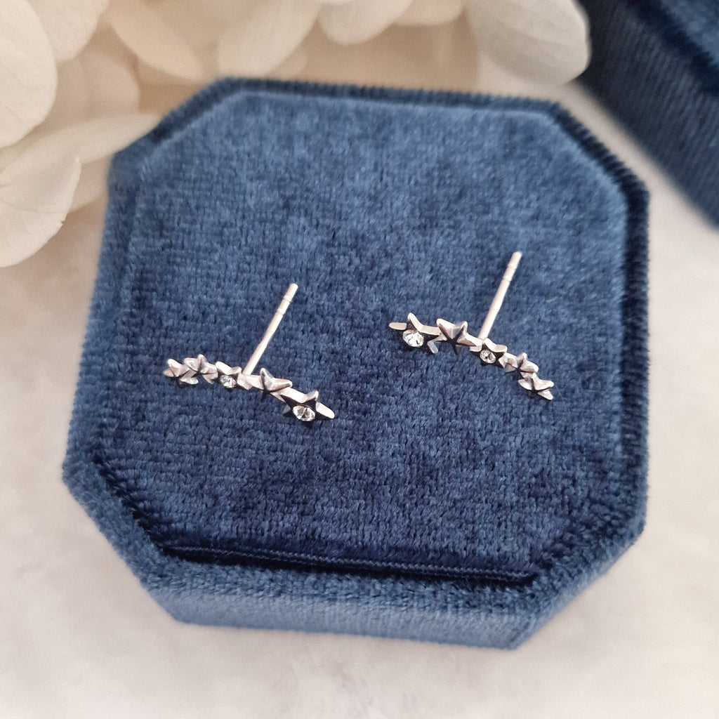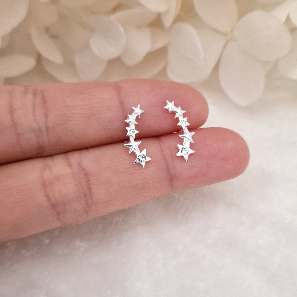 Add a celestial shimmer to your everyday look with these sterling silver shooting star stud earrings. Featuring a graceful curve of polished stars accented with sparkling crystals, this minimalist design evokes movement and light. Perfect for dreamers, stargazers, and lovers of delicate jewelry with meaning.