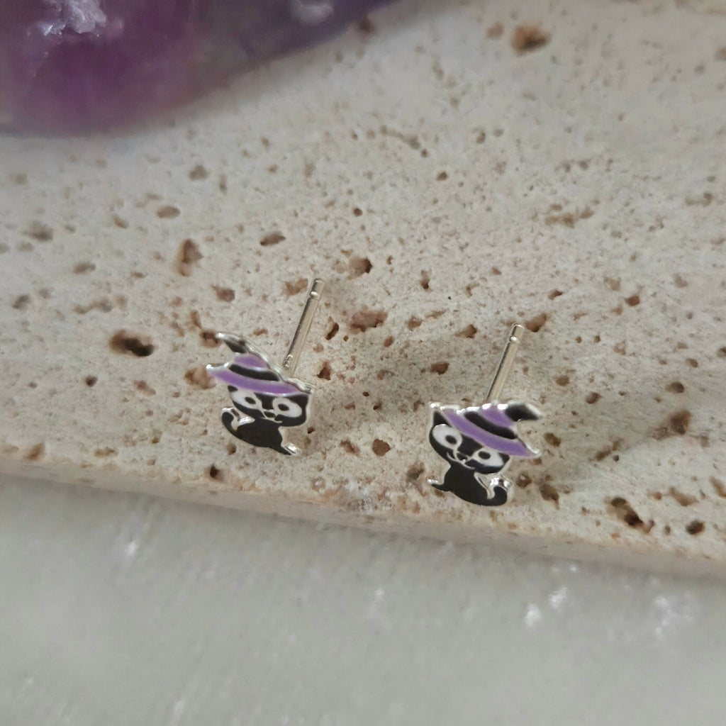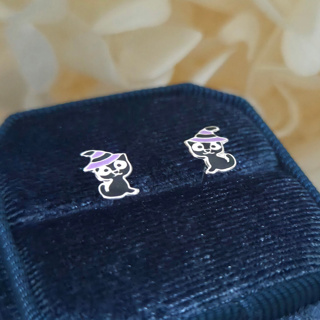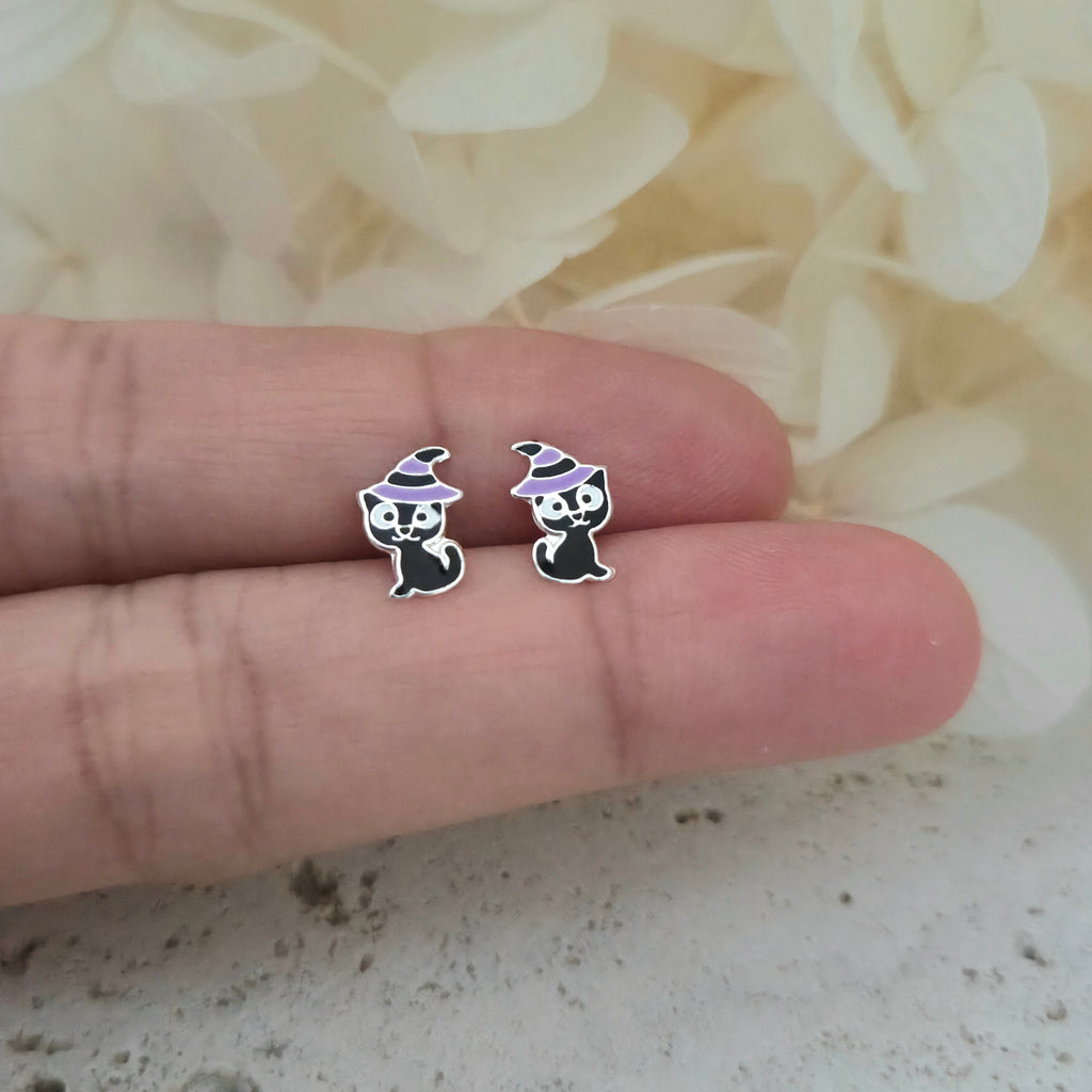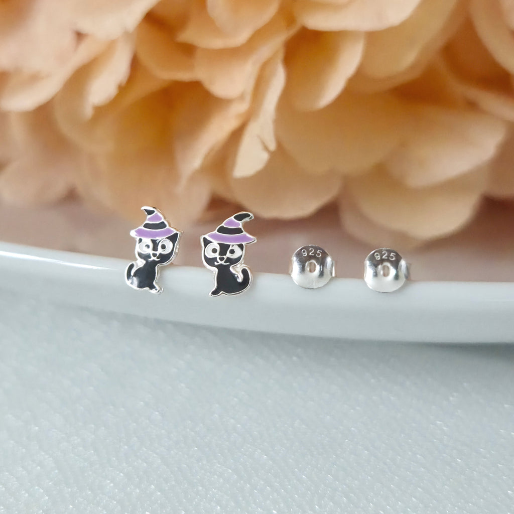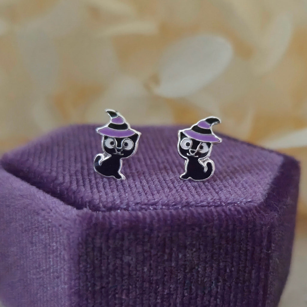 Black Cat with Purple Witch Hat Stud Earrings in 925 Sterling Silver – Solid Silver Halloween Studs