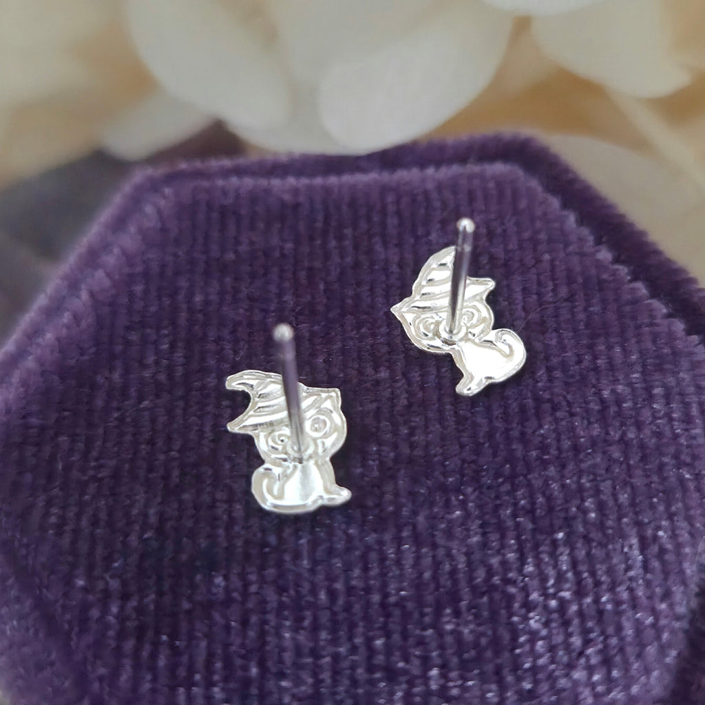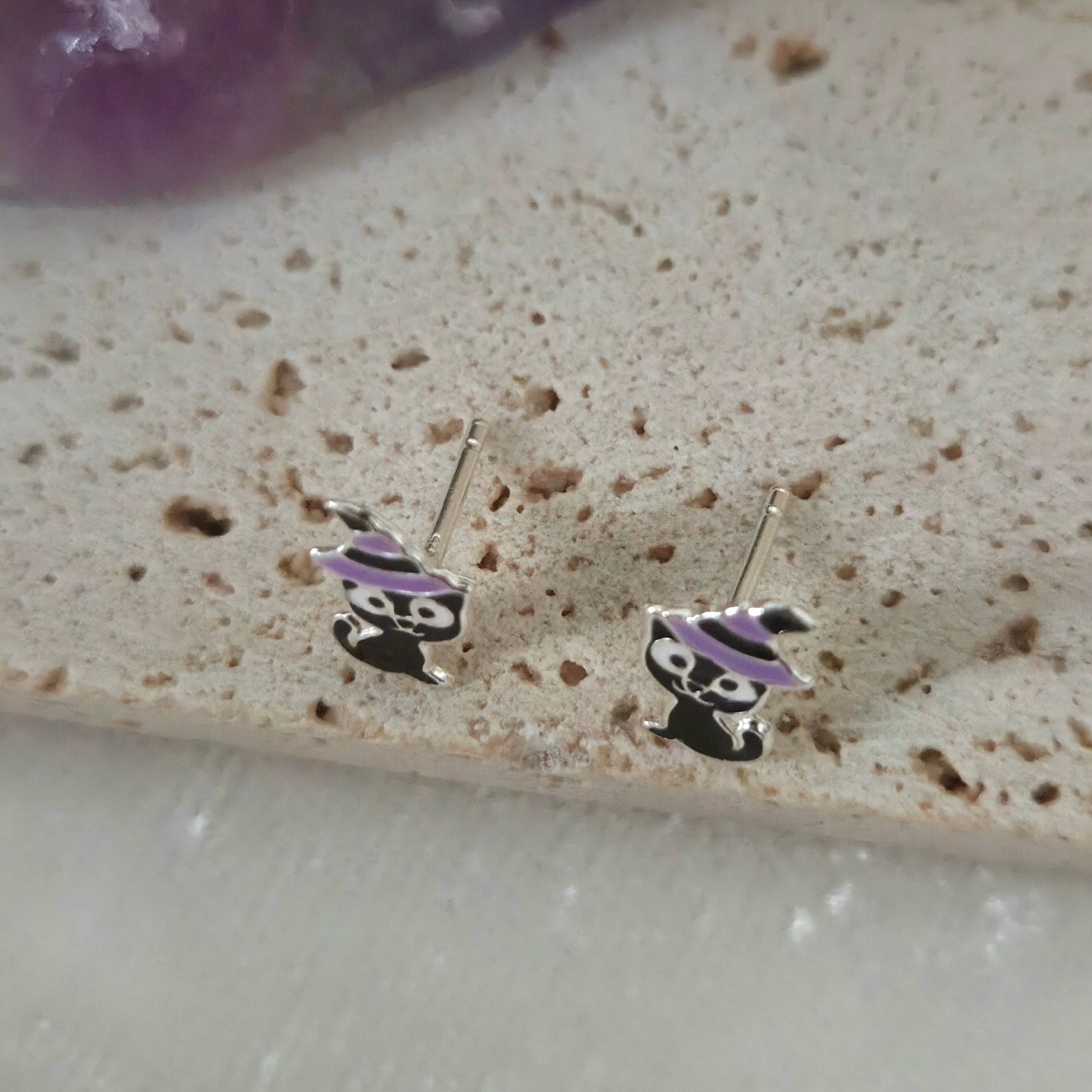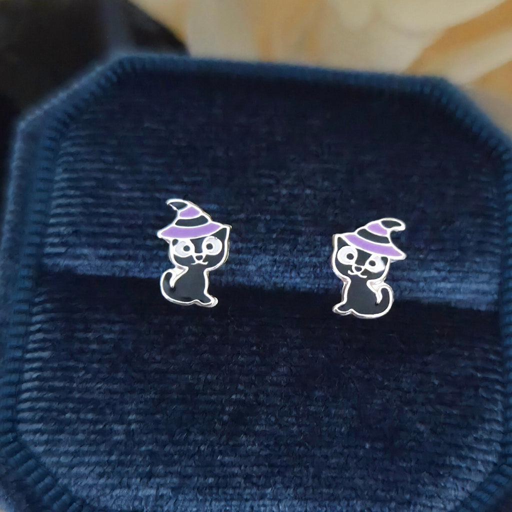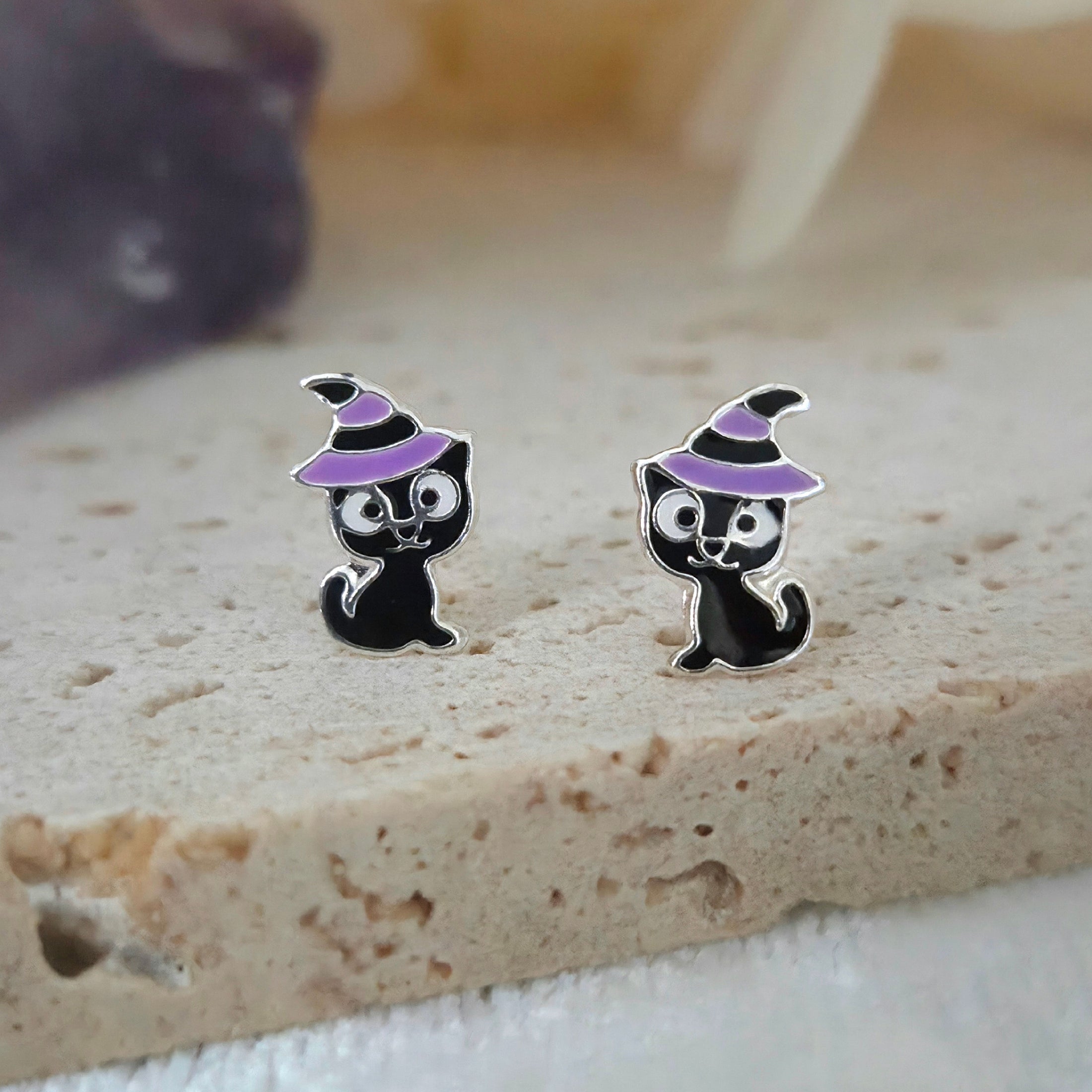 Black Cat with Purple Witch Hat Stud Earrings in 925 Sterling Silver – Solid Silver Halloween Studs