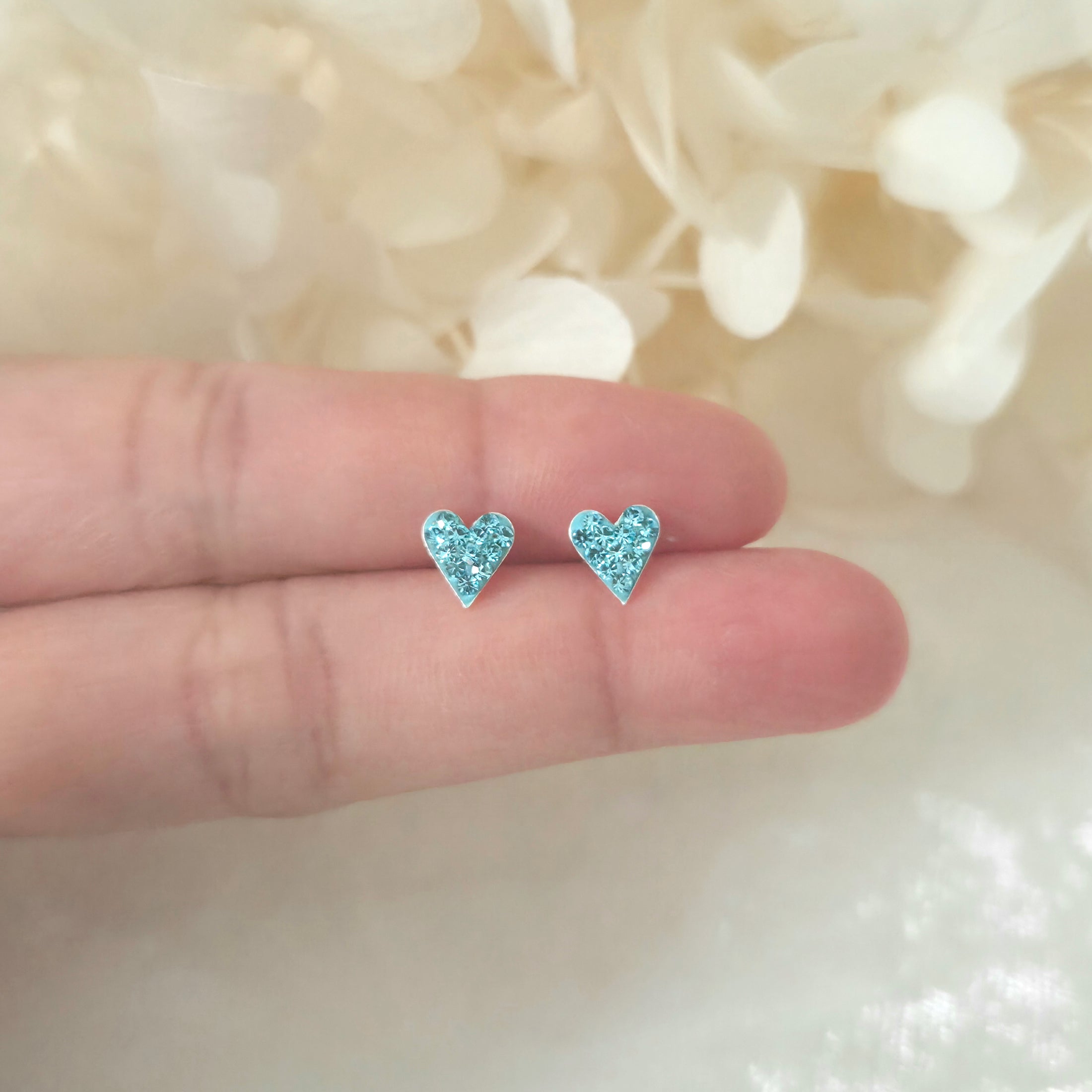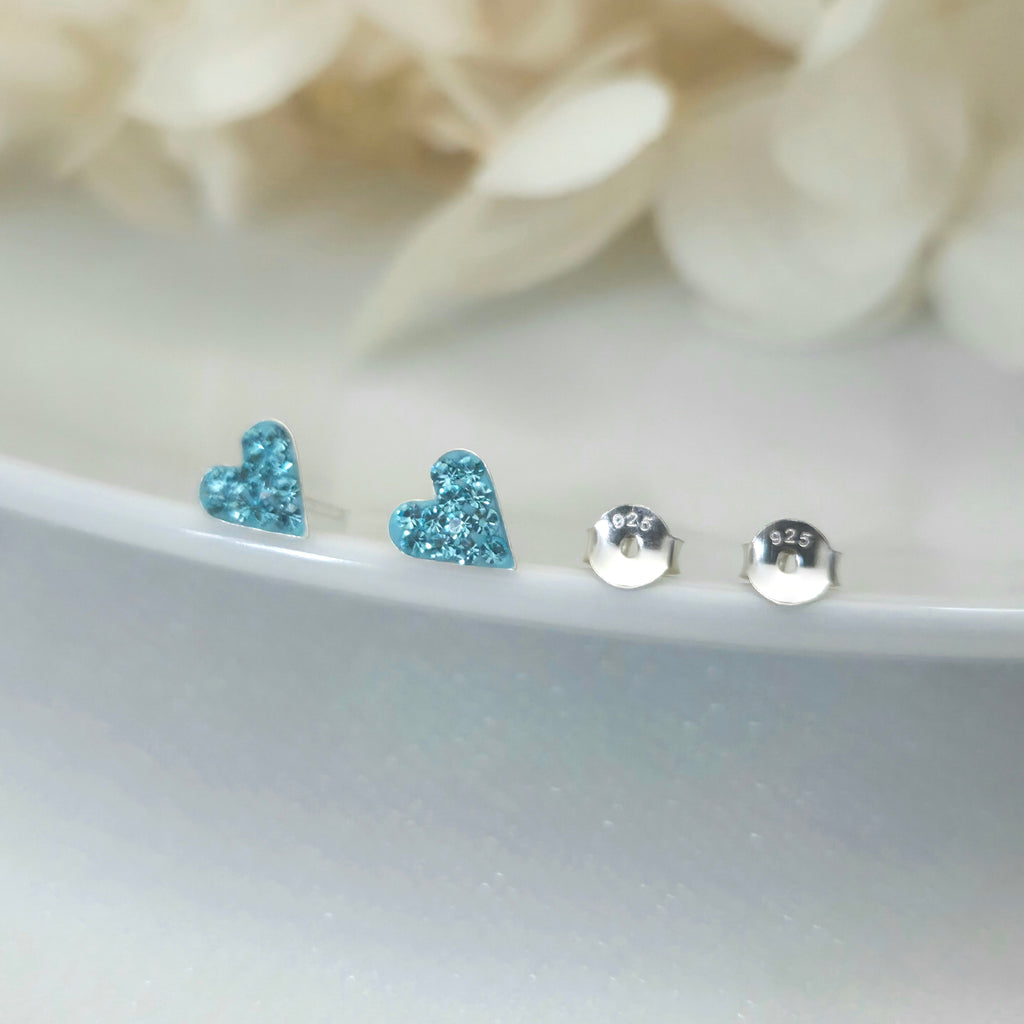 Cute Blue Heart Stud Earrings in 925 Sterling Silver – Heart Studs with Aqua Bohemica Blue Crystals