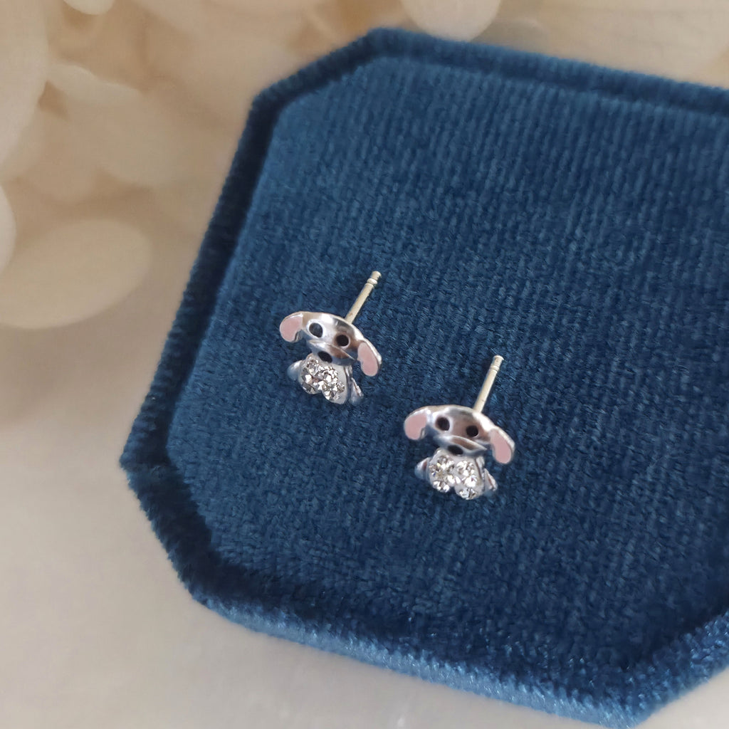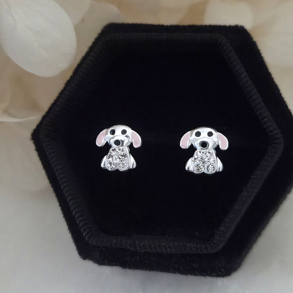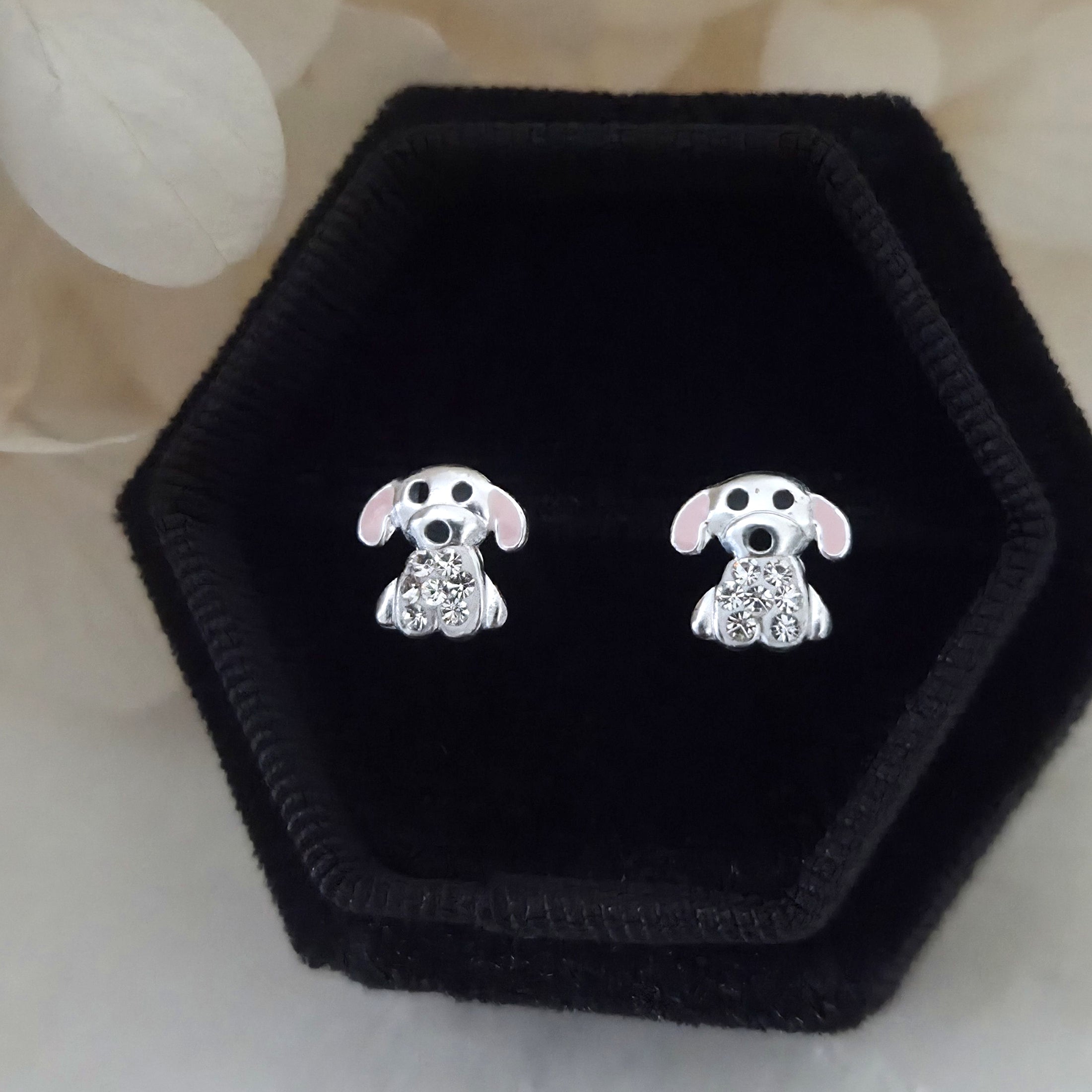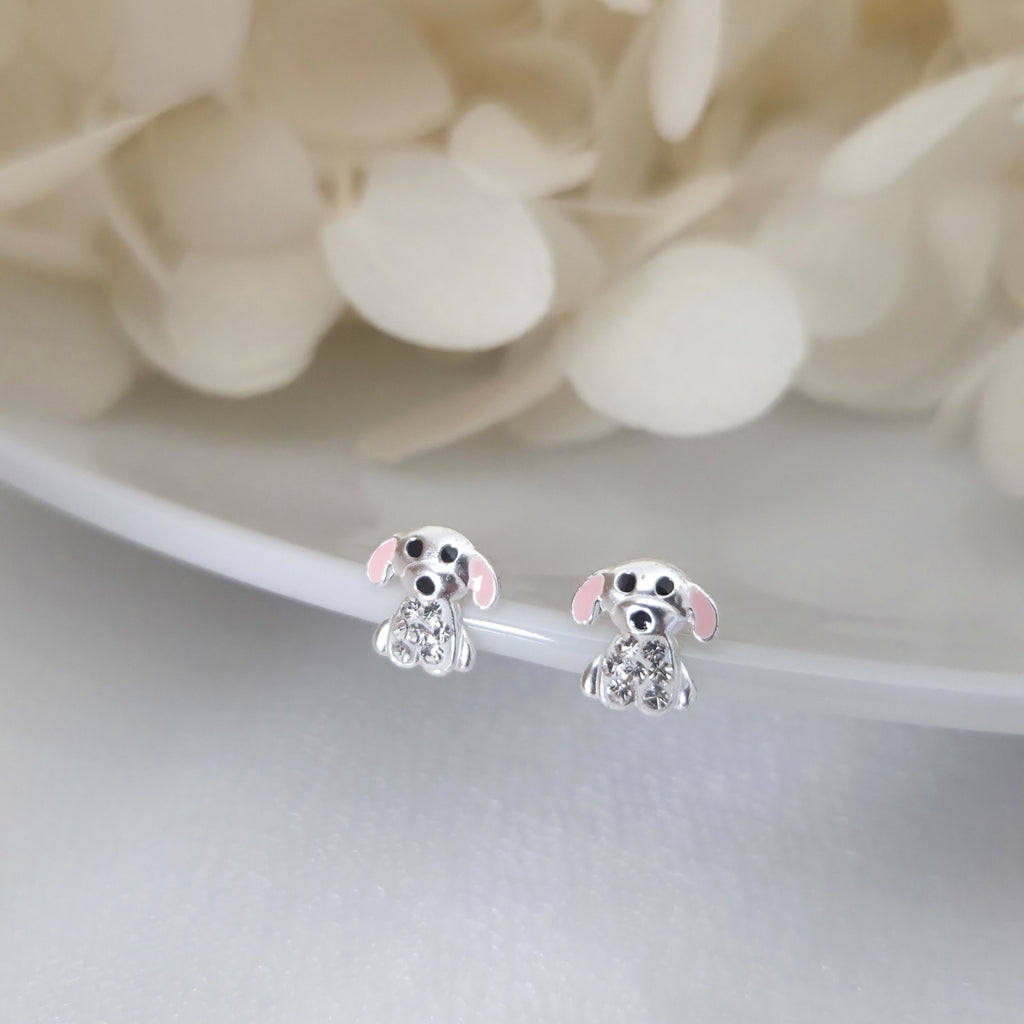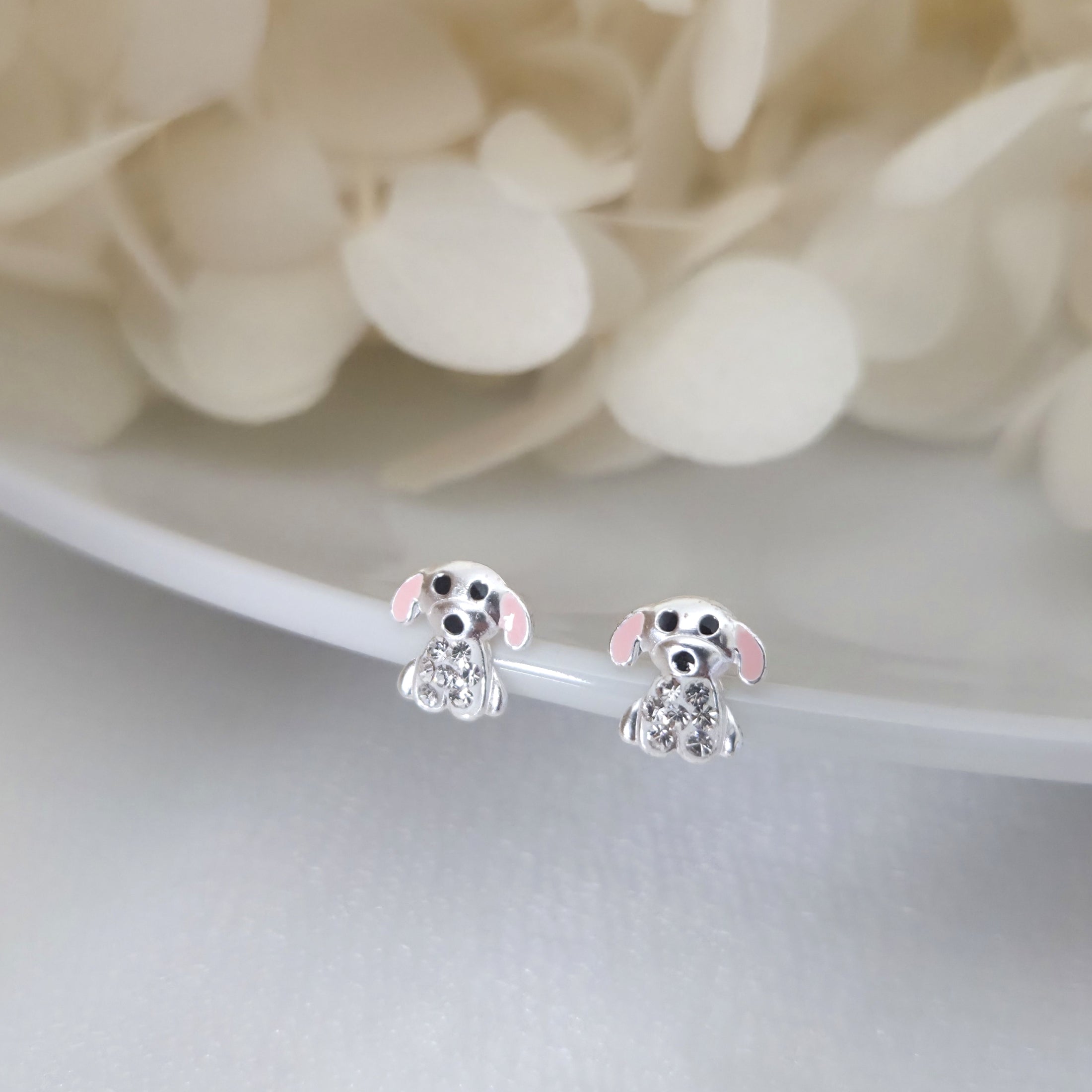 Adorable puppy stud earrings in 925 sterling silver, featuring pink enamel ears and sparkling crystal accents. Perfect for dog lovers of all ages.