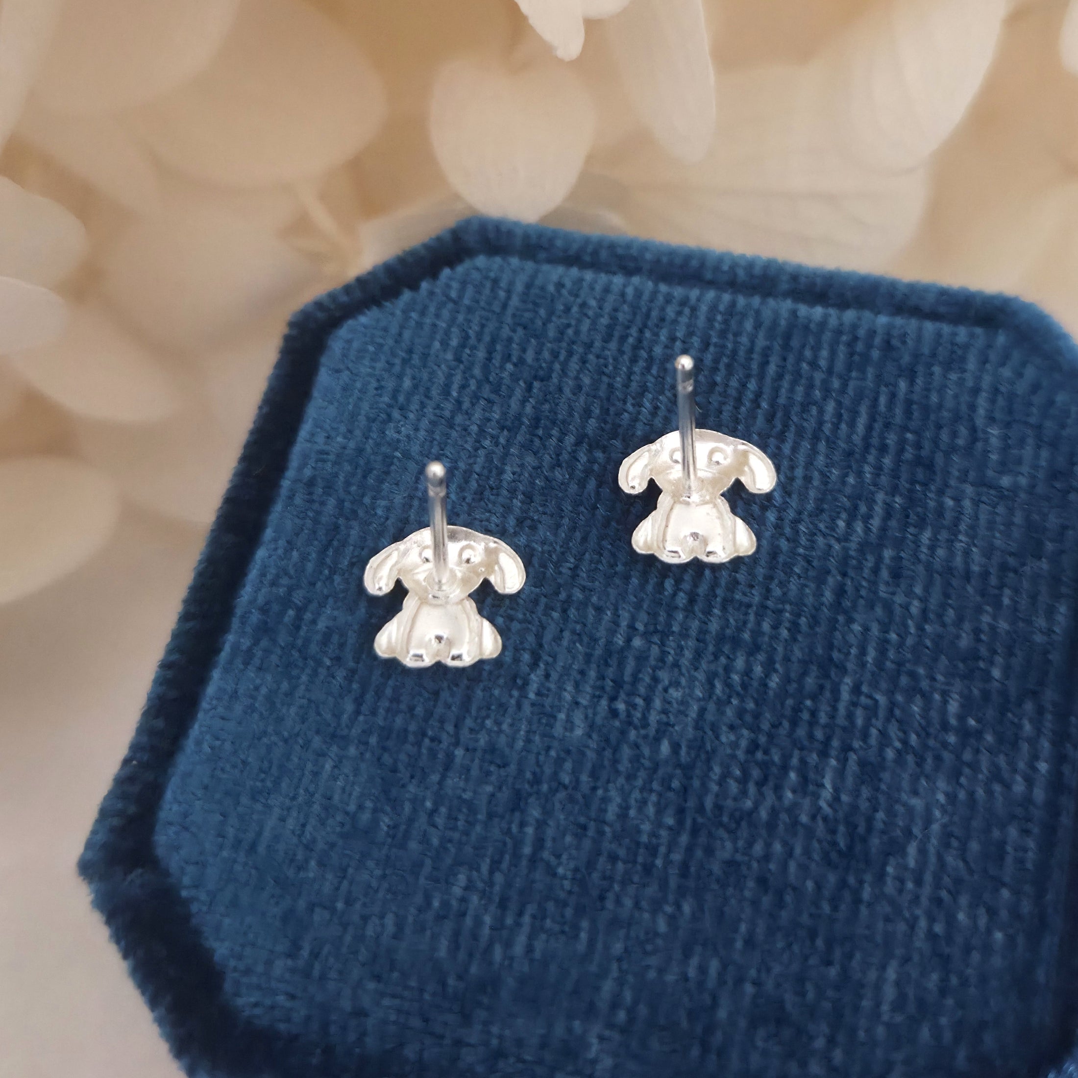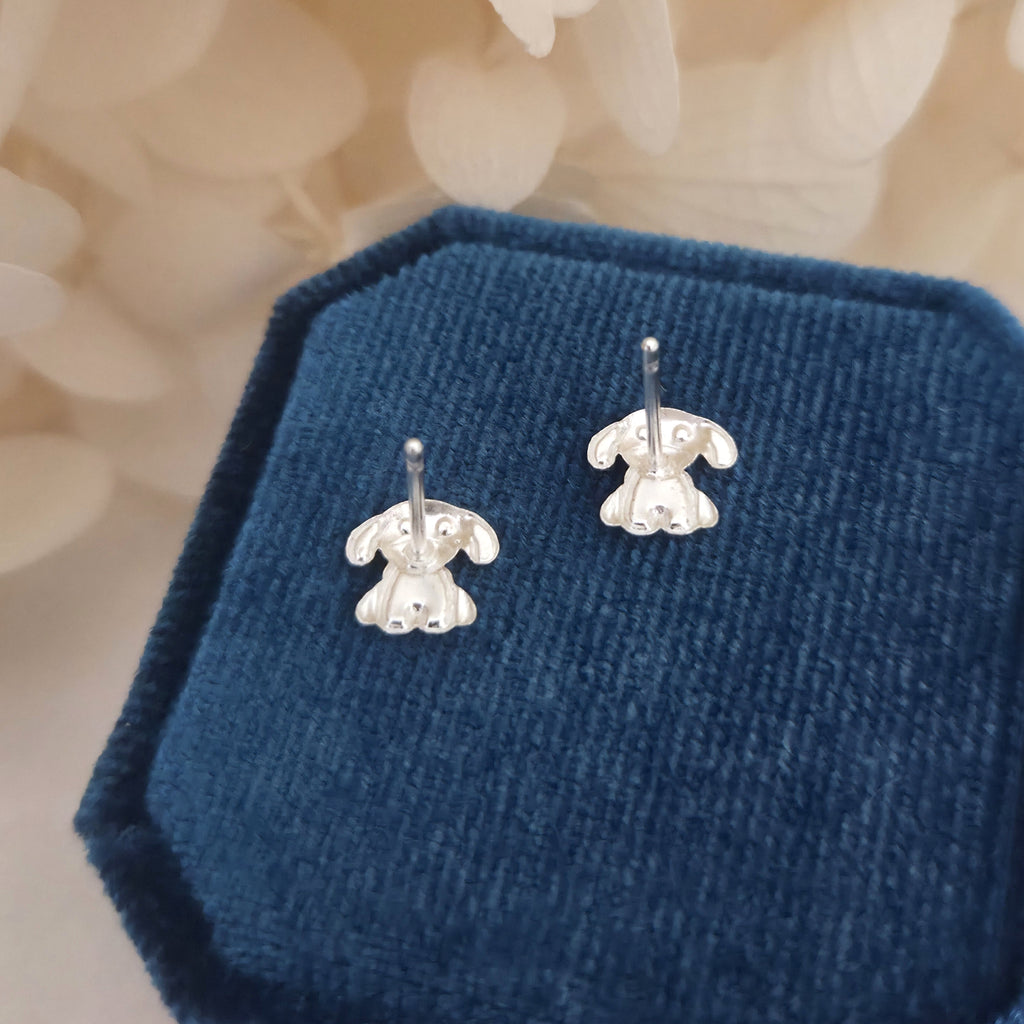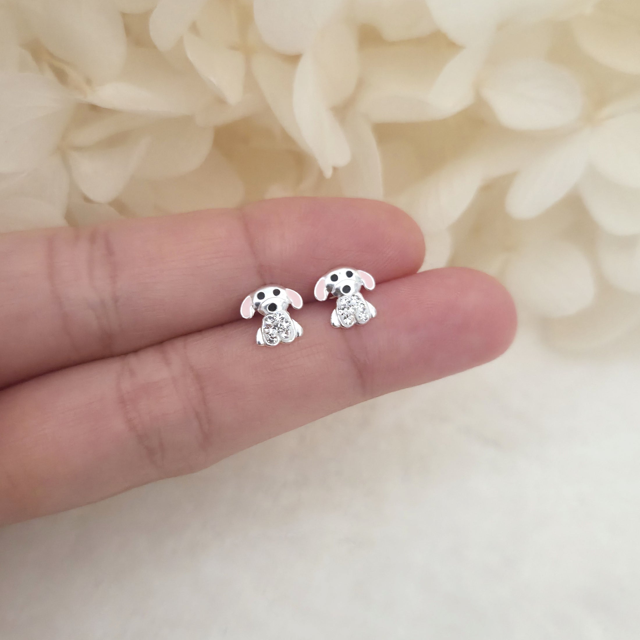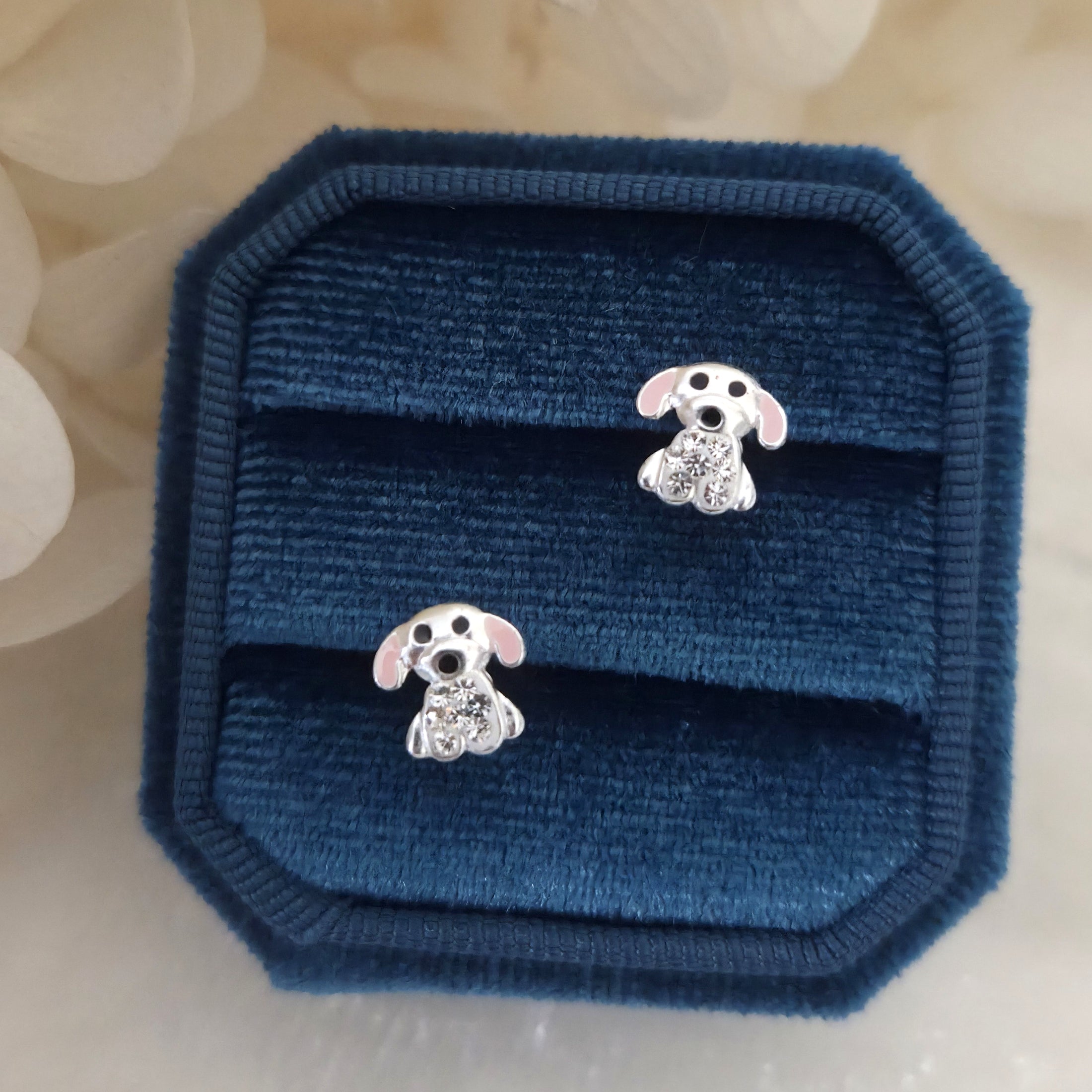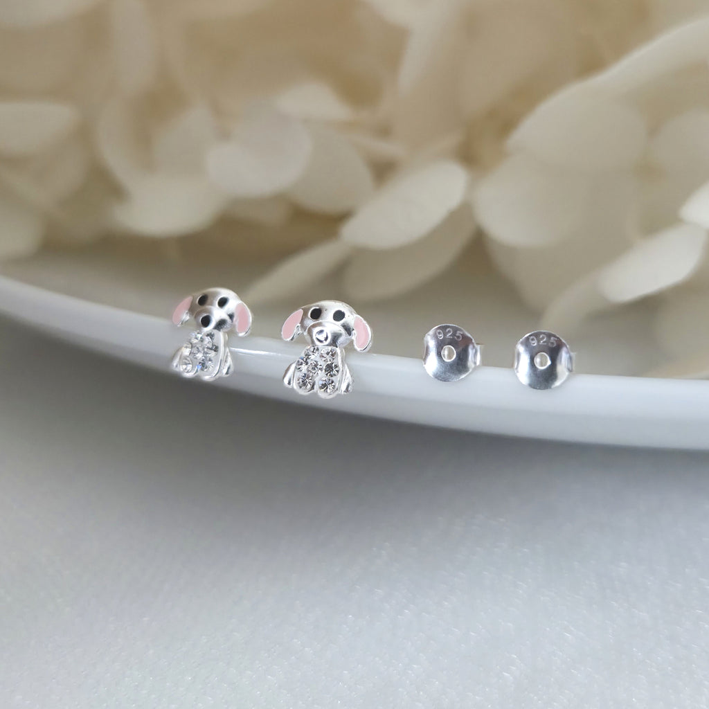 Adorable puppy stud earrings in 925 sterling silver, featuring pink enamel ears and sparkling crystal accents. Perfect for dog lovers of all ages.