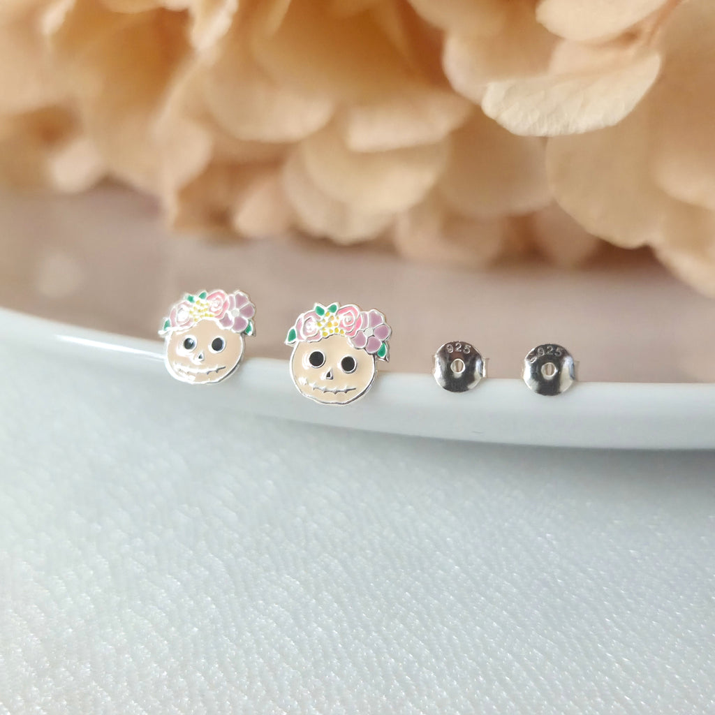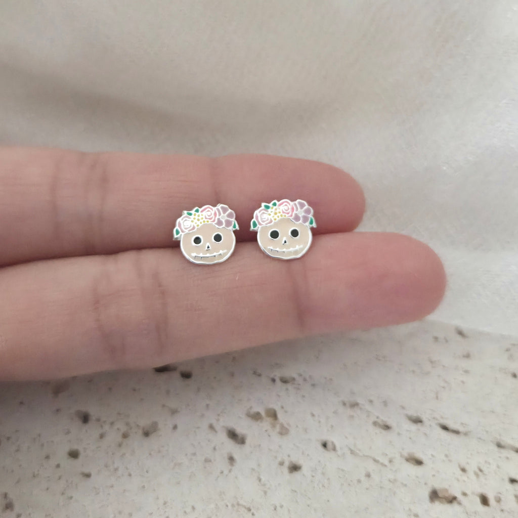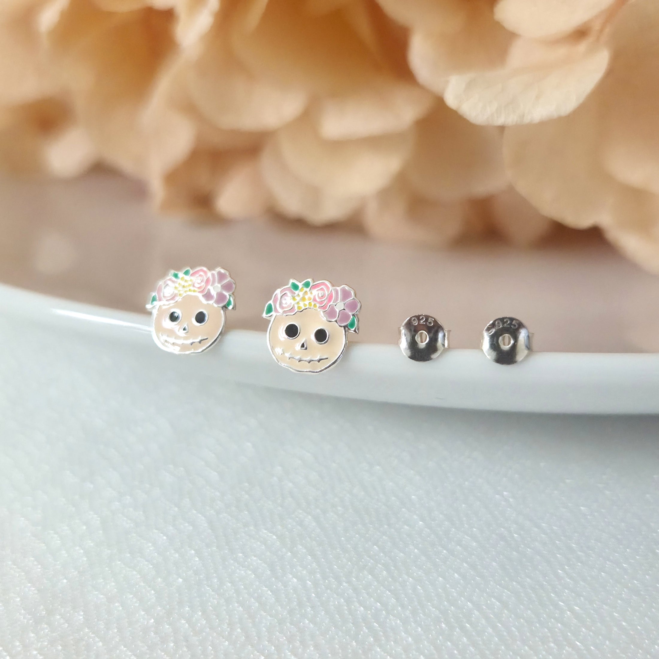Flower Skull Stud Earrings in 925 Sterling Silver – Solid Silver Halloween Studs with Enamel