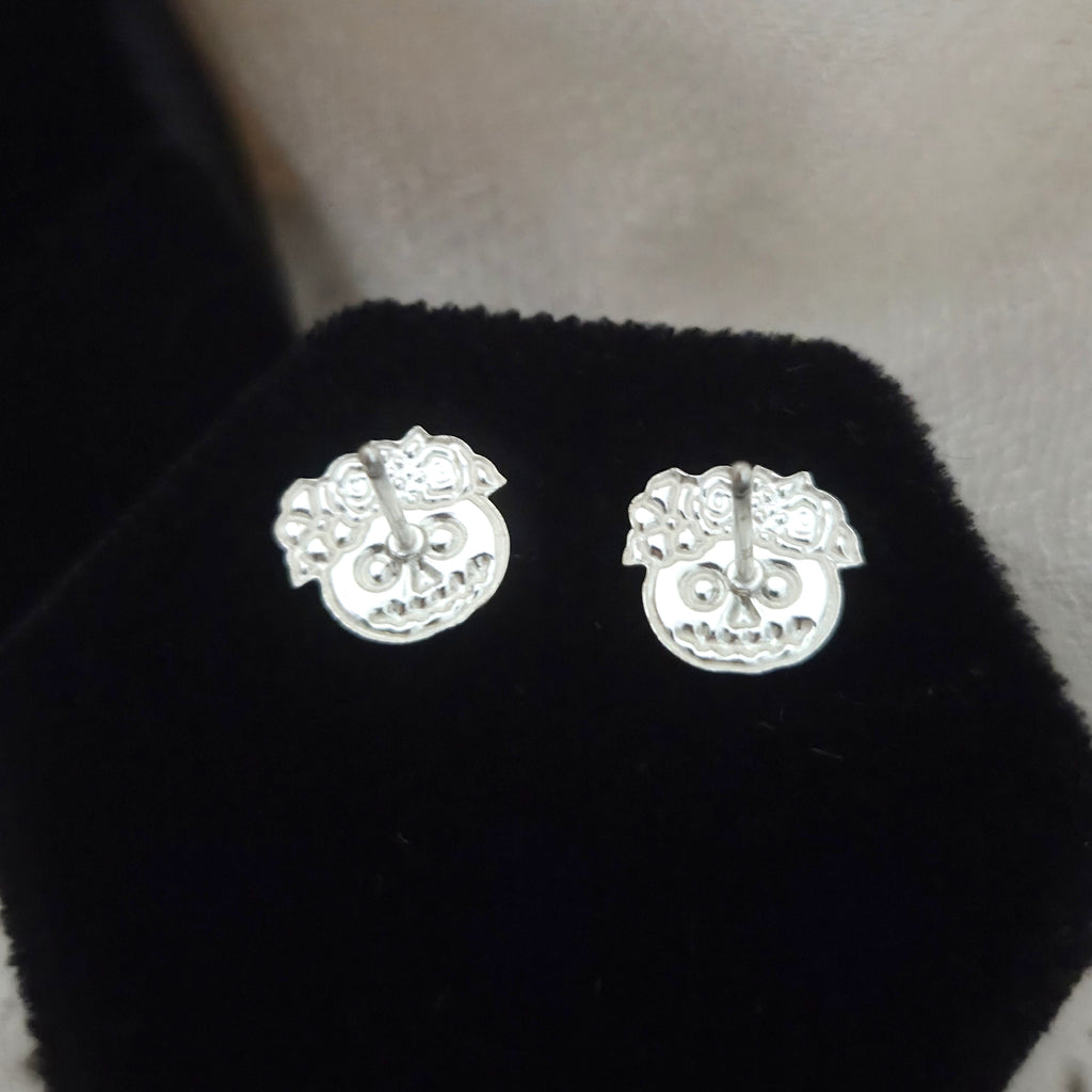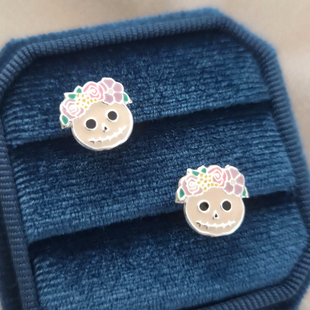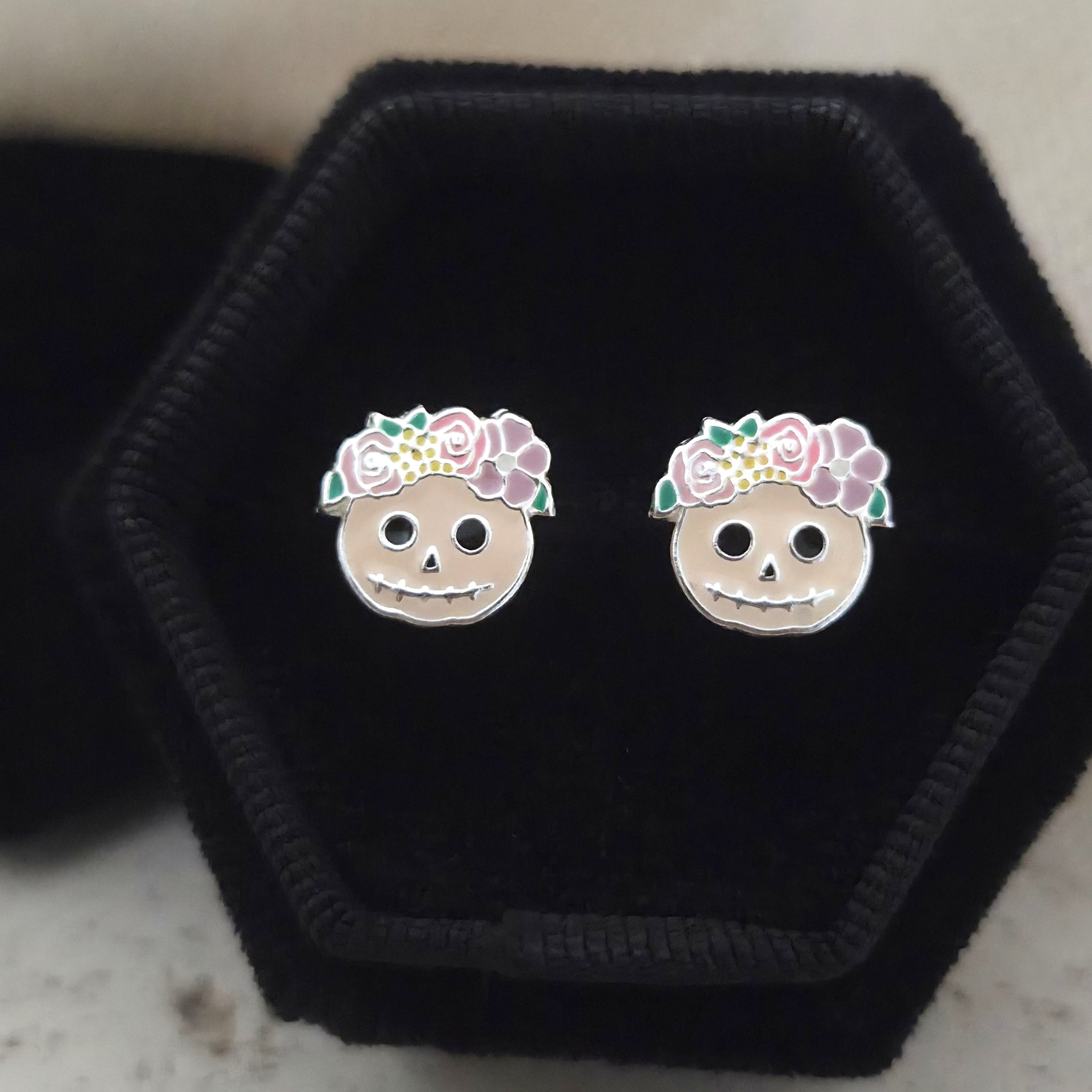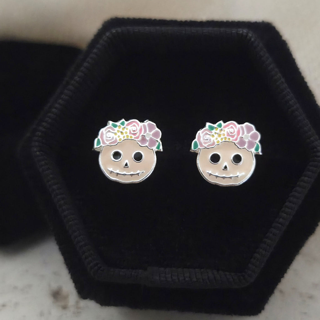 Flower Skull Stud Earrings in 925 Sterling Silver – Solid Silver Halloween Studs with Enamel