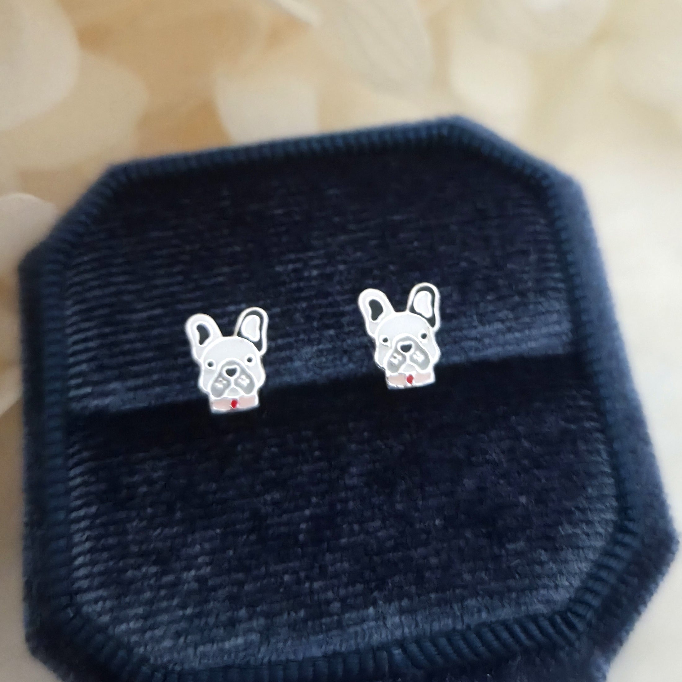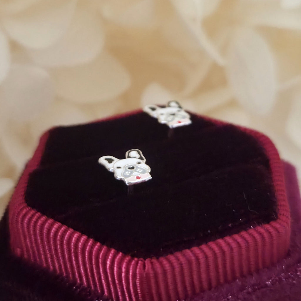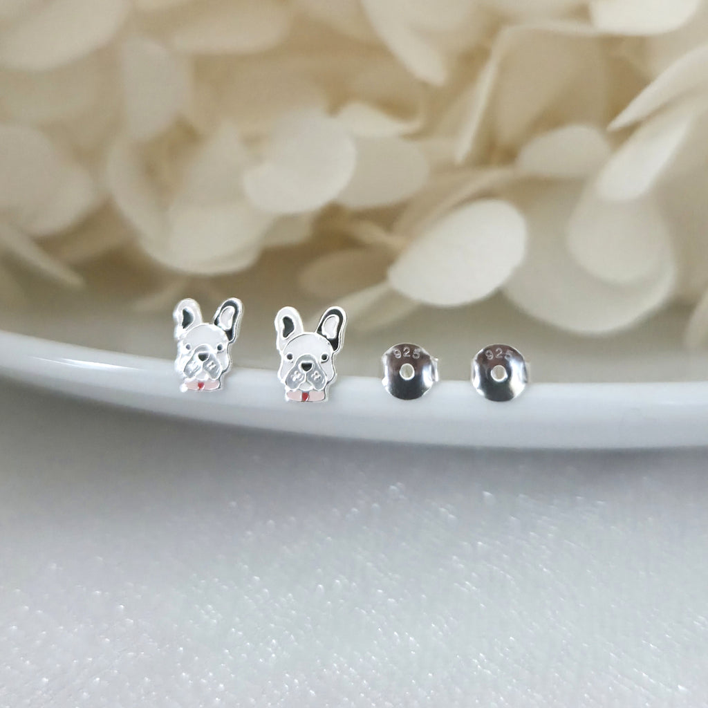 French Bulldog Stud Earrings in 925 Sterling Silver – Solid Silver Black & White Bulldog Studs with Enamel – Cute Pet Lover Jewelry