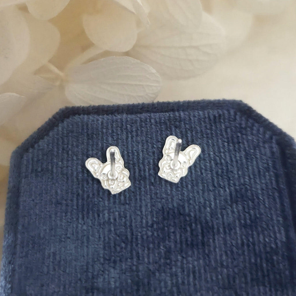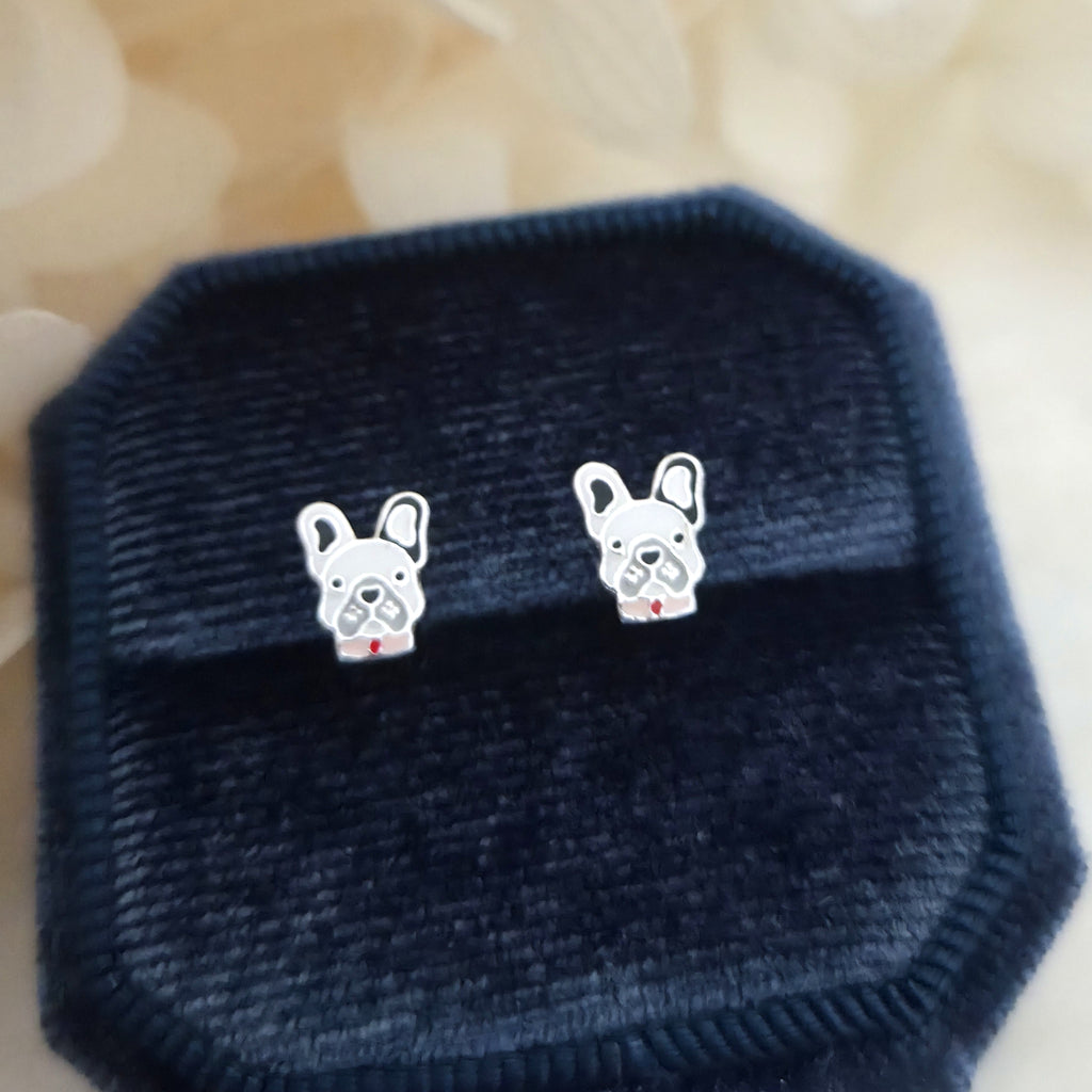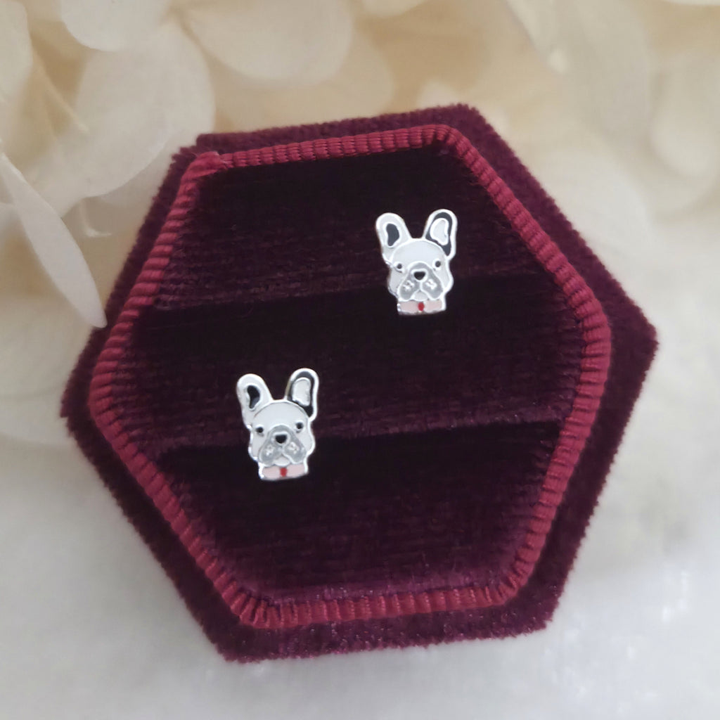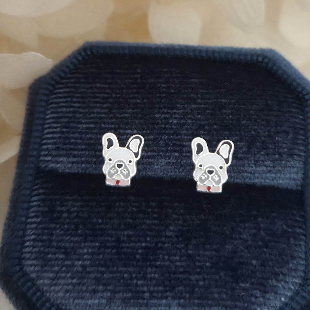 French bulldog stud earrings in solid 925 sterling silver, detailed with black and white enamel. A playful and stylish gift for dog lovers.