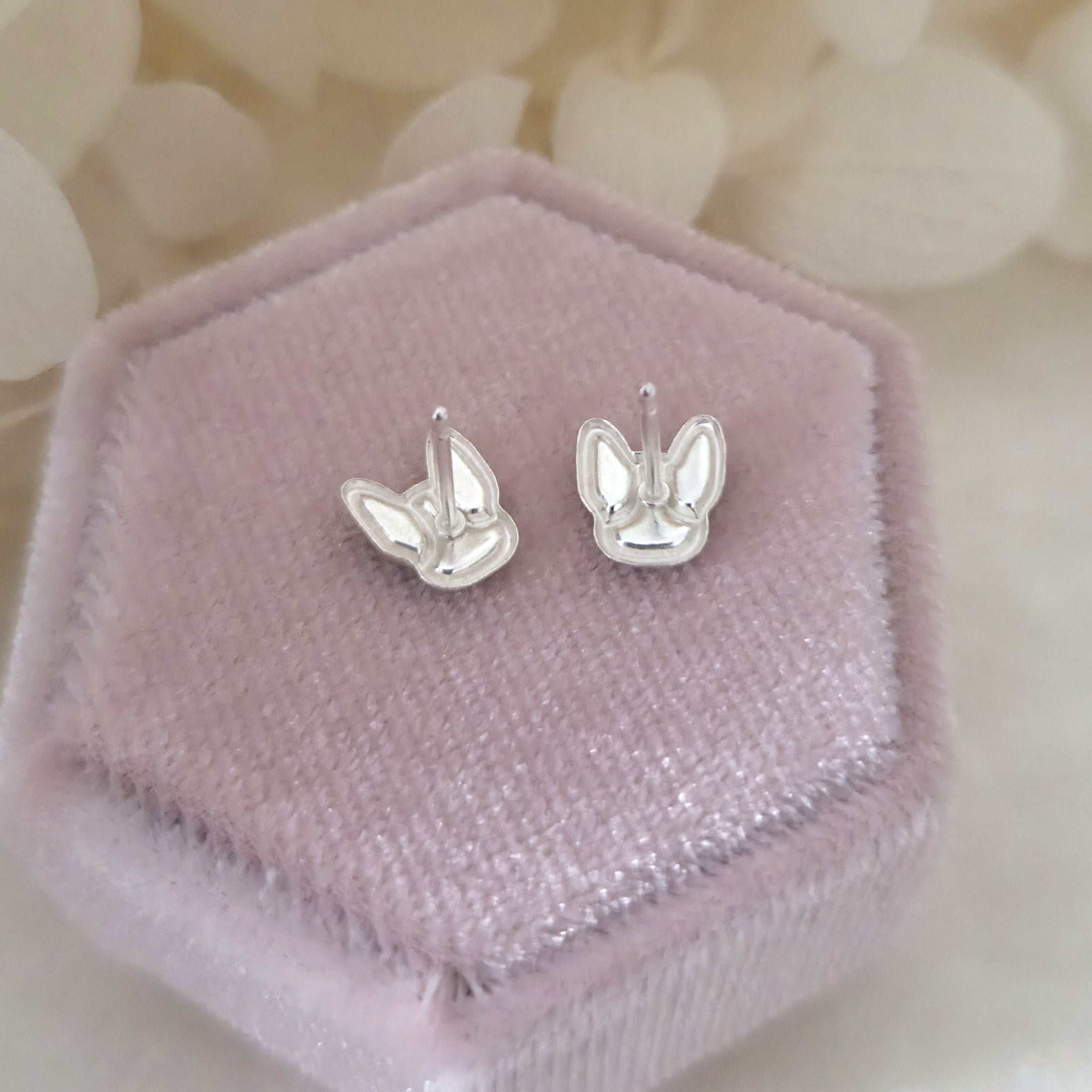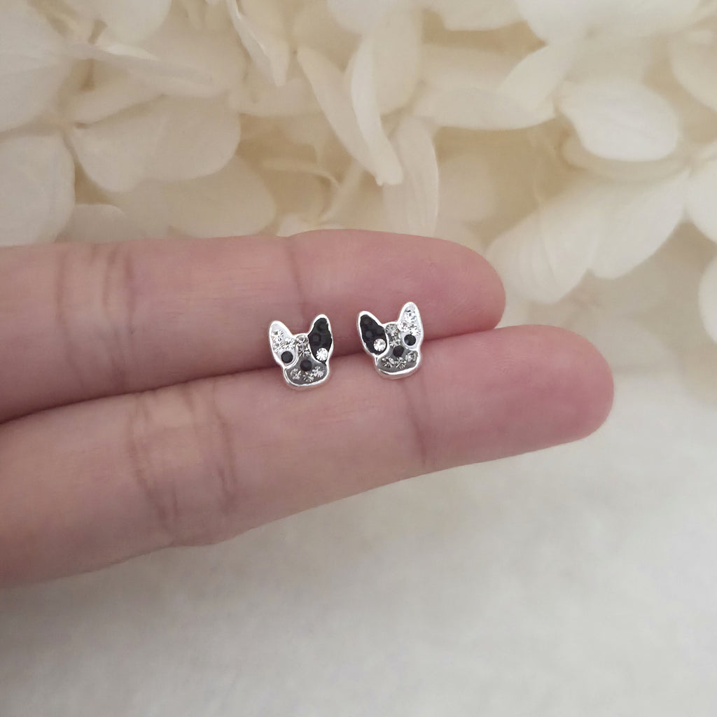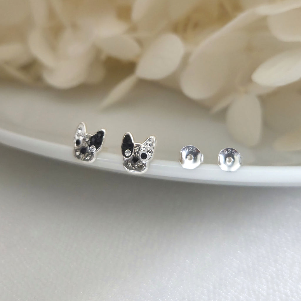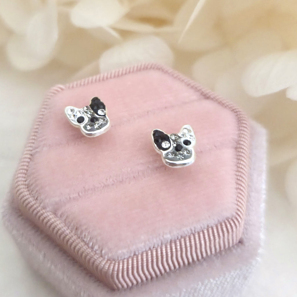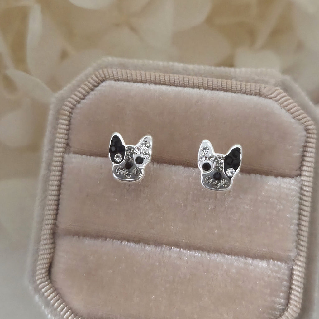 Charming French Bulldog stud earrings crafted in 925 sterling silver, featuring black and white enamel with sparkling crystal details. Perfect for dog lovers.