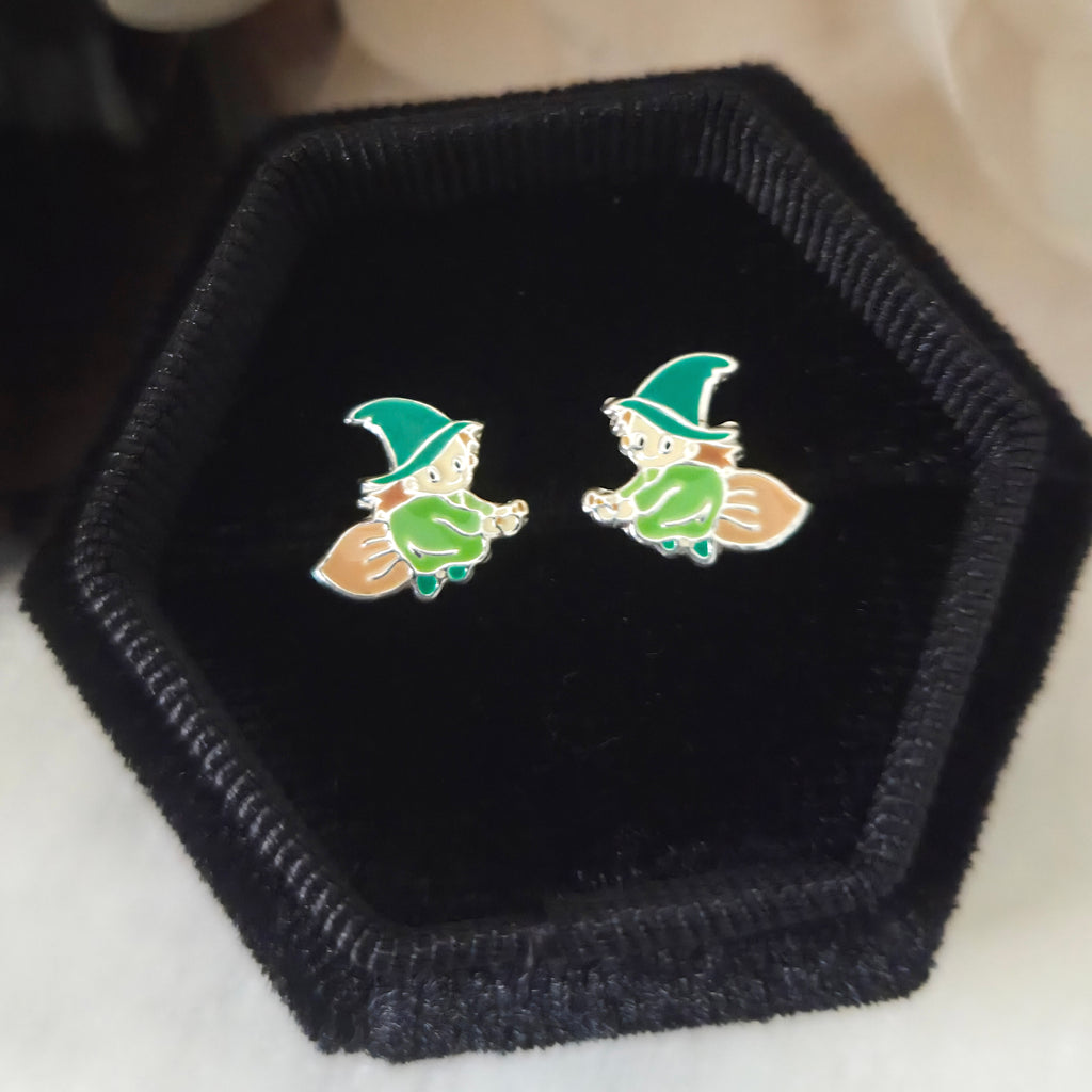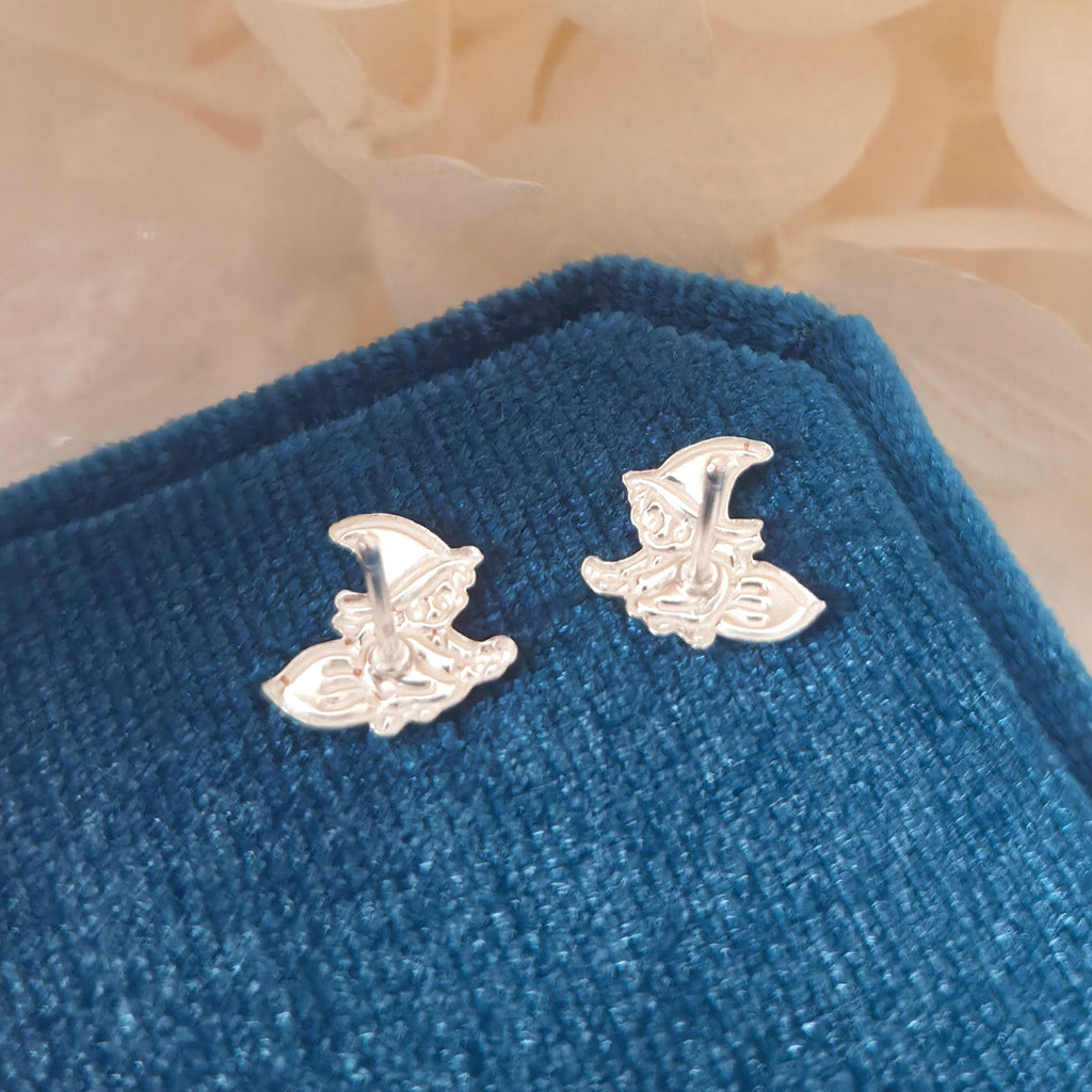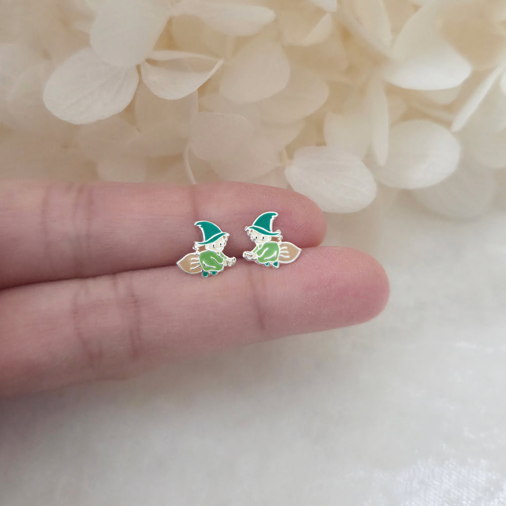 Green Witch on Broom Stud Earrings in 925 Sterling Silver – Solid Silver Halloween Studs
