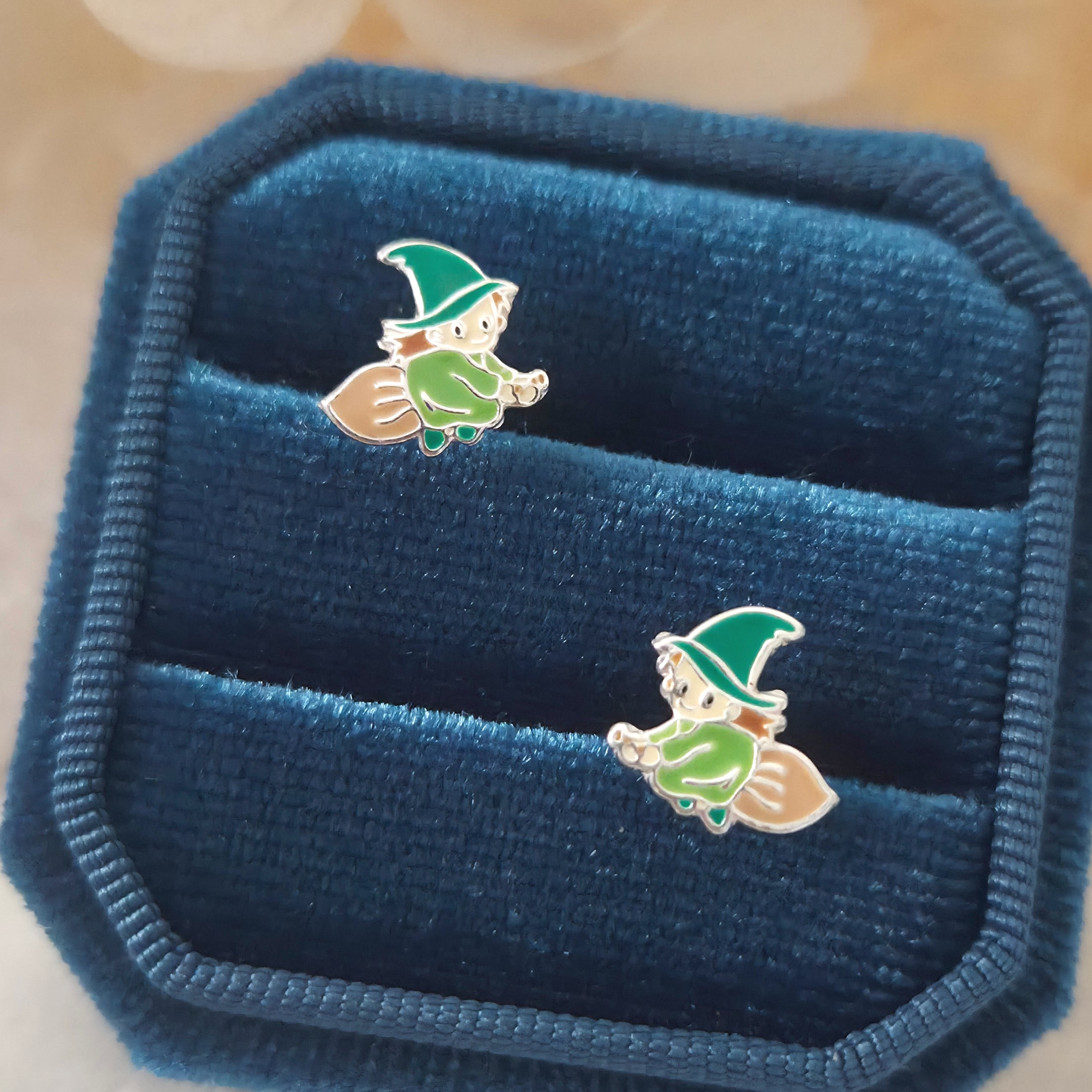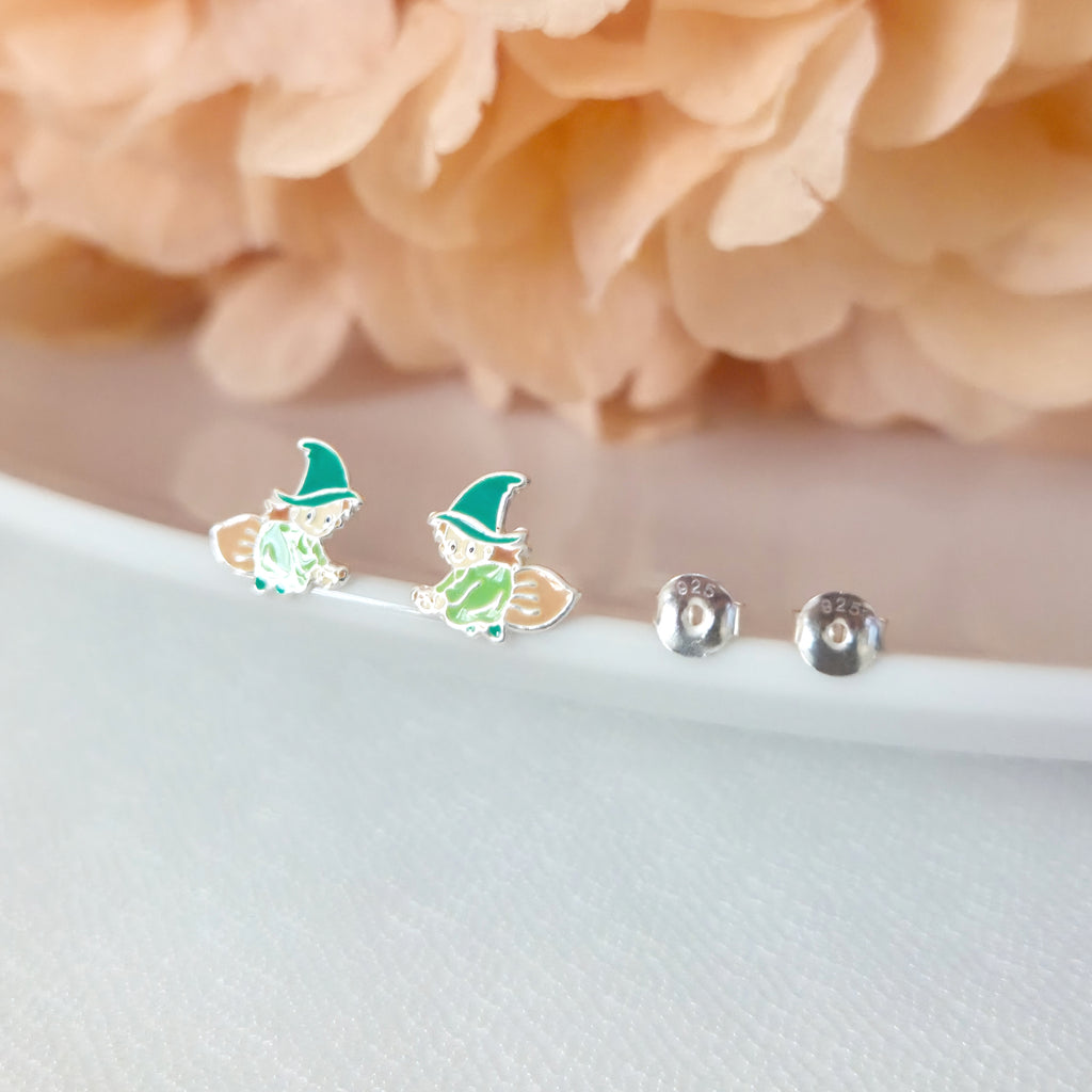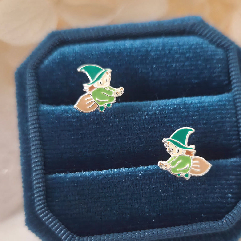 Green Witch on Broom Stud Earrings in 925 Sterling Silver – Solid Silver Halloween Studs