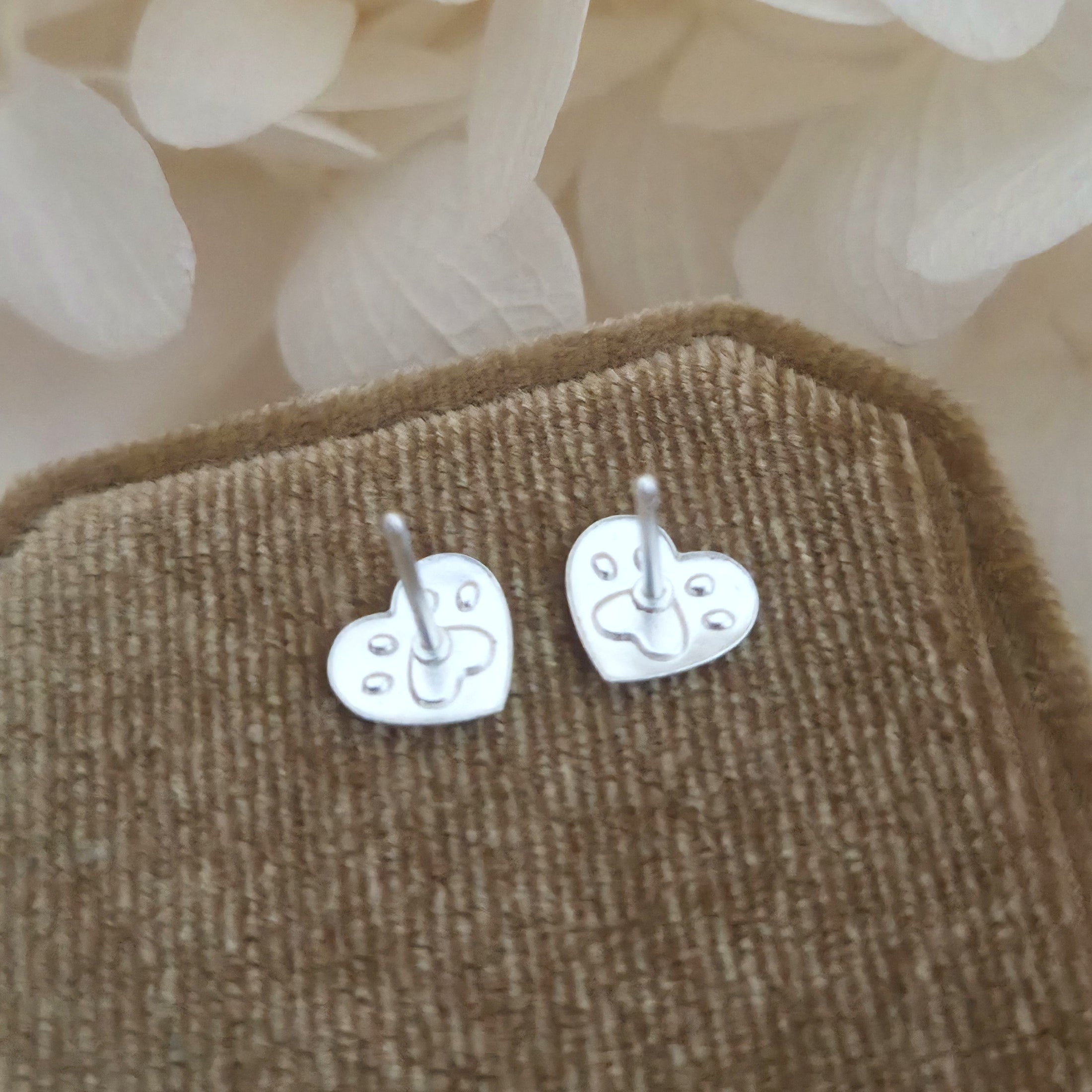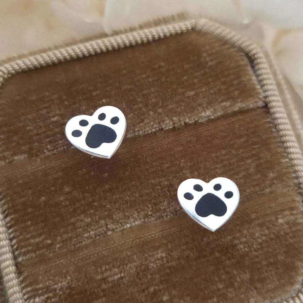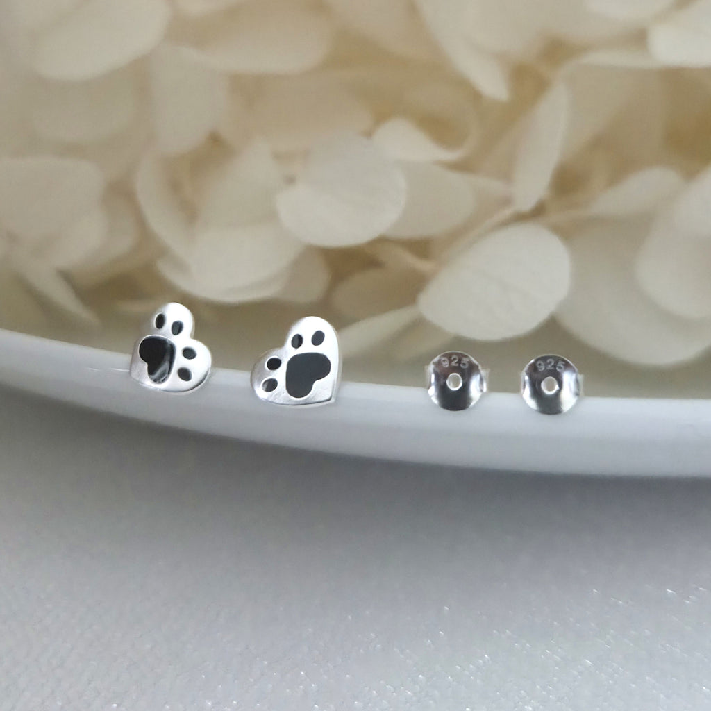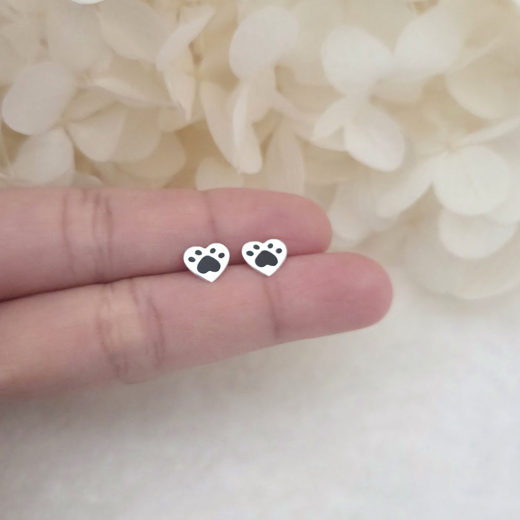 Heart-shaped stud earrings in solid 925 sterling silver, featuring black enamel paw prints. A minimalist and charming gift for dog or cat lovers.