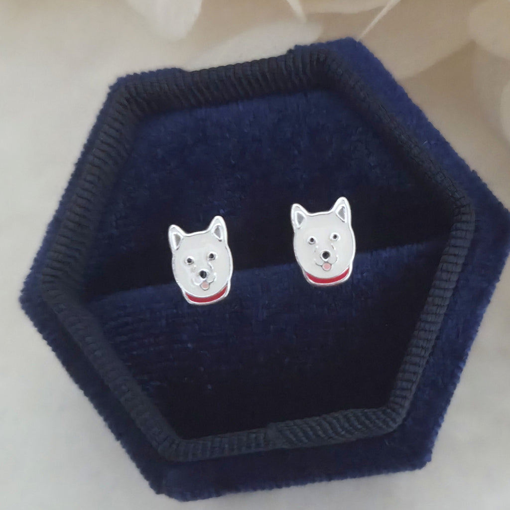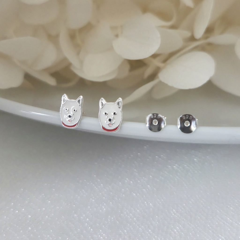 Husky Dog Stud Earrings in 925 Sterling Silver – Solid Silver White Puppy Studs with Enamel – Cute Pet Lover Jewelry Gift